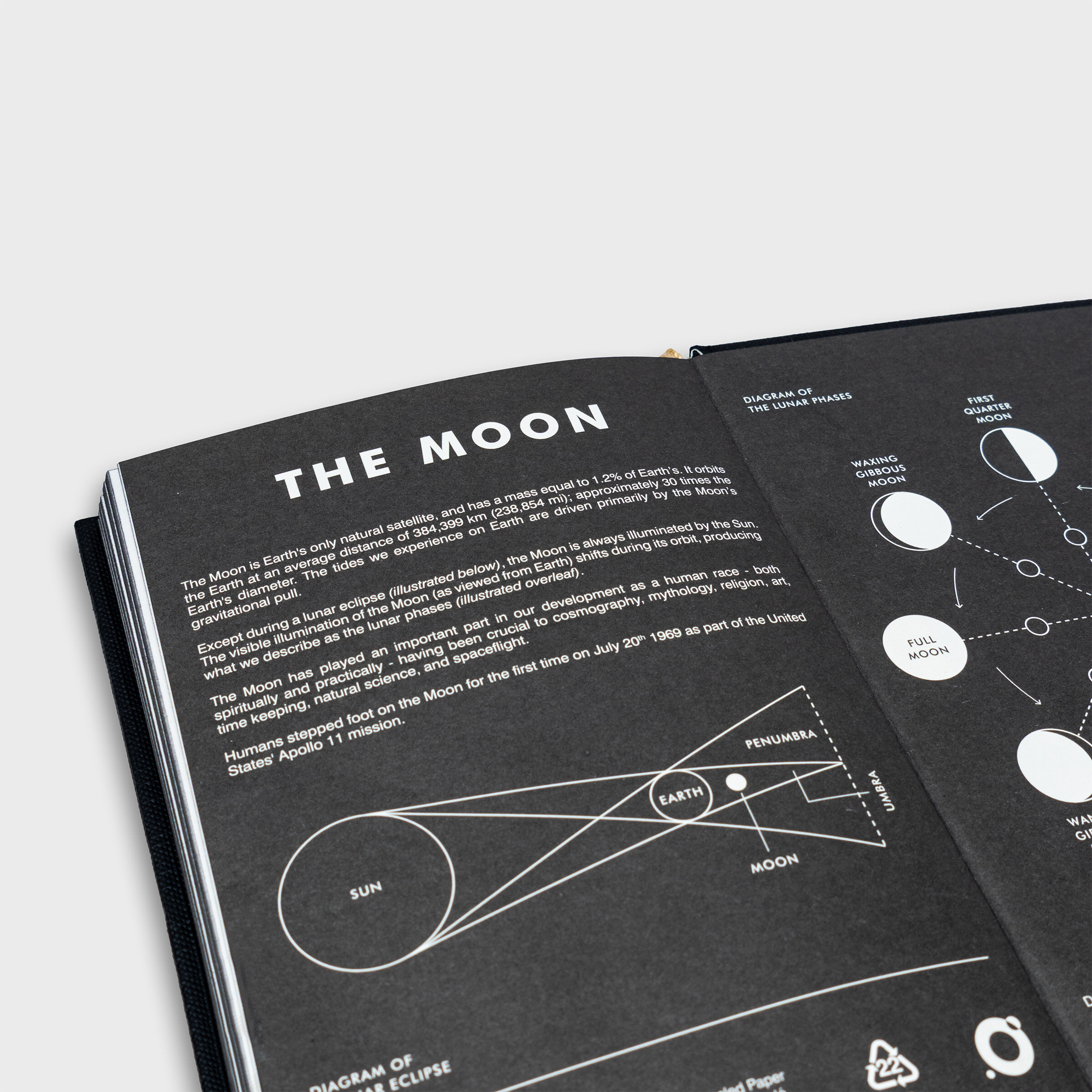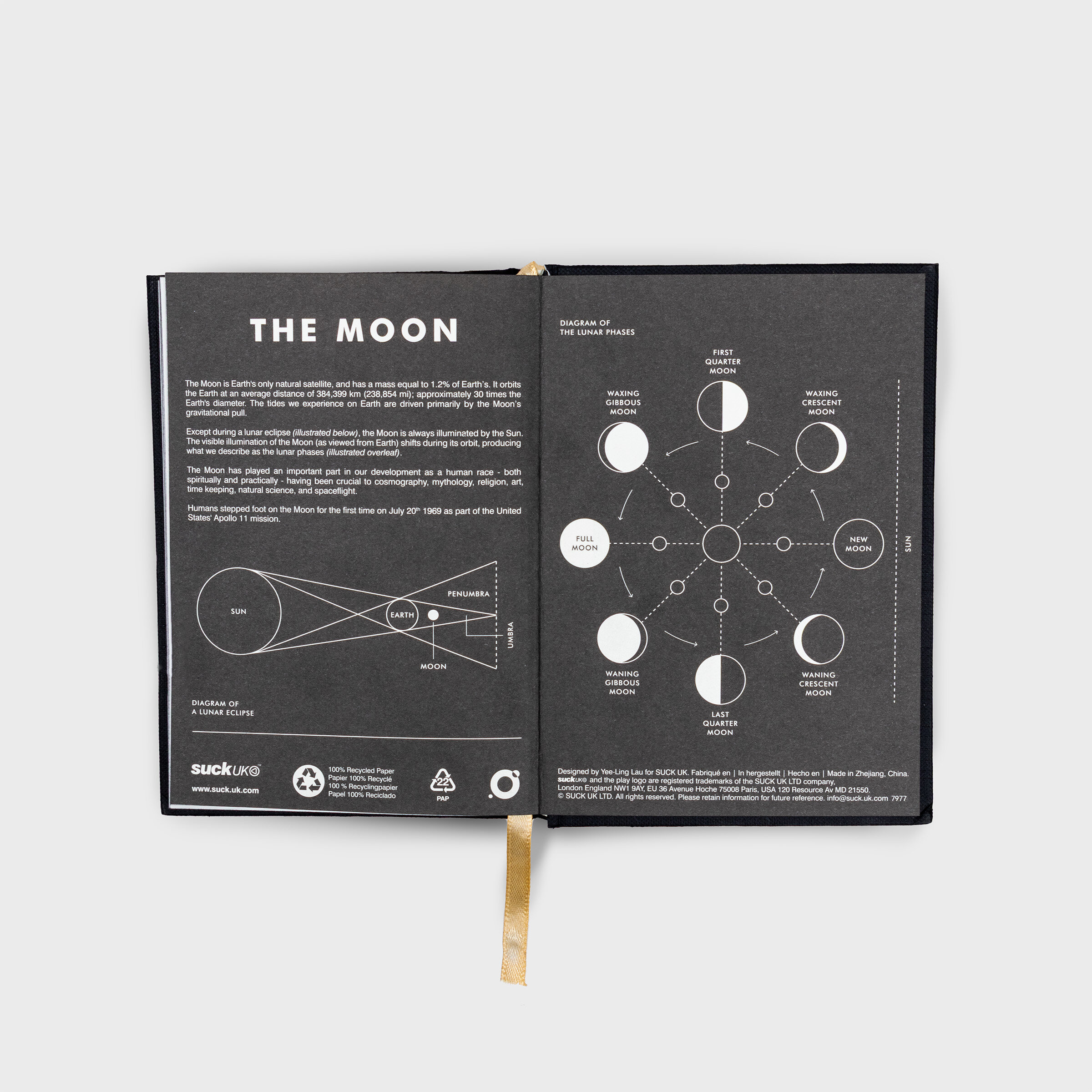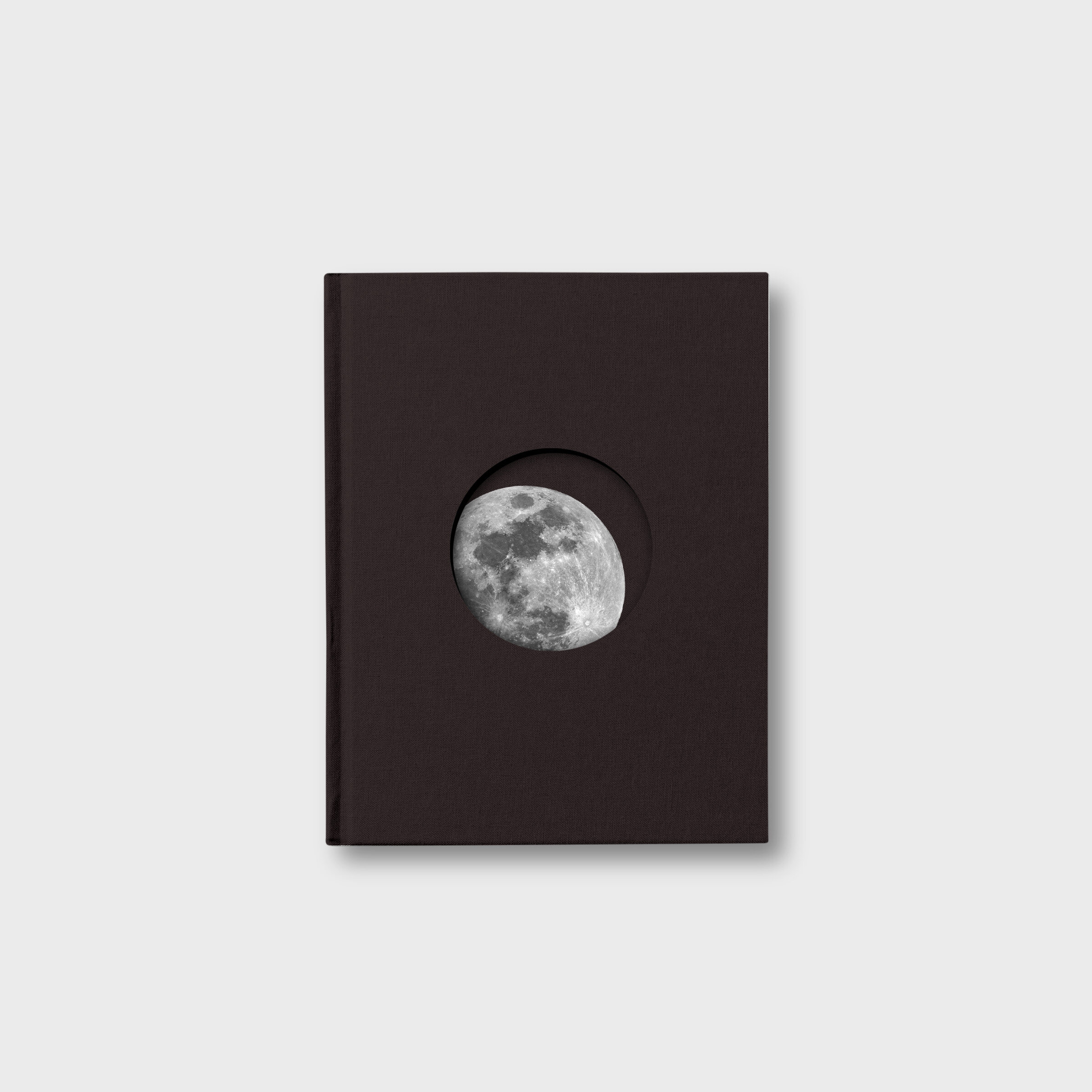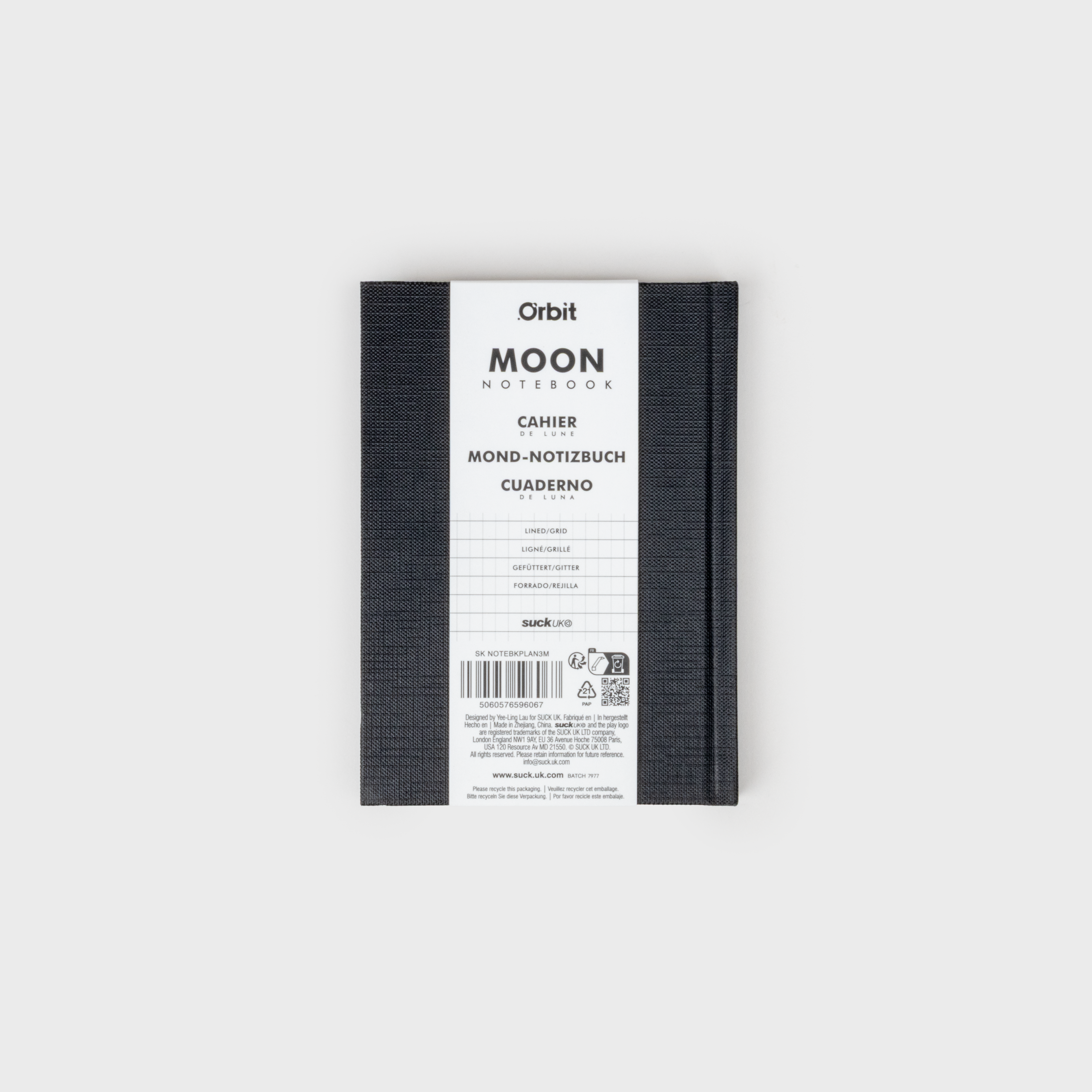 A6 Anteckningsbok med inbunden pärm. 192 rutnätslinjerade sidor. Helt återvunnet papper. Plastfri produkt och förpackning. Enkel, svart, inbunden anteckningsbok med hål i omslaget som avslöjar en ikonisk bild av jordens måne. Det är som att titta in genom ett fönster i natthimlen. Designad och tillverkad av Suck UK