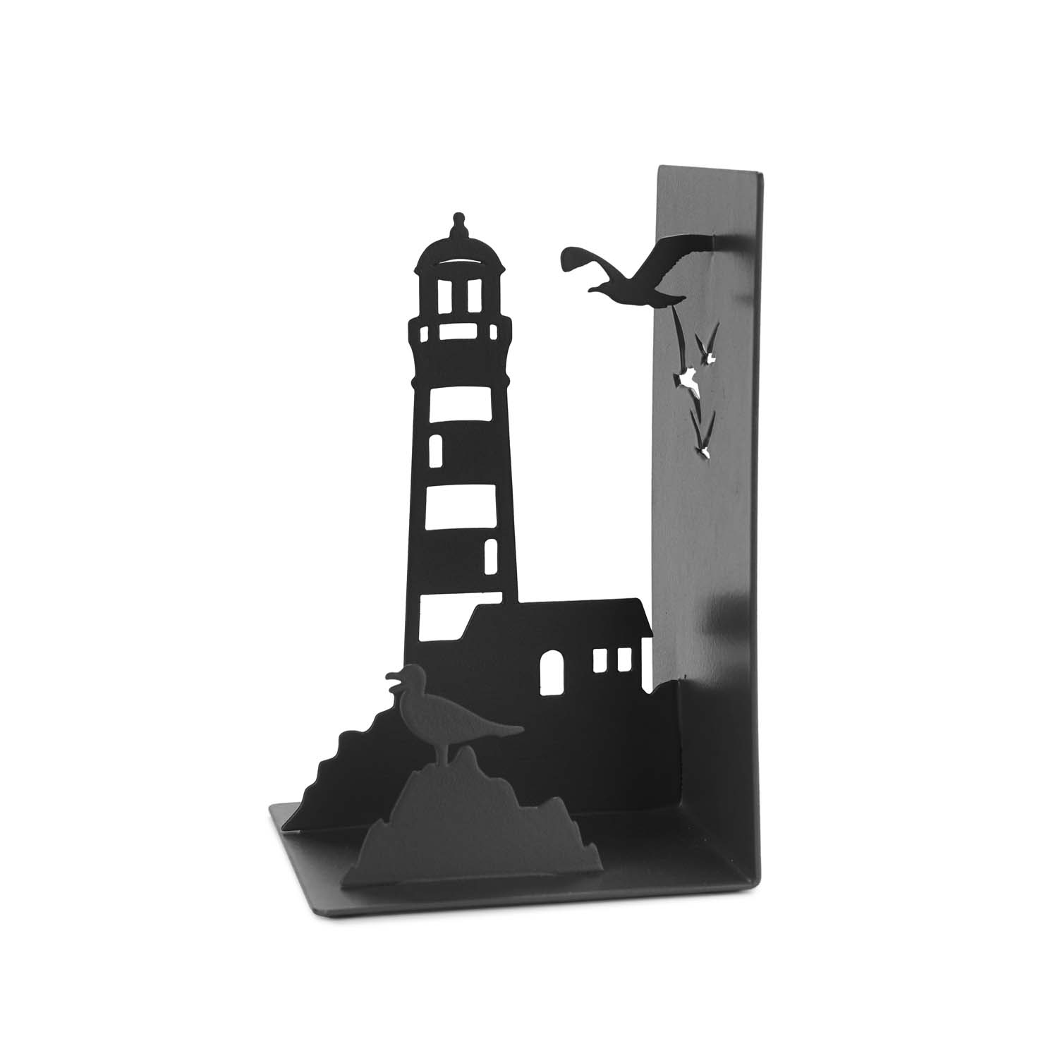 Bookend Lighthouse ger en klassisk utsikt över kusten: fyr och måsar Tillverkad av metall för extra styrka.