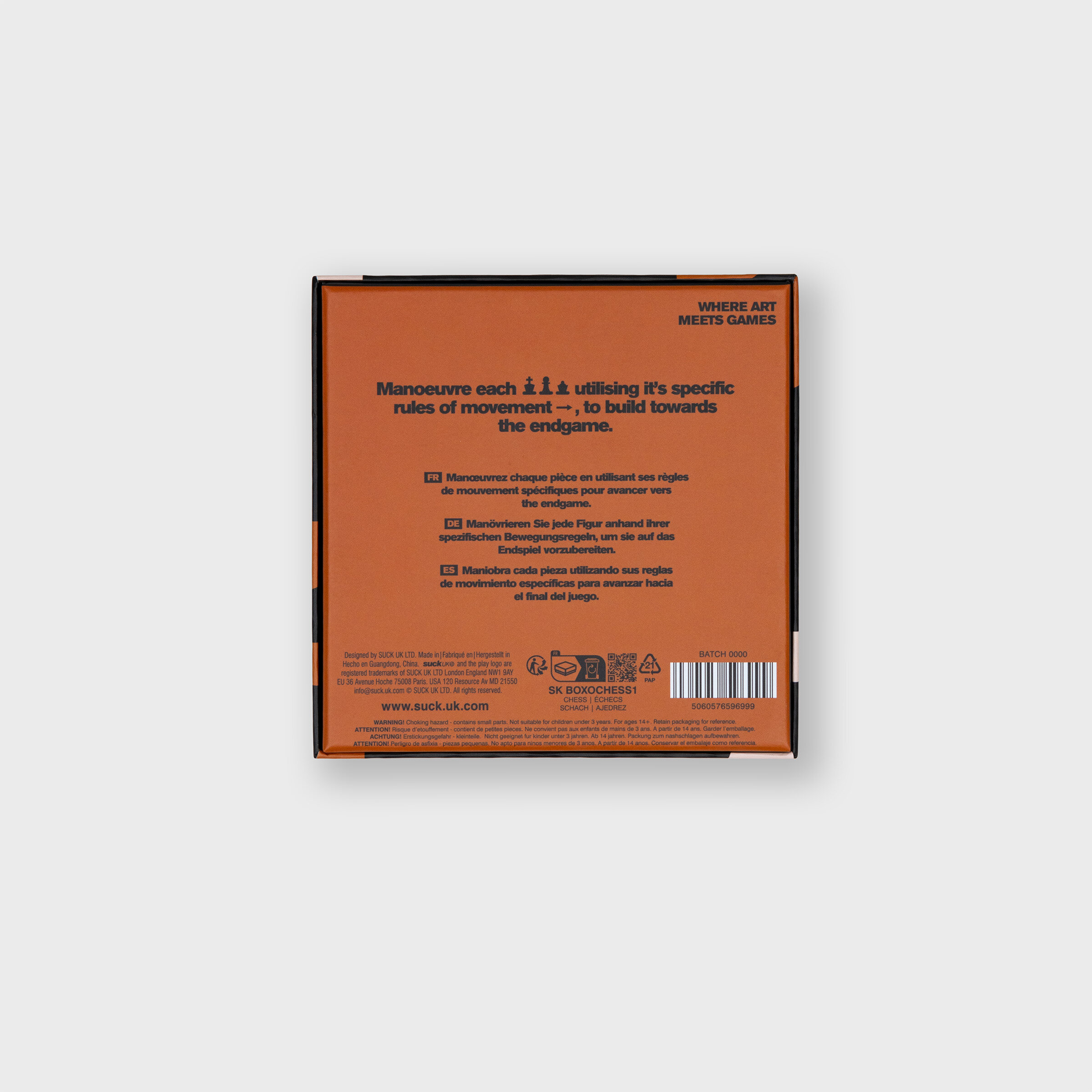 Manövrera varje pjäs och använd dess specifika rörelseregler för att bygga upp slutspelet.Designad och tillverkad av Suck UK