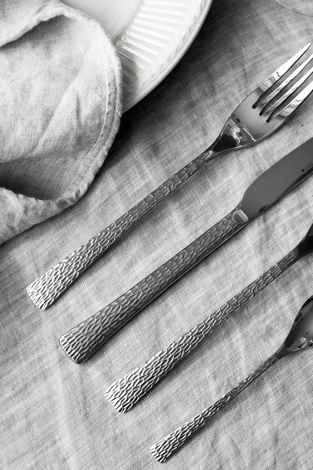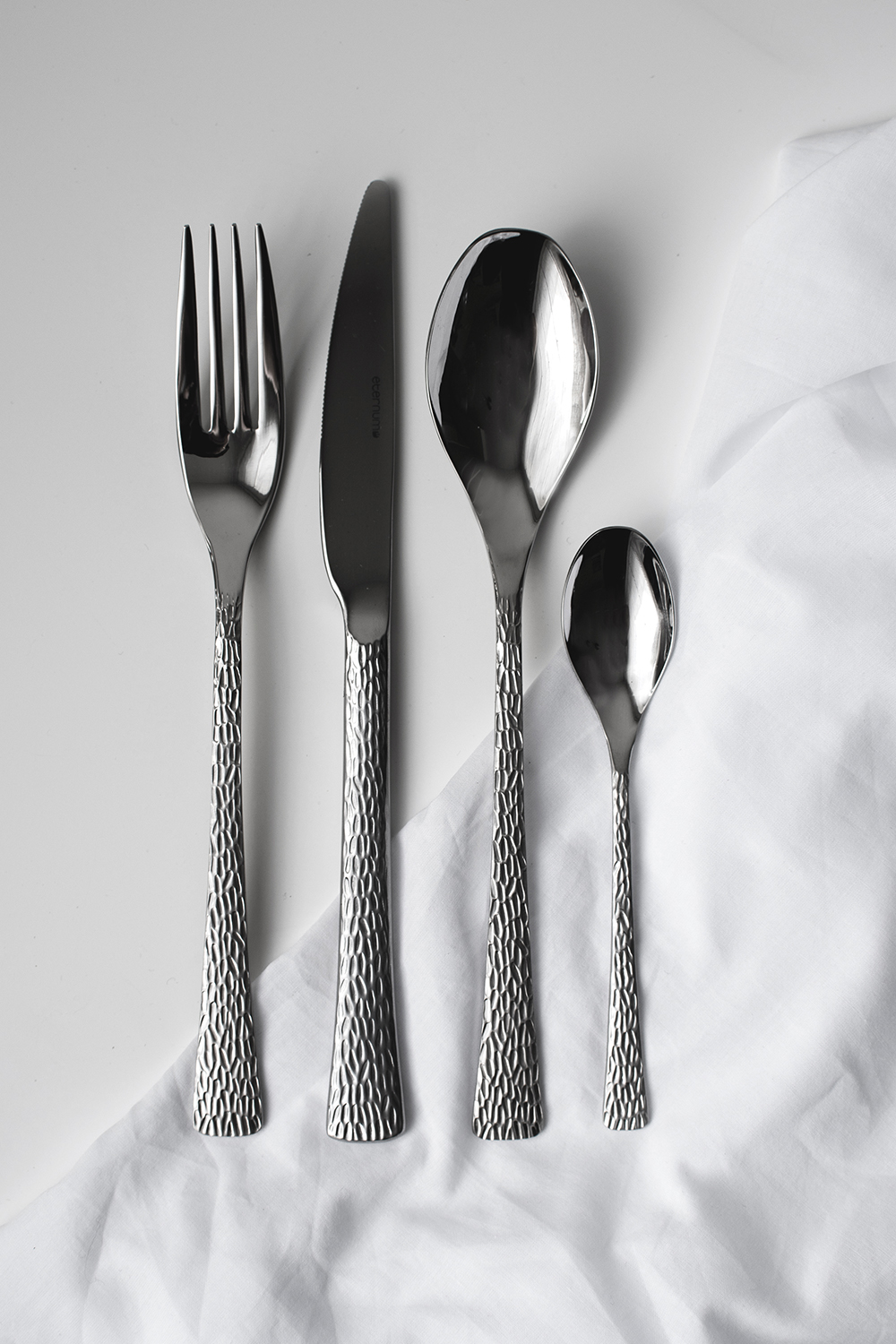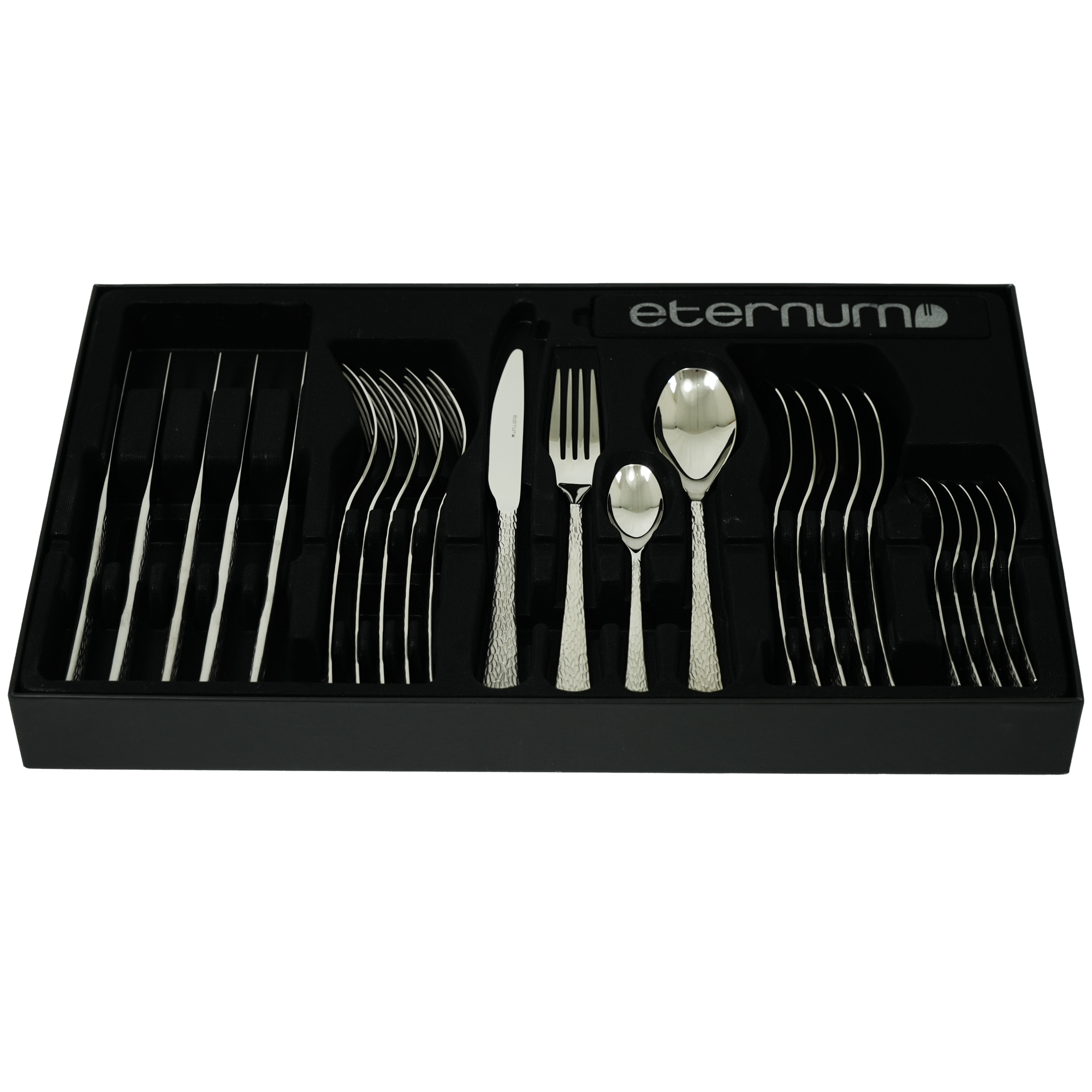 Elegant tidlös bestickserie från Eternum i 18/10-stål. Handtaget är sandpolerat med en bearbetad yta. I paketet ingår sex vardera av gaffel, kniv, matsked och tesked