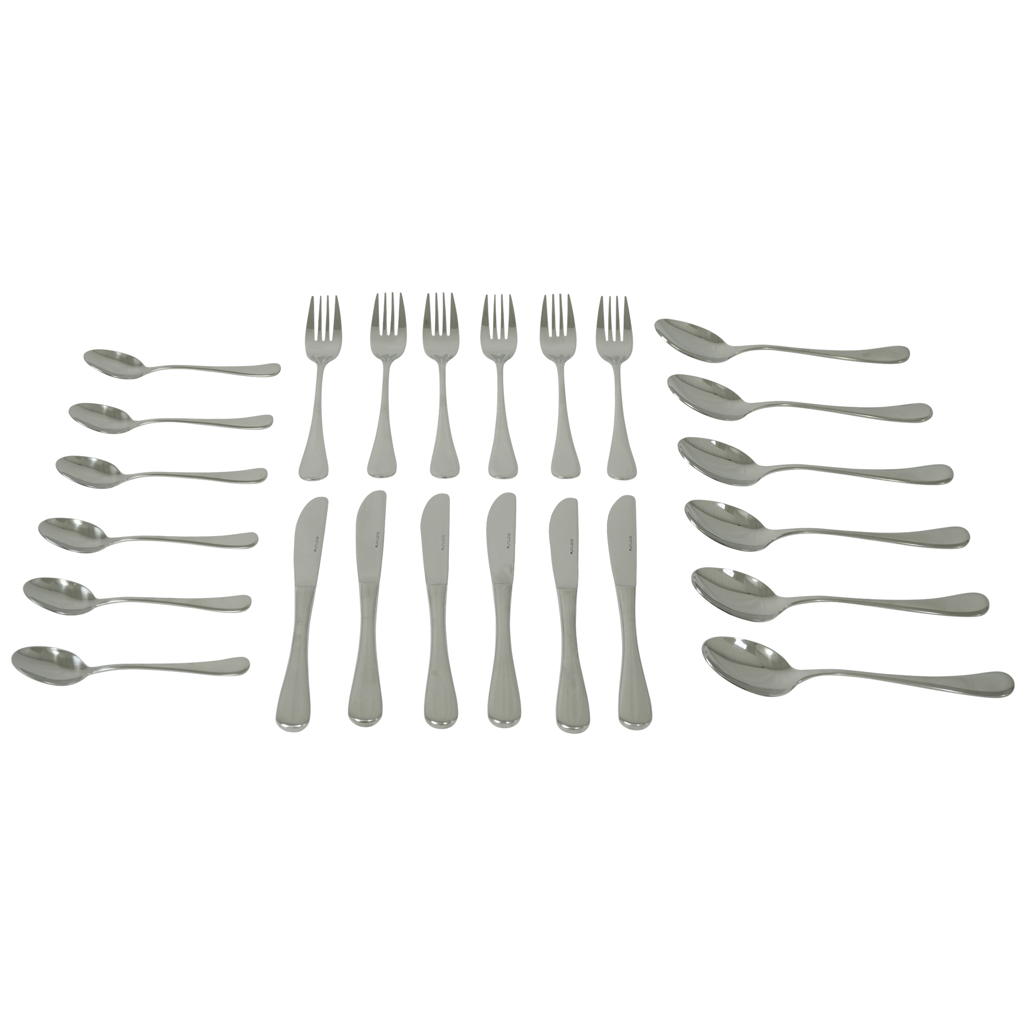 Rivoli är en modern serie från klassiska Eternum. Besticken är i högblankt rostfritt stål, 18/10 med tjocklek 2,5 mm. I paketet ingår sex stycken vardera av gaffel, kniv, matsked och tesked.