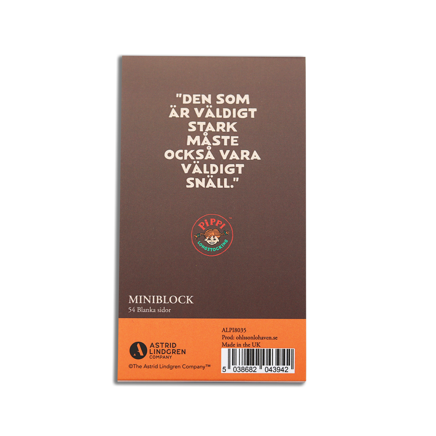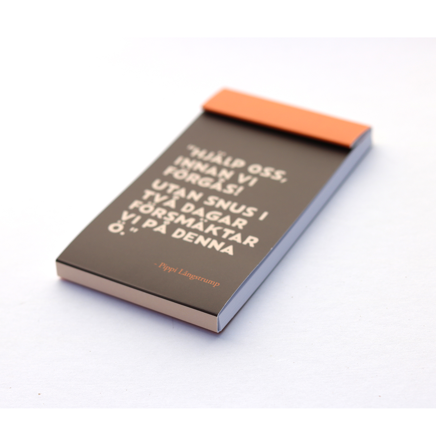 Praktiskt miniblock med ed ett av Pippi Långstrumps mest klasiska citat. "Utan snus" . Blocket är förslutningsbart . Storlek 120 x 65 mm. Motivetåterfinns också på magneter och bokmärke. En rolig present till snusaren .