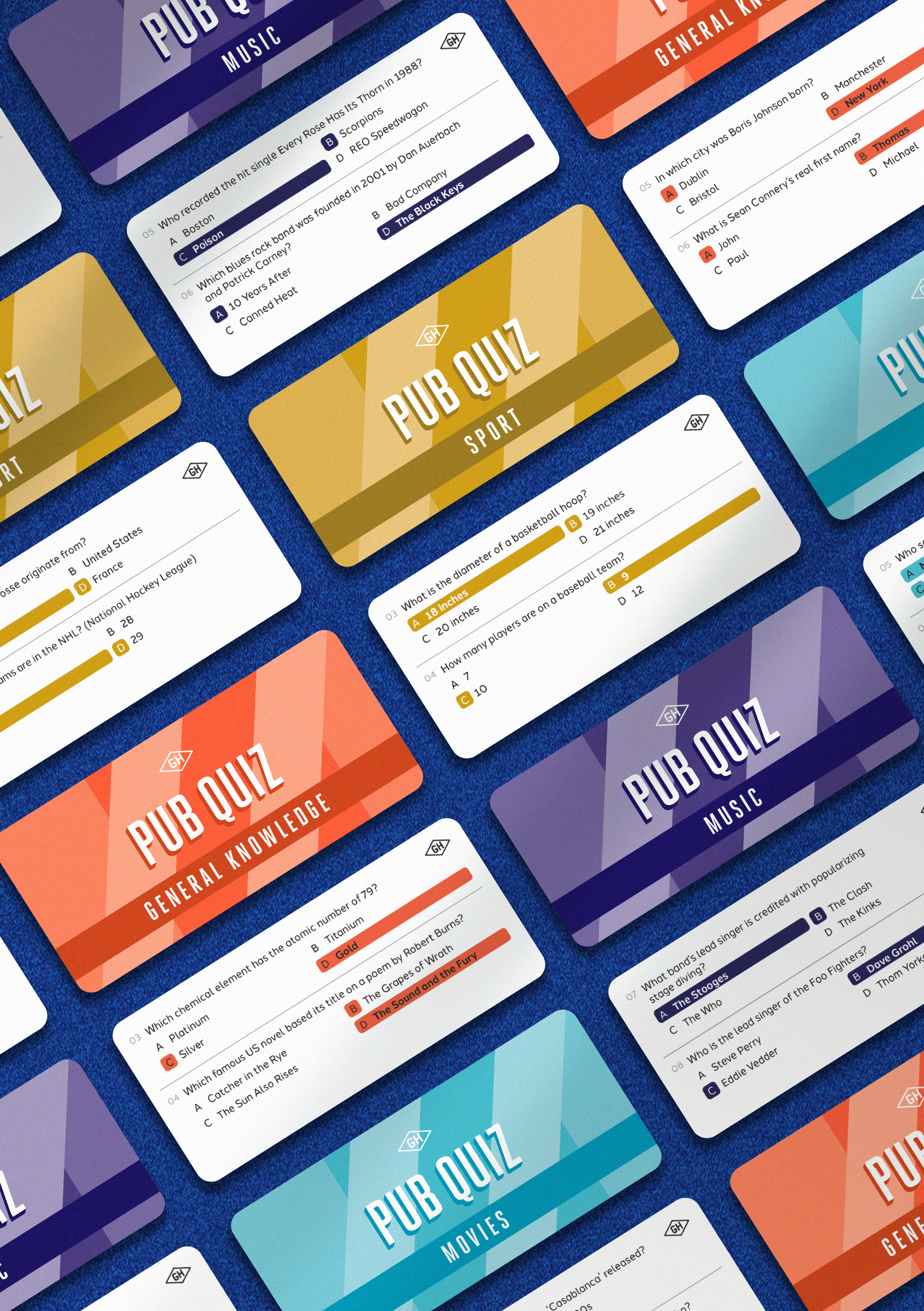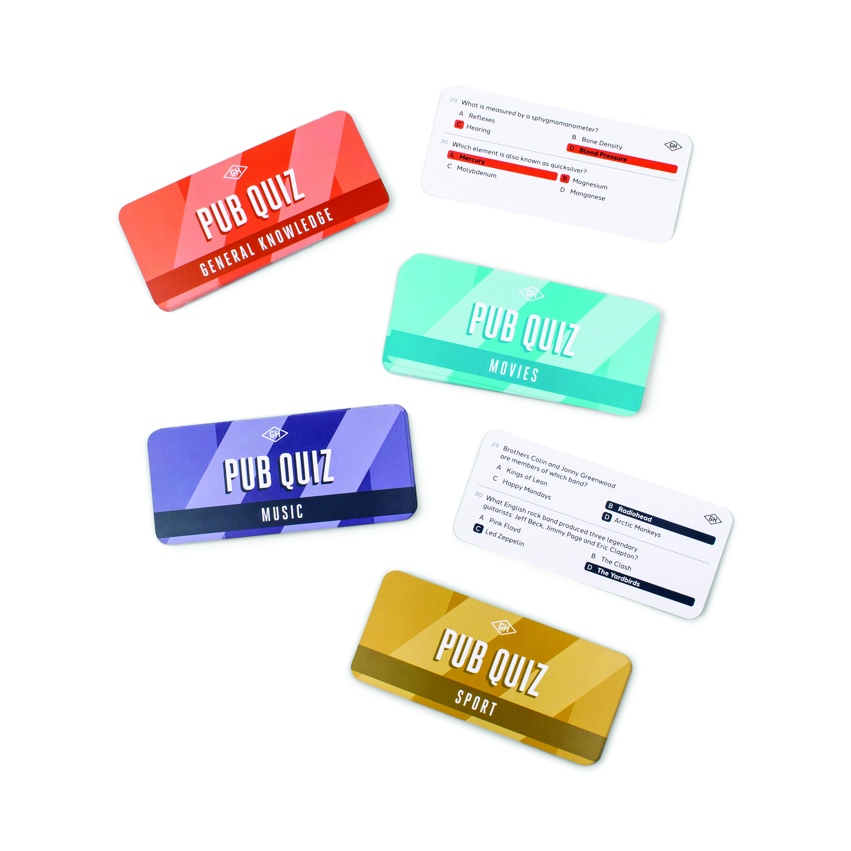 Testa dina kunskaper med 120 trivia frågor i fyra kategorier: allmänbildning, sport, musik och lm. Detta set innehåller 60 trivia-kort, ett block och en penna – allt du behöver behöver vara värd för din egen pub qui och krön den ultimata trivia-mästaren!