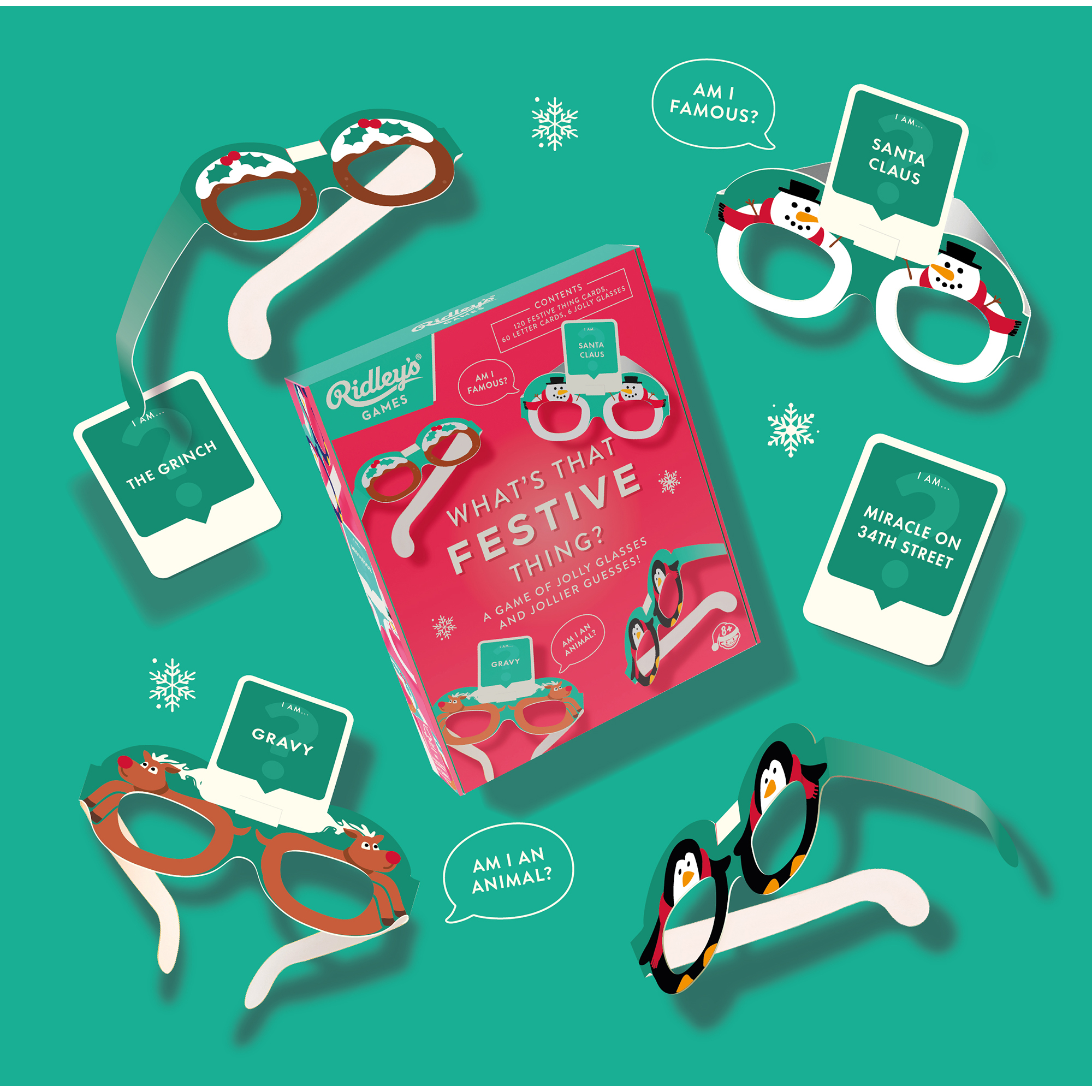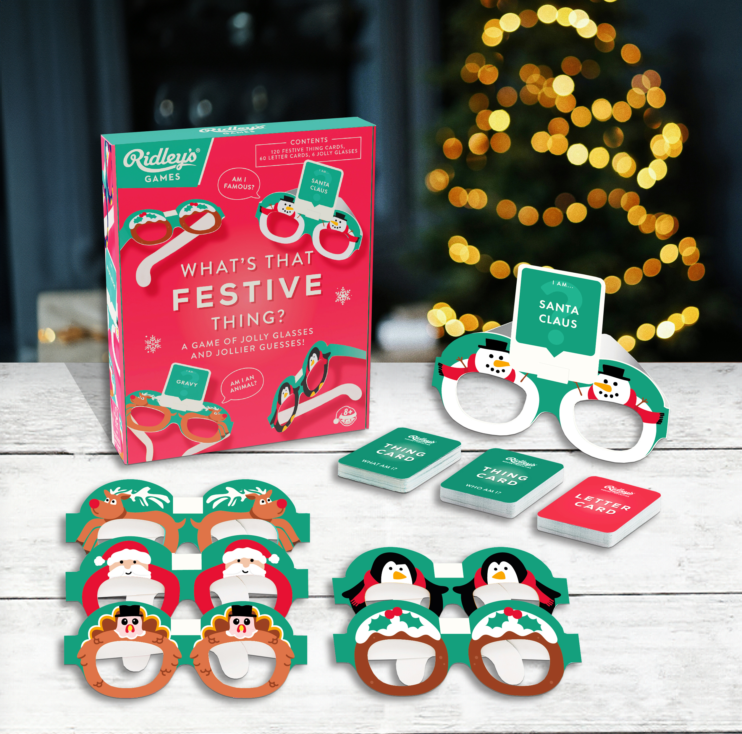 Ge skratt och glädje till familjesammankomster den här julen med What's That Festive Thing? från Ridley's Games! Det här är ett spel med roliga gissningar och ännu roligare glasögon! Om du känner dig mätt efter att ha slukat din julmiddag eller avslutat din Hanukkah-fest är det här det roliga för dig.