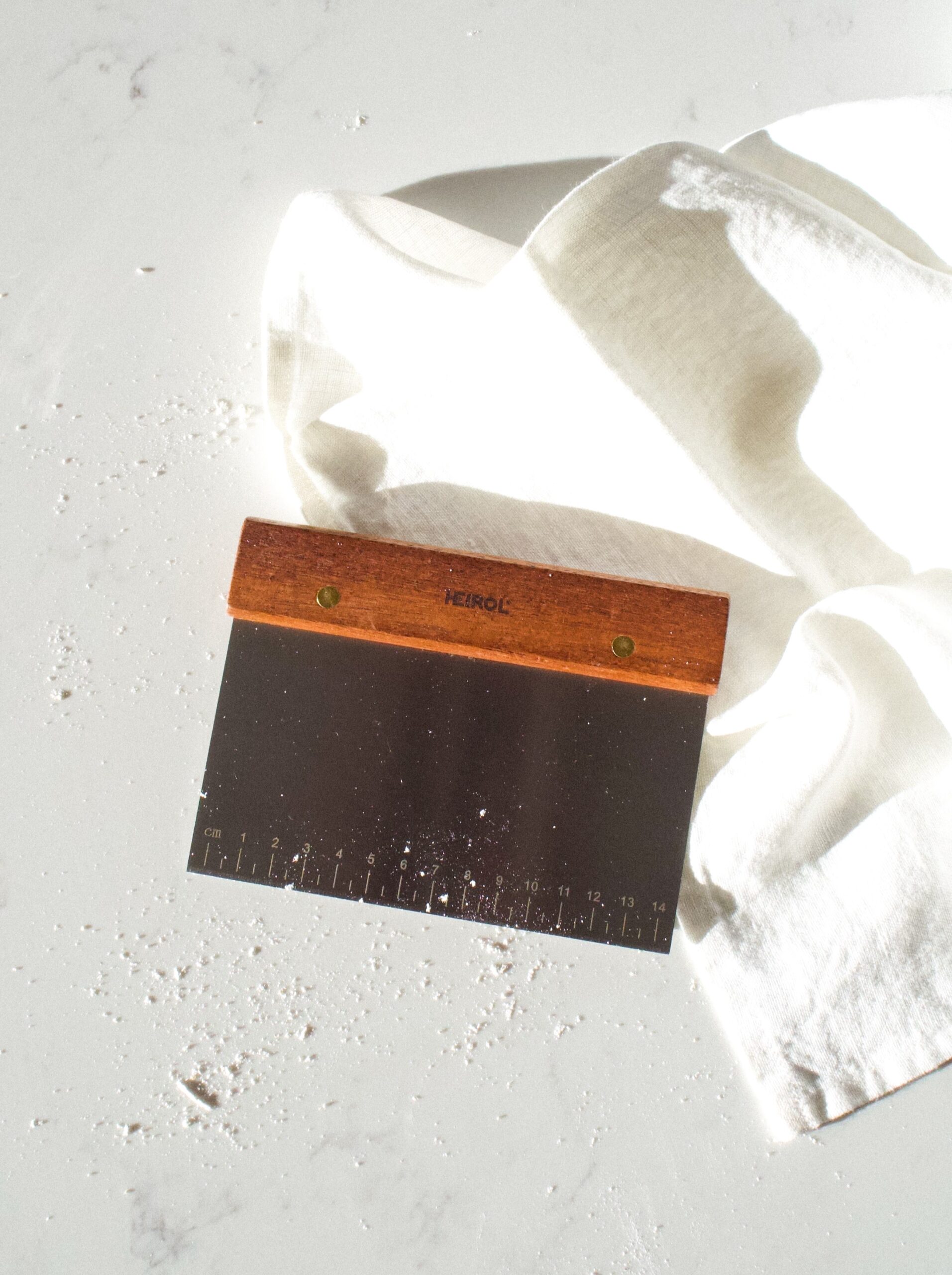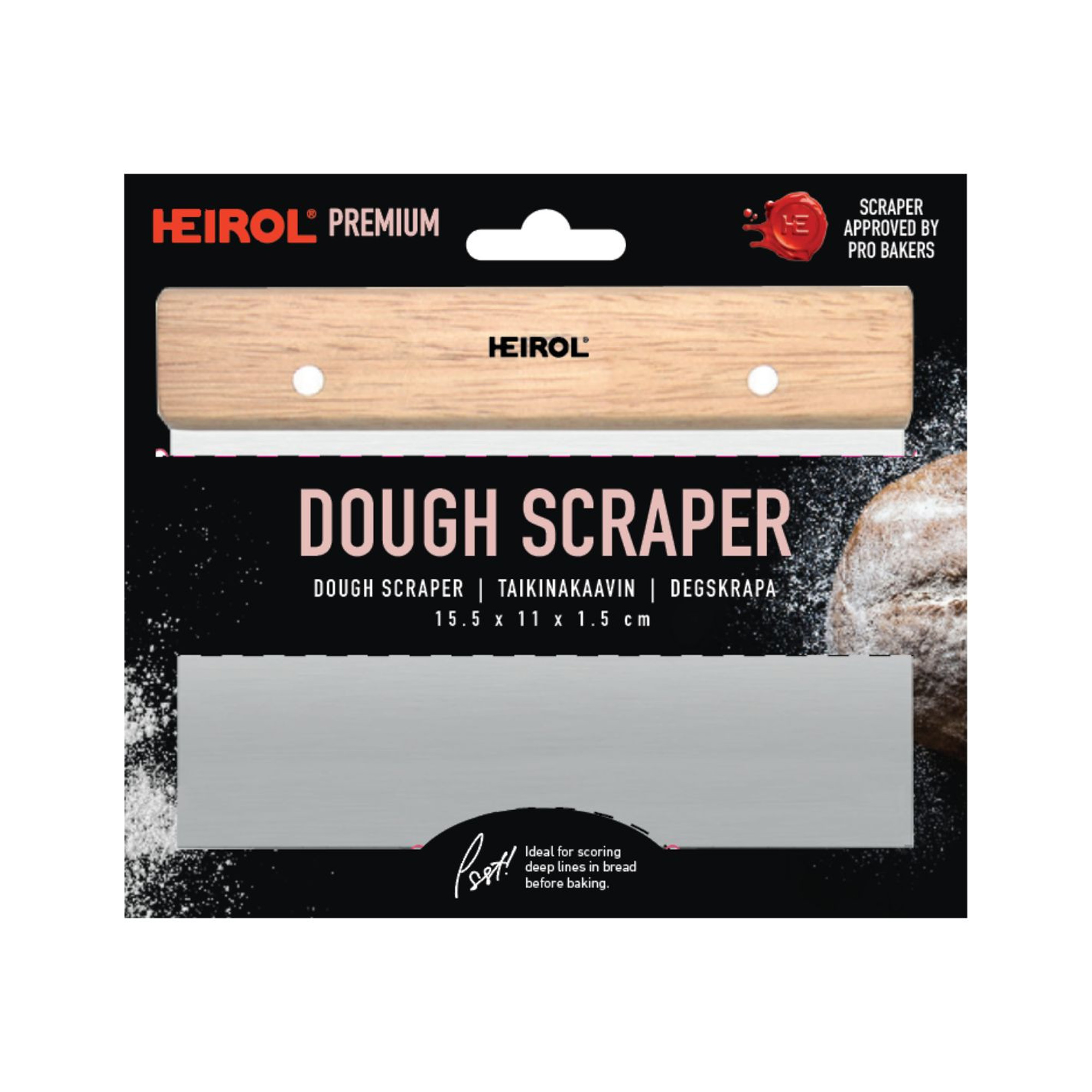 Degskrapa tillverkad i rostfritt stål och rosenträ. Skrapan kan användas till att portionera upp deg eller rengöra arbetsytan efter bullbaket. För att få lika stora bullar varje gång är den uppmärkt med mått på den rostfria delen. Diskas för hand.