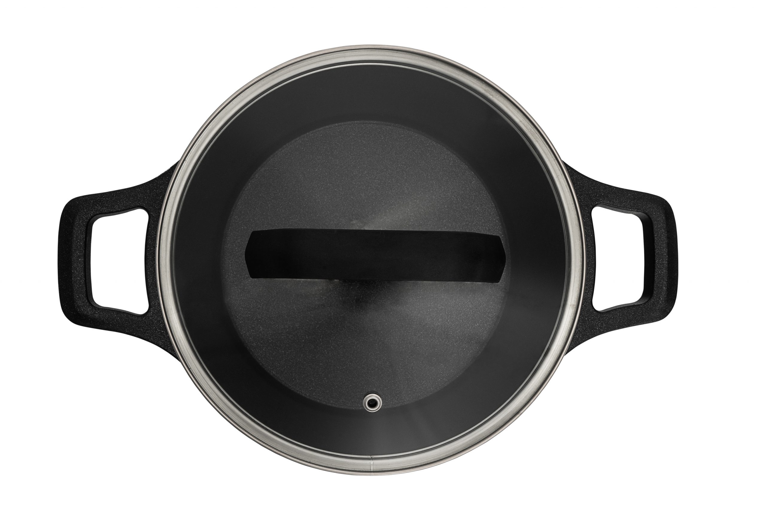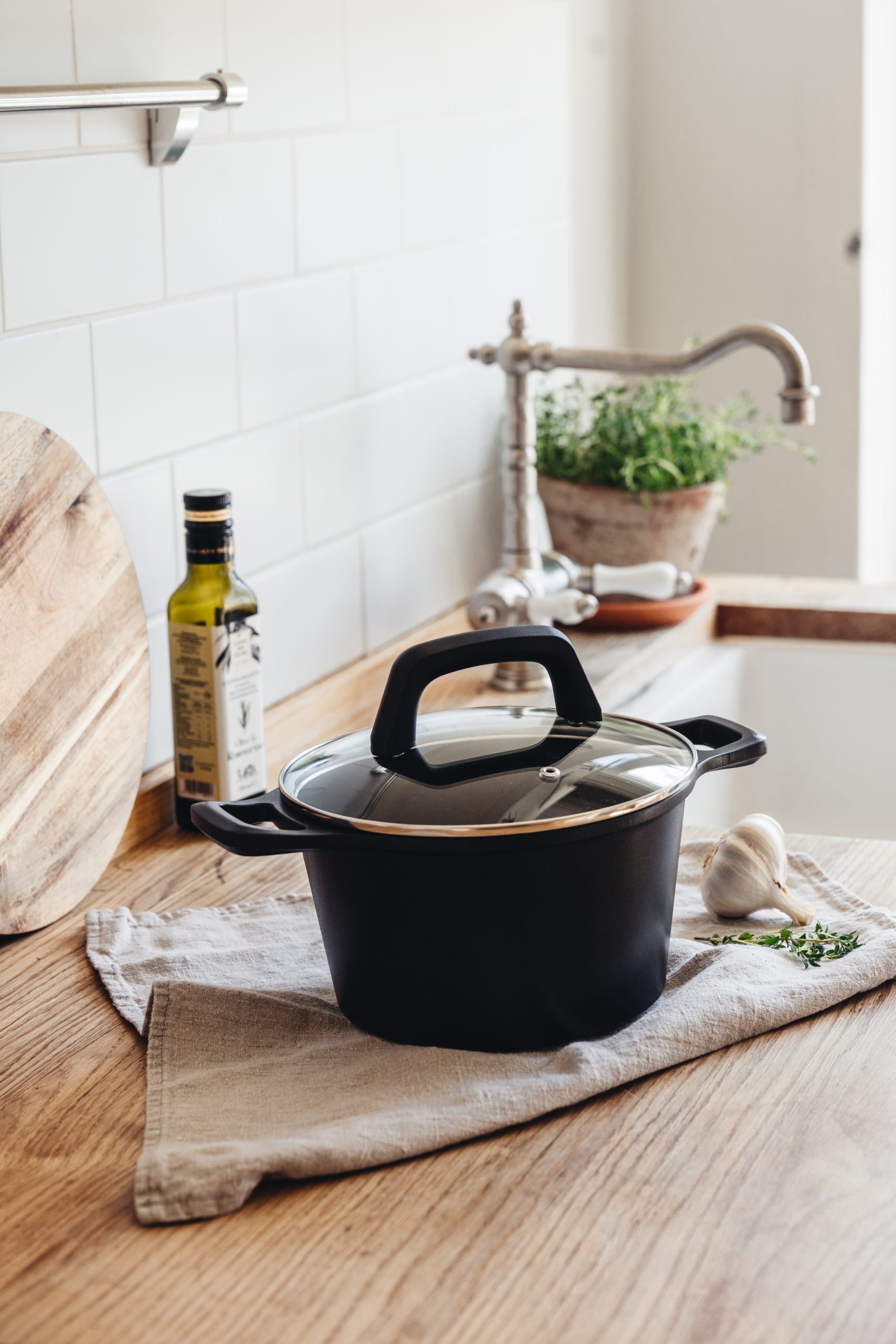 Gryta med dubbla handtag och förstärkt keramisk beläggning 2 cm. Grytan har en 6 mm tjock sula i rostfritt stål, så den kan användas på alla typer av hällar. Levereras med glaslock. Kan diskas i maskin, men handdisk gör att beläggningen håller längre. Fri från PFAS . Rymmer 3 liter