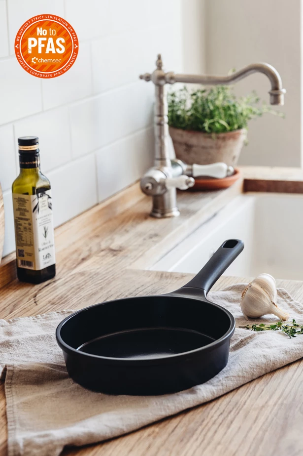 Stekpanna som tack vare de nästan raka kanterna ger en mycket större stekyta än andra pannor med samma diameter. Pannan har en förstärkt keramisk beläggning och botten i rostfritt stål på hela 6 mm. Detta ger en mycket god värmespridning samtidigt som pannan kan användas på alla typer av spisar. Kan även användas i ugn upp till 18 grader.