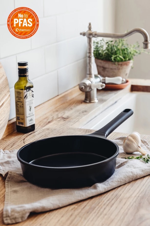Stekpanna som tack vare de nästan raka kanterna ger en mycket större stekyta än andra pannor med samma diameter. Pannan har en förstärkt keramisk beläggning och botten i rostfritt stål på hela 6 mm. Detta ger en mycket god värmespridning samtidigt som pannan kan användas på alla typer av spisar. Kan även användas i ugn upp till 18 grader.