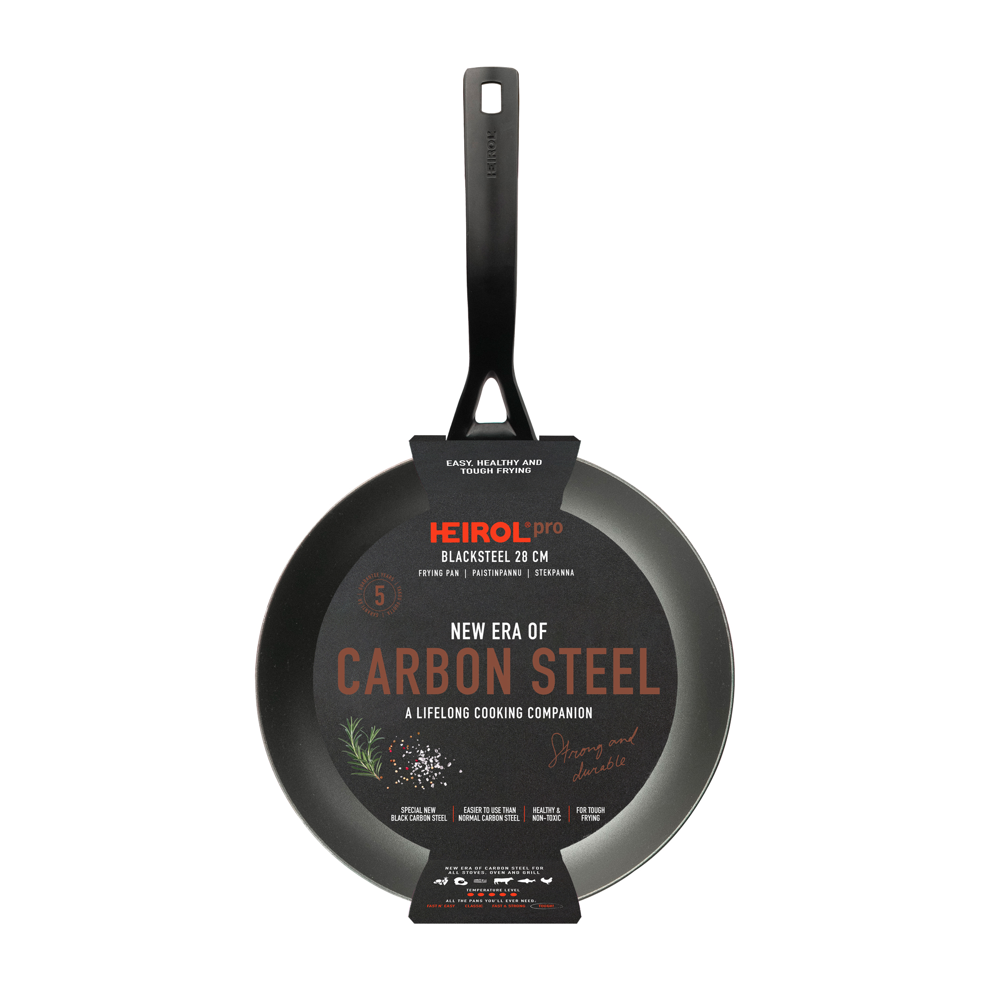 Heirol Blacksteel är en professionell svart kolstålspanna där genomtänkt design och pålitlig kvalitet tar din matlagning till en annan nivå. Det specialbehandlade svarta kolstålet ger utmärkta non-stick-egenskaper och bättre korrosionsbeständighet än i vanliga kolstålspannor. Blacksteel-pannorna behandlas med nitrid, varefter de värms upp i ugnen med kvävedioxid, vilket gör att det svarta oxidskiktet bildas. Blacksteel-pannorna är även förbehandlade med vegetabilisk olja, vilket ytterligare förbättrar pannornas korrosionsbeständighet. Pannornas non-stick-egenskaper blir bara bättre med tiden vid användning. Den 3 mm tjocka pannan böjer sig inte ens vid den tuffaste användningen. Pannorna är gjorda för att tåla höga temperaturer och är lämpliga på alla spisar, ugnar, grillar och till och med öppen eld. Det långa handtaget är nitat för ultimat hållbarhet. Pannan värms upp extremt snabbt och har utmärkt och energieffektiv värmeledningsförmåga. Med rätt användning och vård kan du göra din Blacksteel-panna till en livslång följeslagare för dina mest läckra matlagningsäventyr! Psst! Pannans utseende kommer att förändras efter första användningen. Detta är normalt och påverkar inte stekkvaliteten. Patinan kommer att förbättra stekresultatet med varje användning över tid.