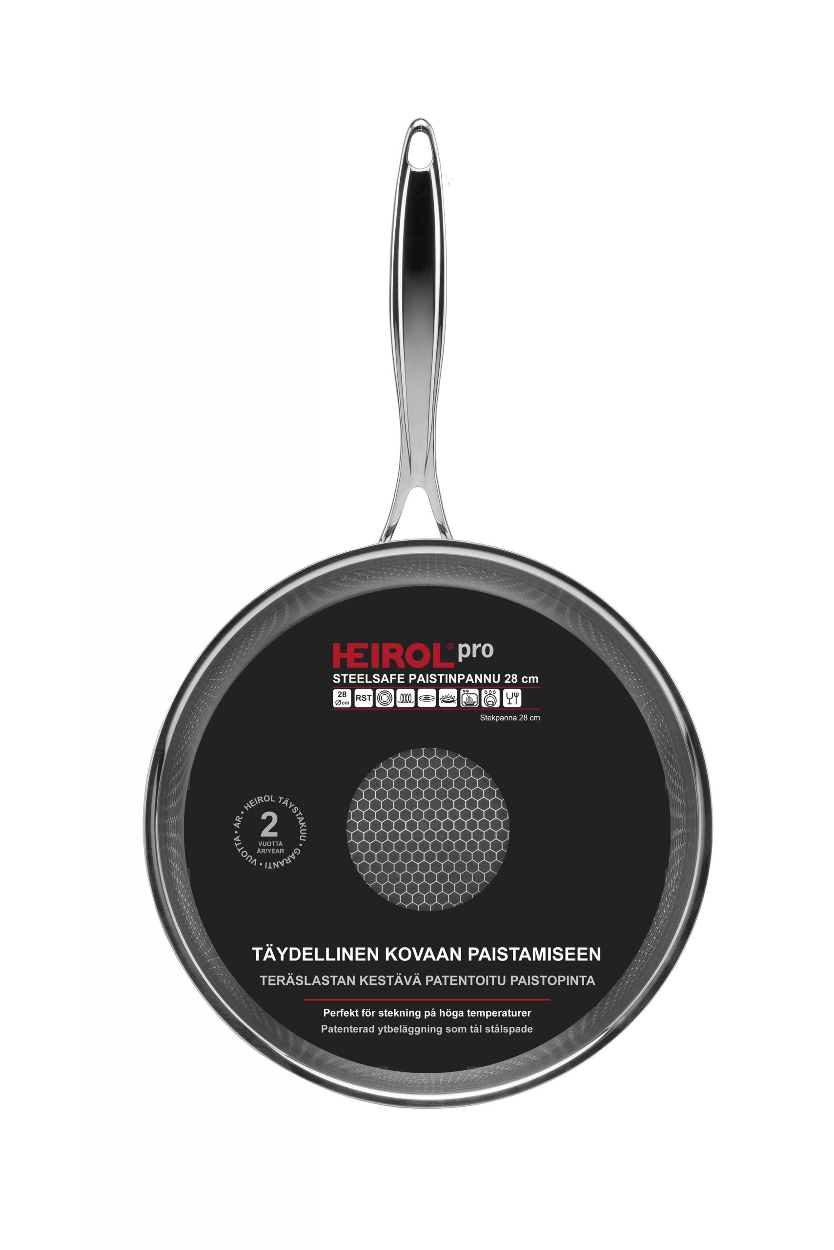 Heirol Steelsafe Pro kombinerar fördelarna med stålpannor och belagda pannor. Pannan har en non-stick beläggning som skyddas av ett patenterat nät av stål. Ståletnätet är endast ,5 mm tjockt, men detta räcker för att skydda beläggningen från vassa redskap. Tack vare detta kan även stålredskap användas i panna. Stekpannan har en diameter på 28 cm och stekytans diameter är 22 cm. Pannan kan användas på alla spistyper, inklusive induktion. Kan även användas i ugn i upp till 26 grader. Pannan är i rostfritt stål med en kärna av aluminium för god värmeledningsförmåga. Beläggningen är fri från PFOA. Handdiskas.