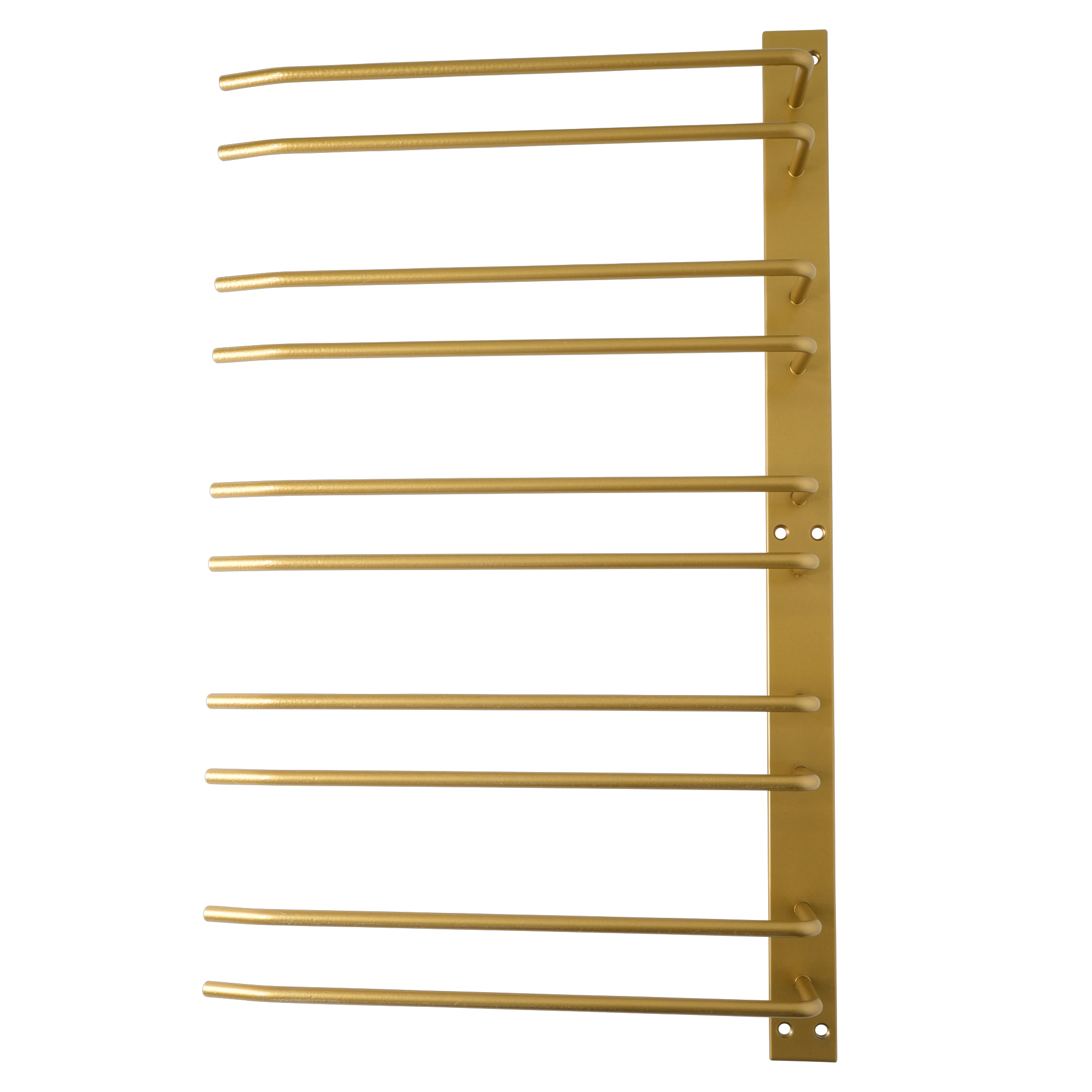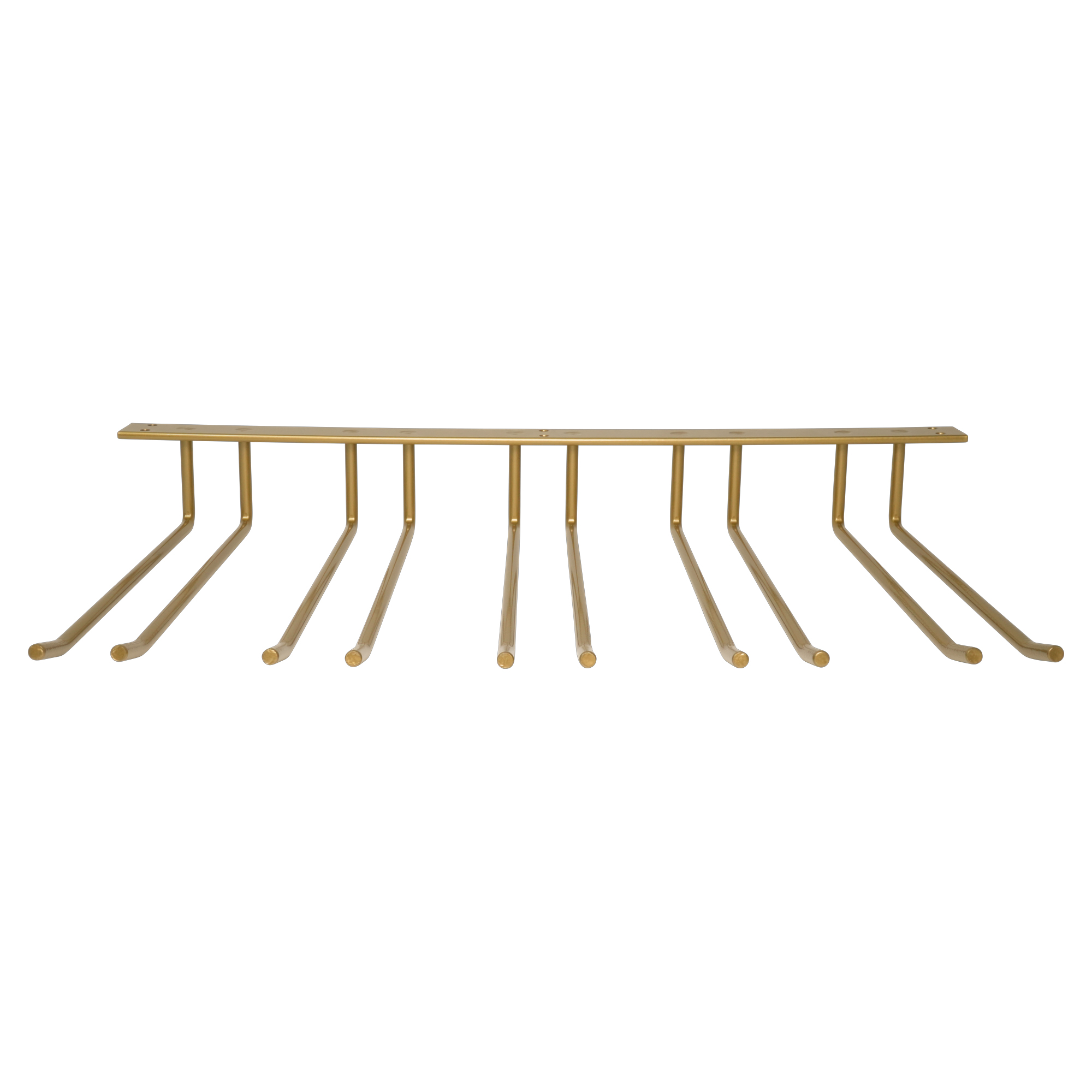 Guldfärgad glashängare i barmodell med fem rader. Hängaren monteras i taket, är 3 mm djup och rymmer 15 glas. Bredd 55 cm, totalt djup inklusive platta 32 cm, höjd 4 cm. Tillverkad i Sverige