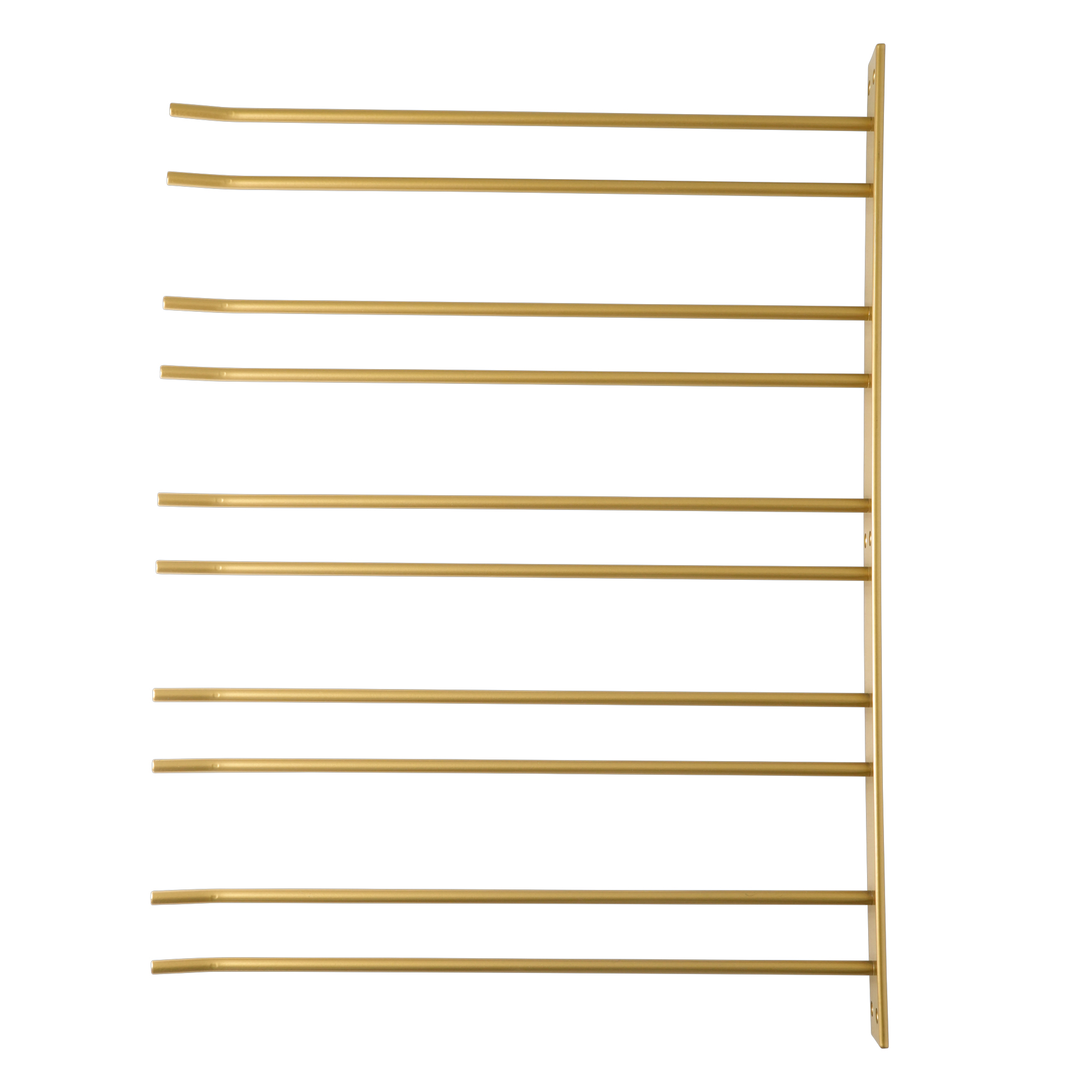 Guldfärgad glashängare i barmodell med fem rader. Hängaren monteras på vägg, är 4 mm djup och rymmer 2 glas. Bredd 55 cm, totalt djup inklusive platta 42 cm, höjd 4 cm. Tillverkad i Sverige.