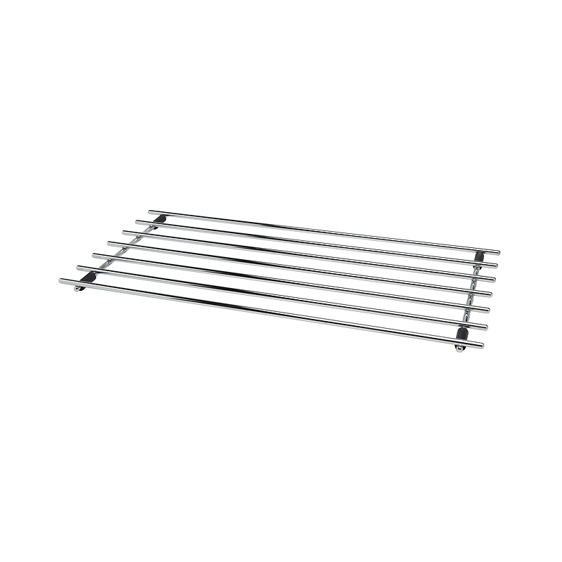 Grytunderlägg i silverlackerad stål. Underlägget är 25x4 cm stort och har gummerade hörn.