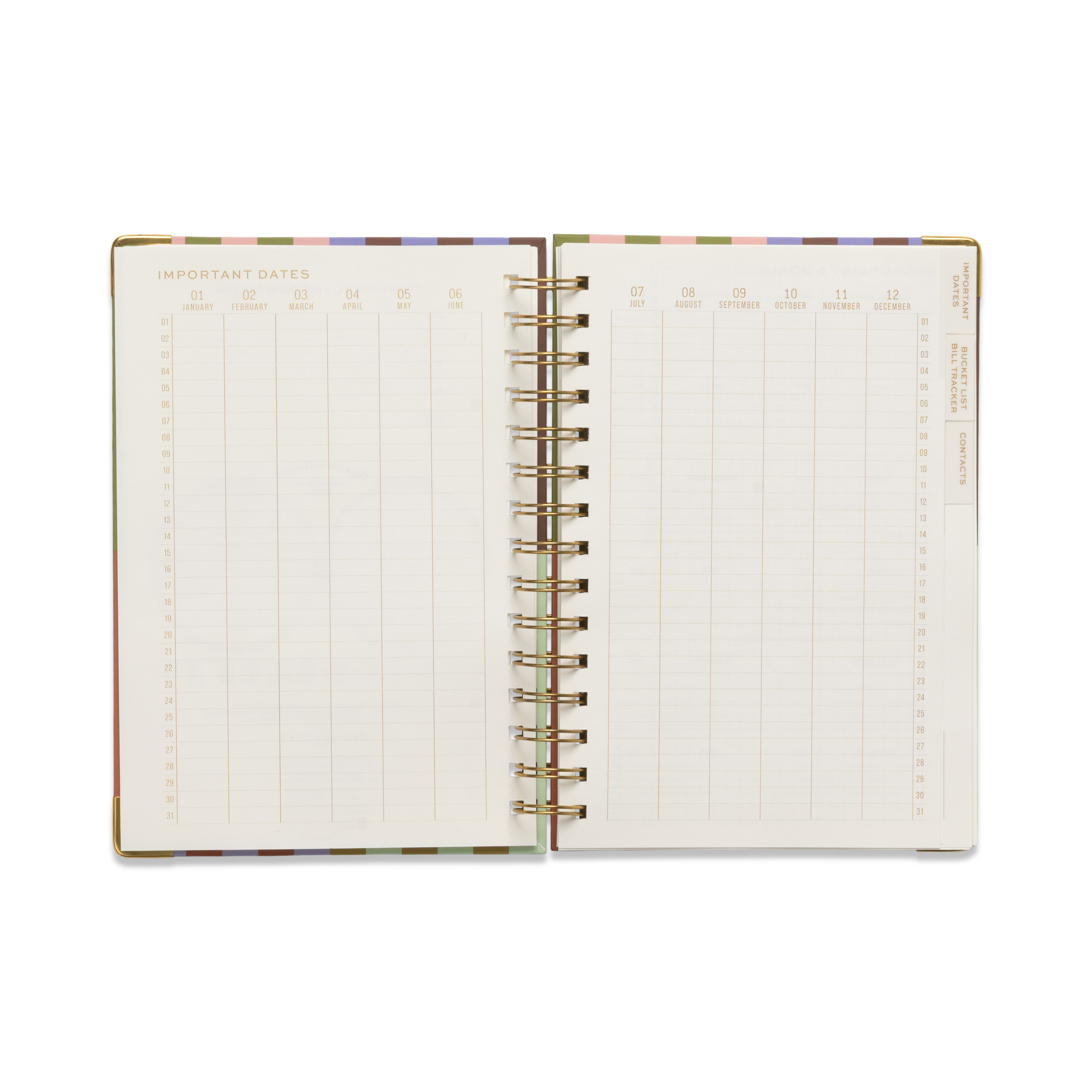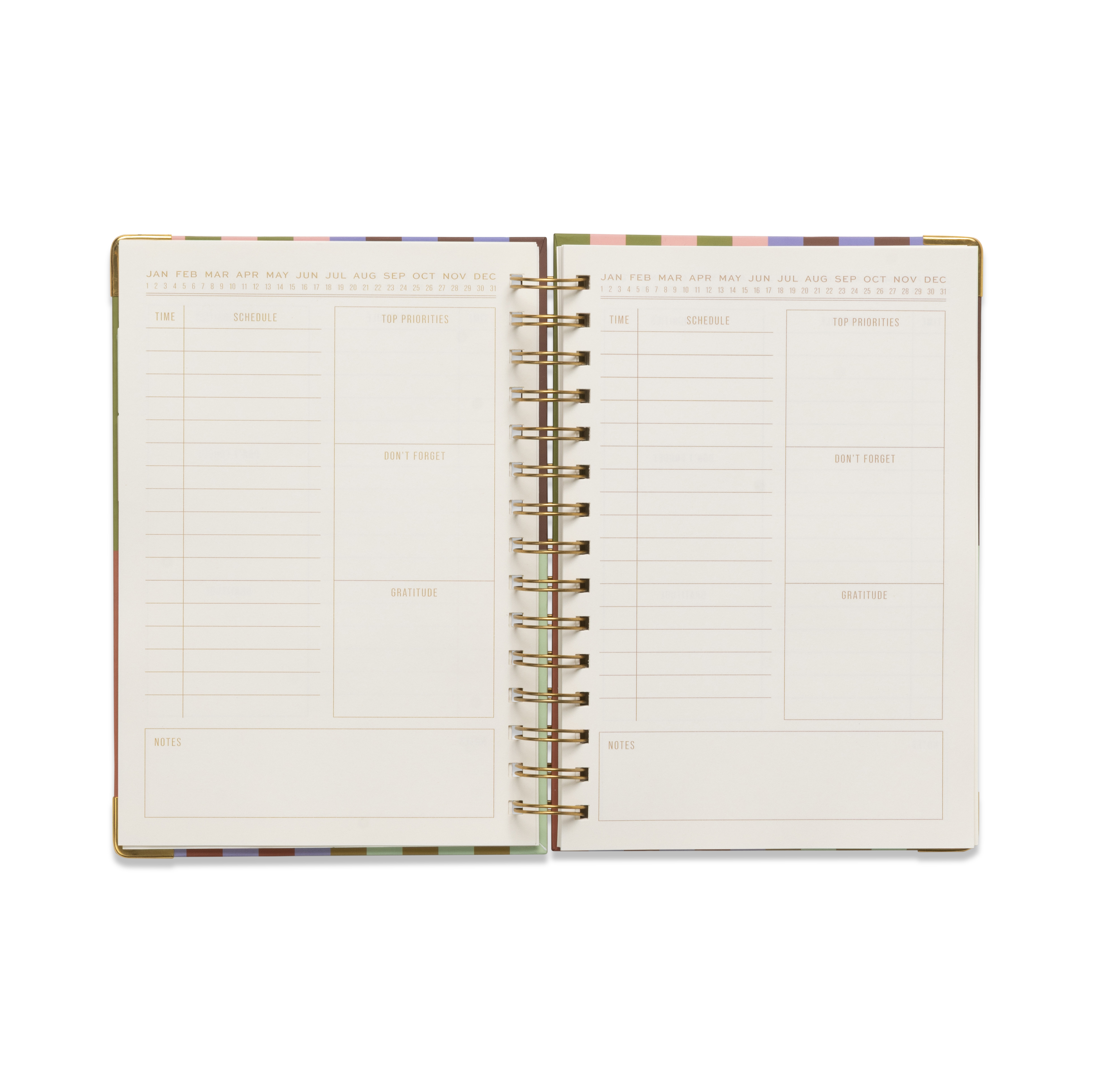 Dessa underbara planerare lägger till en färgklick för att lysa upp veckan, med fyll-i-datum-sidor och utrymmen för att spåra dagliga höjdpunkter och att göra. Varje planerare är trådbunden med ett hårt omslag och hörnskydd i metall för hållbarhet och en touch av guldfinish.