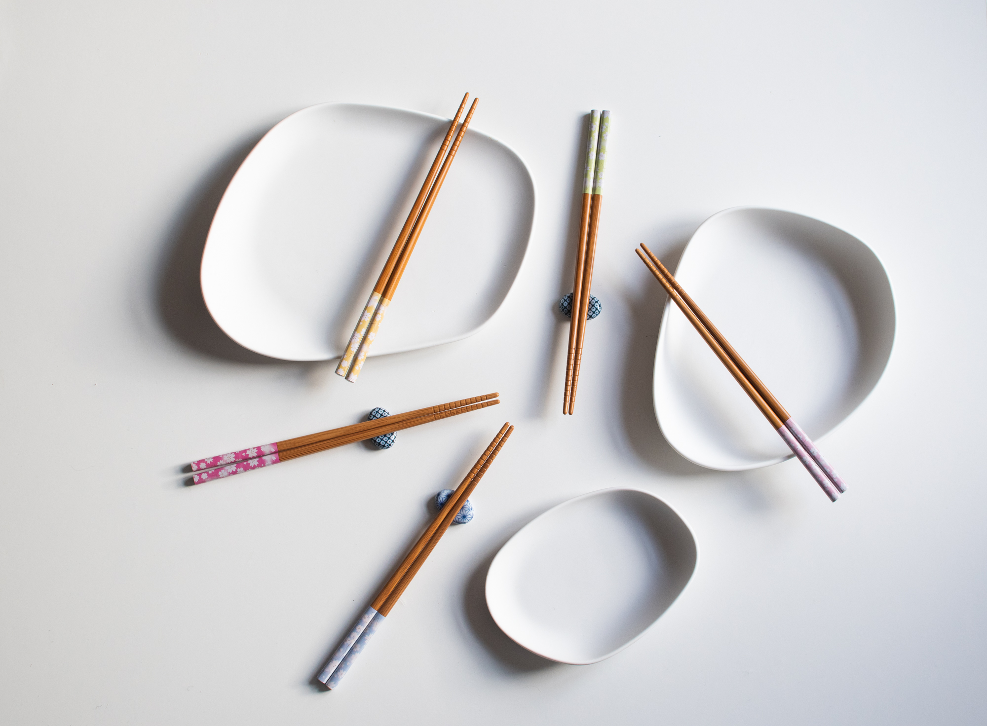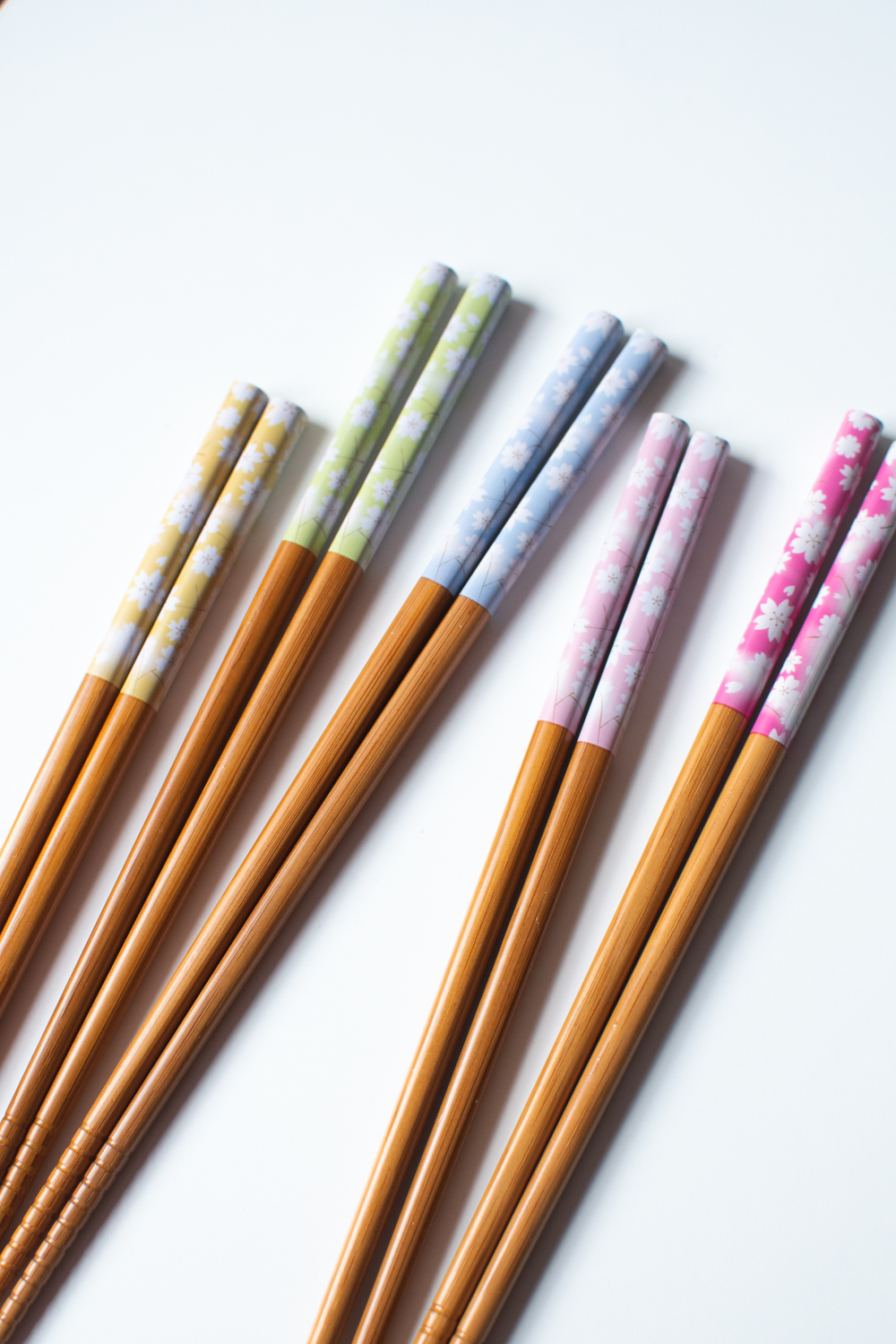 Fem par ätpinnar från japanska Kawai. Pinnarna har mönster med blommor i olika klara och glada färger. Pinnarna ska handdiskas.