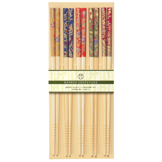 Set med fem par ätpinnar med klassiskt japanskt mönster. Tillverkade i Japan av trä med akrylöverdrag. Pinnarna ska handdiskas.