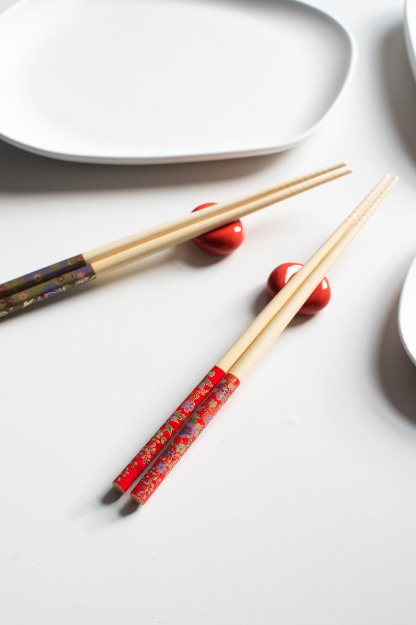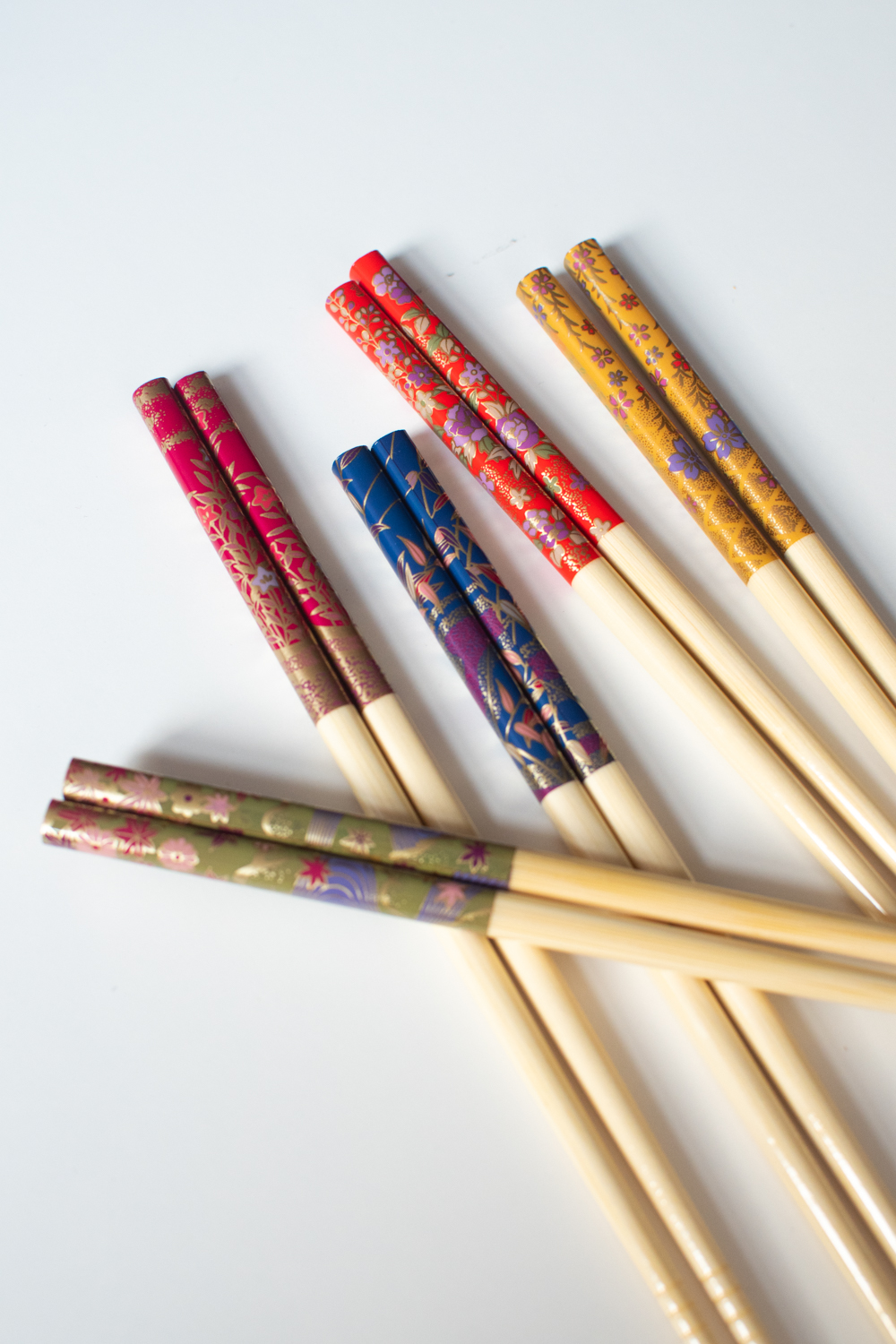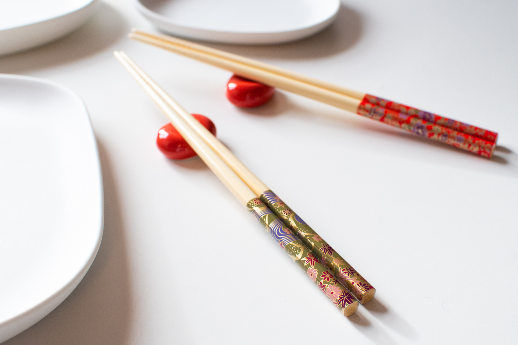 Set med fem par ätpinnar med klassiskt japanskt mönster.