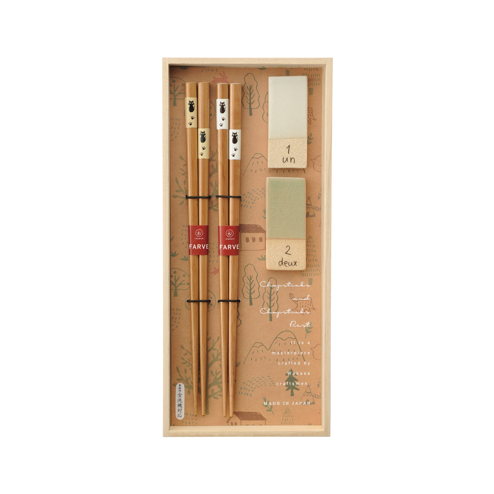 Gåvoset med två par ätpinnar söta katter och stilrena pinnstöd i naturfärger. Levereras i fin träask. Tillverkat i Japan. Ätpinnarna kan diskas i maskin.