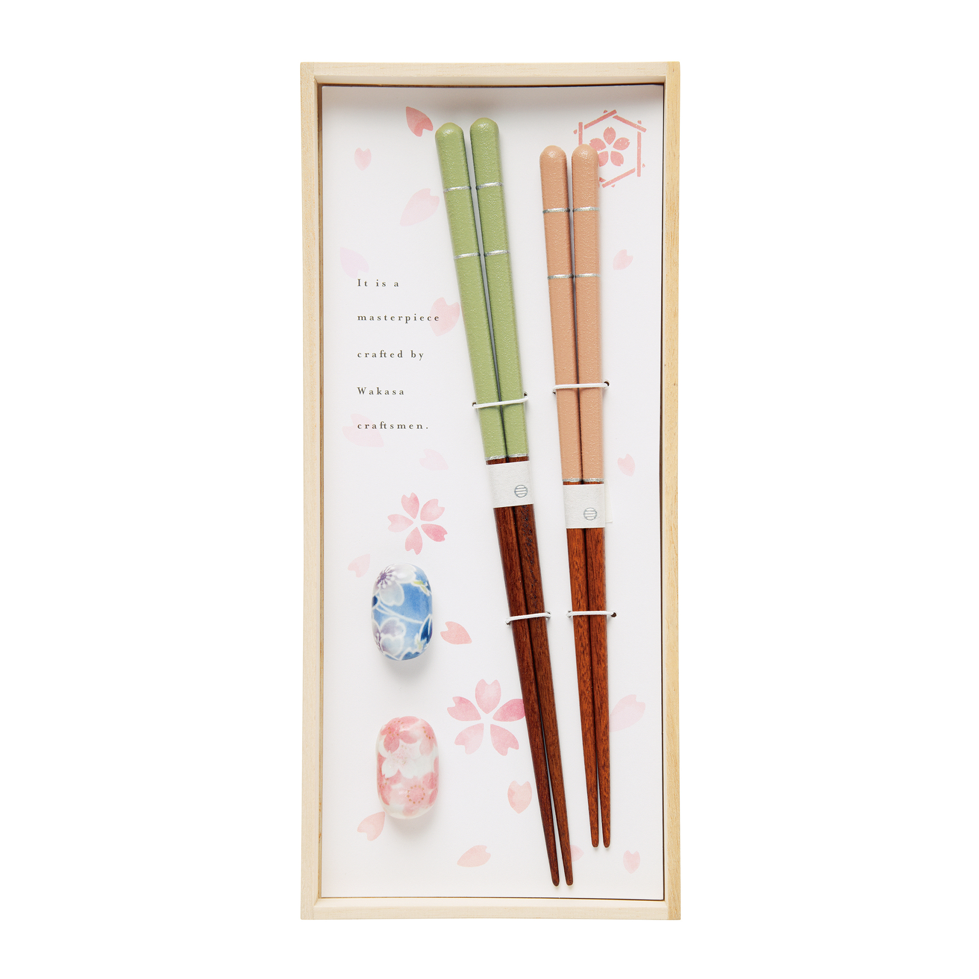 Gåvoset med två par ätpinnar med jordnära dekor och vackert blommiga pinnstöd. Levereras i fin träask. Tillverkat i Japan. Ätpinnarna kan diskas i maskin.