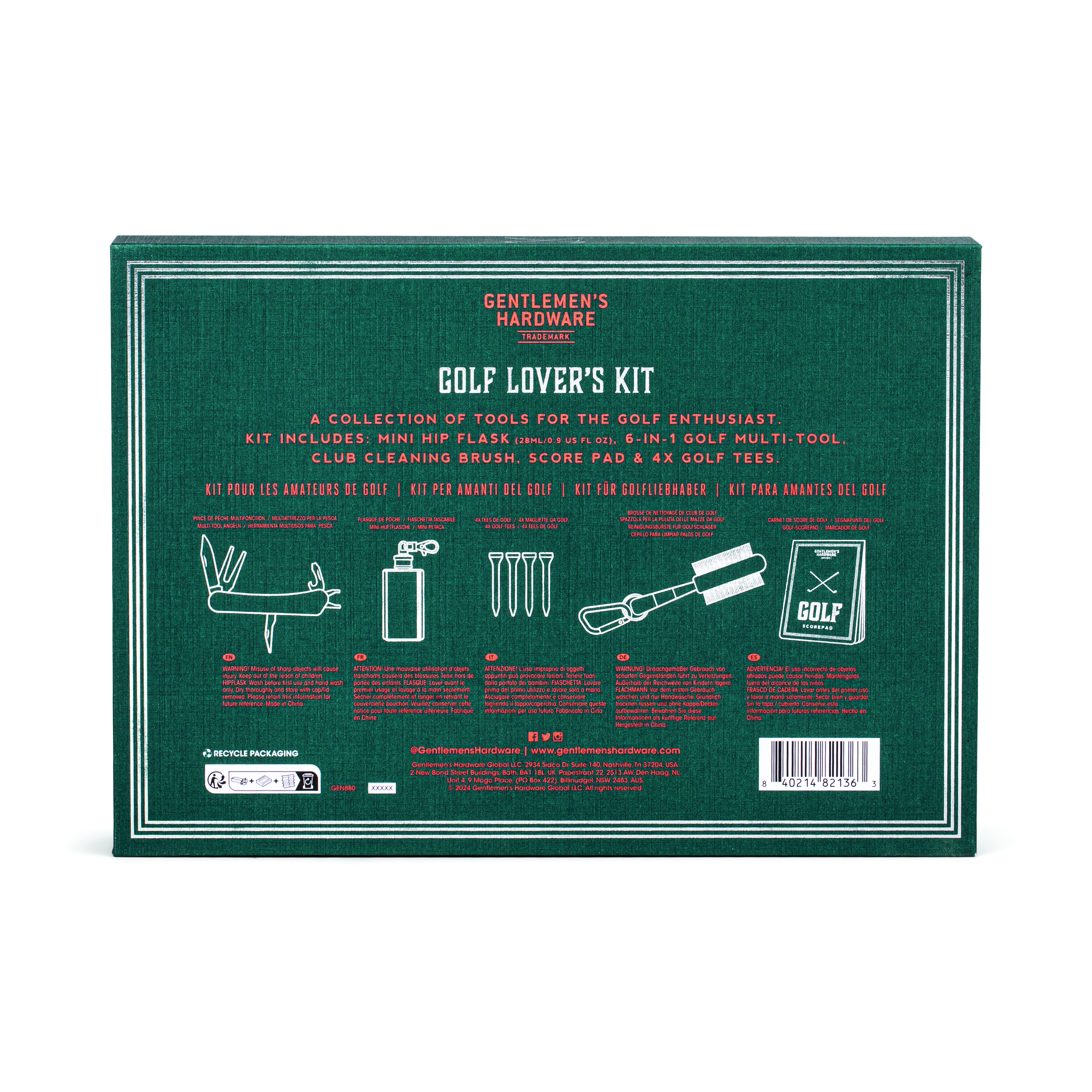 En samling verktyg för golfentusiasten. 6-i-1 Golf Multi-Tool, (28 Ml/0,9 US Fl O) kit innehåller: Mini Hip Flask Club rengöringsborste, Score Pad och 4X Golf Tees.