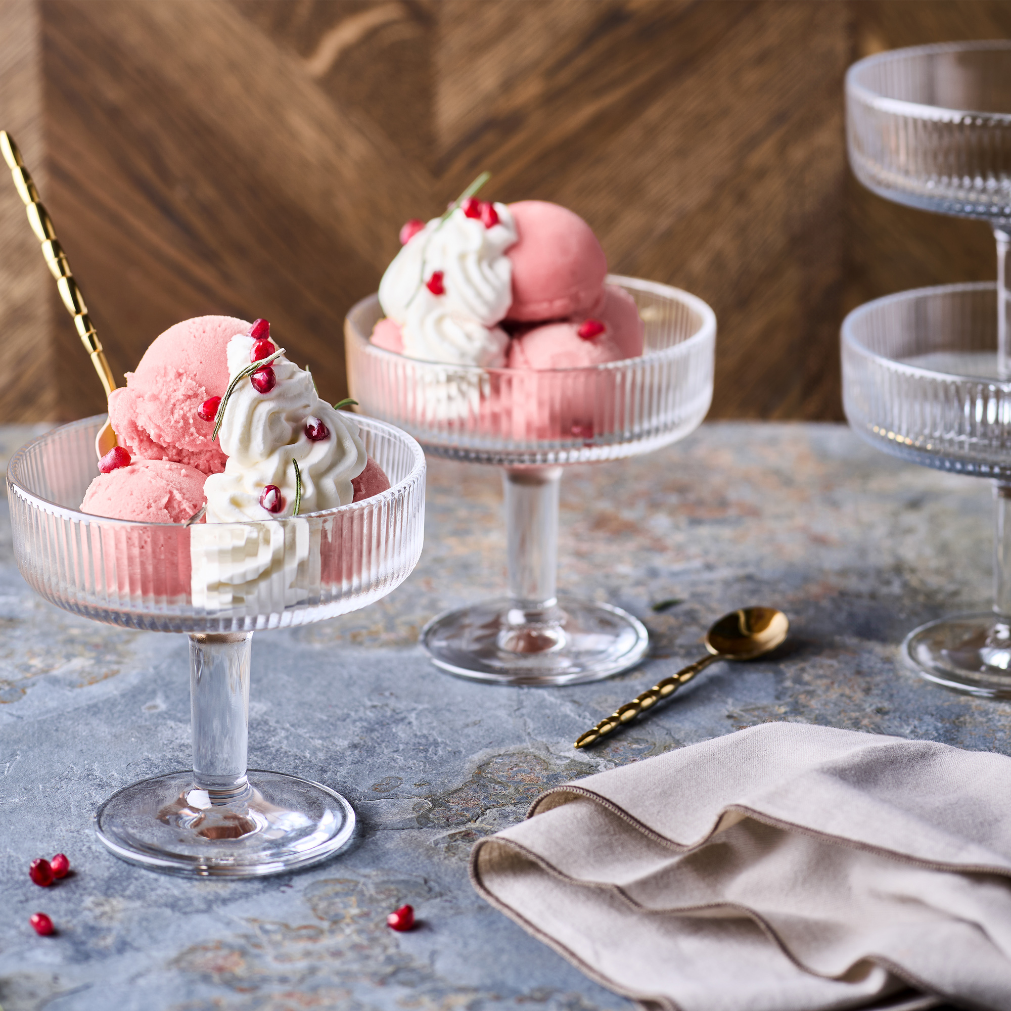 Alla glas är pressade, en klassisk tillverkningsteknik som ger dem deras karakteristiska tyngd, precision och hållbarhet. Formgivningen hämtar inspiration från Frankrikes rika kulturarv – från elegant arkitektur till historiska symboler som den franska liljan.