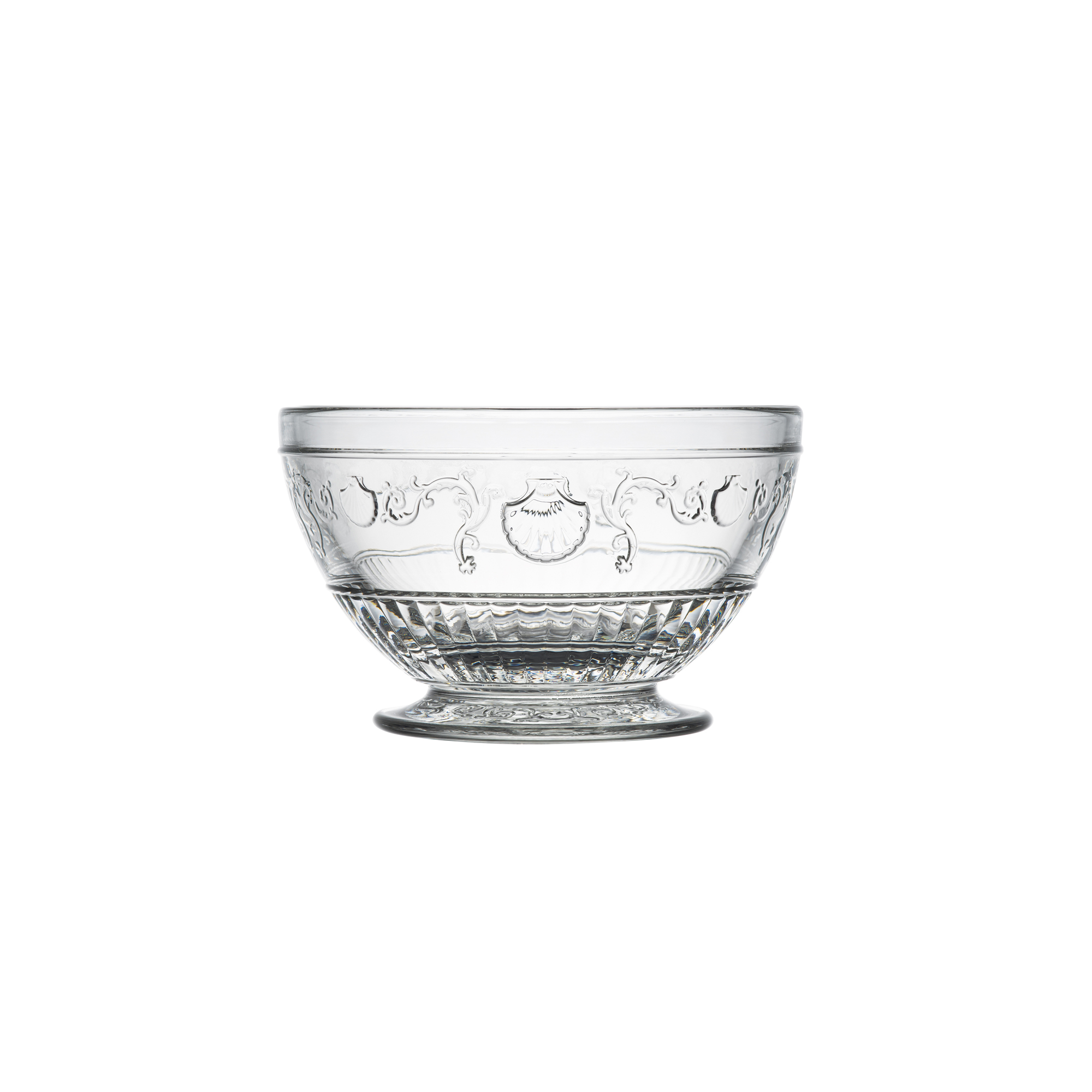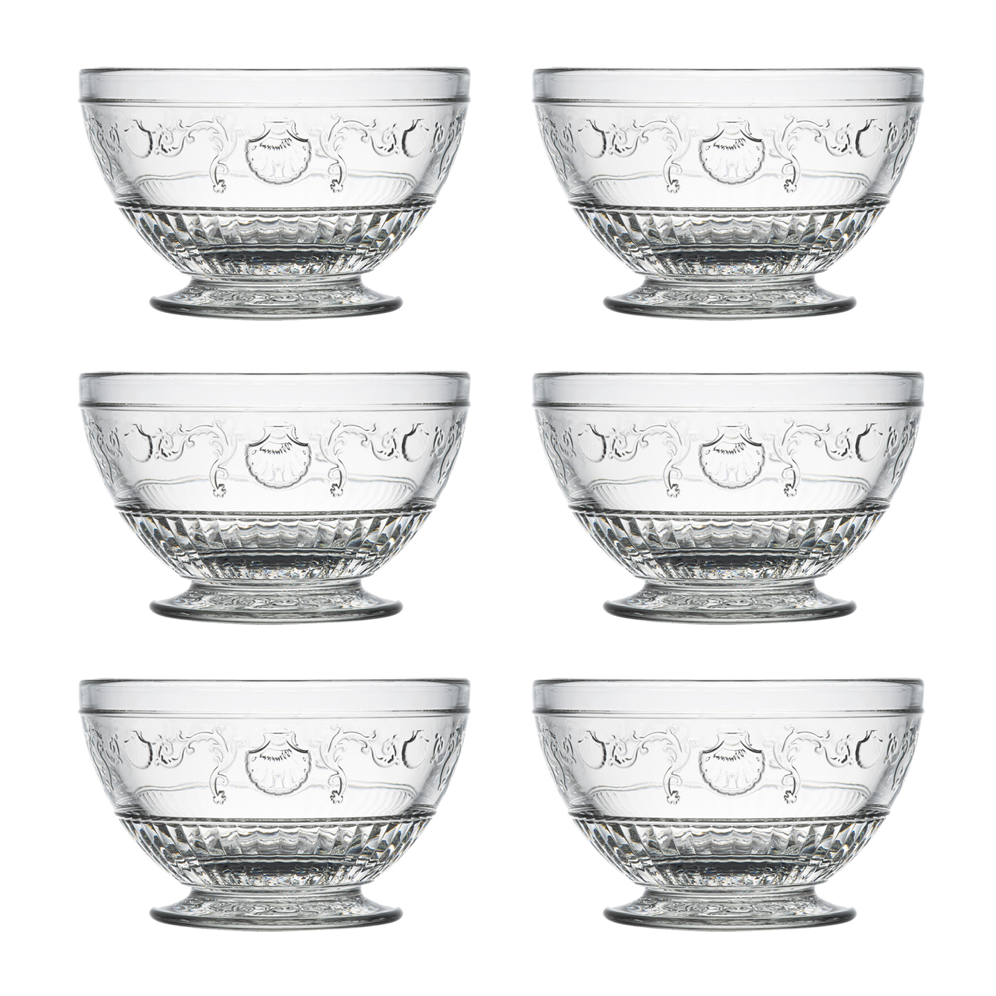 Liten Dessertskål Versailles 6 st från franska La Rochère. Glasen är inspirerade av pampiga Versailles och smyckat av snäckskal och blommor. Passar bra till mindre desserter som mousse och pannacotta.Rymmer 27 cl och kan diskas i maskin.