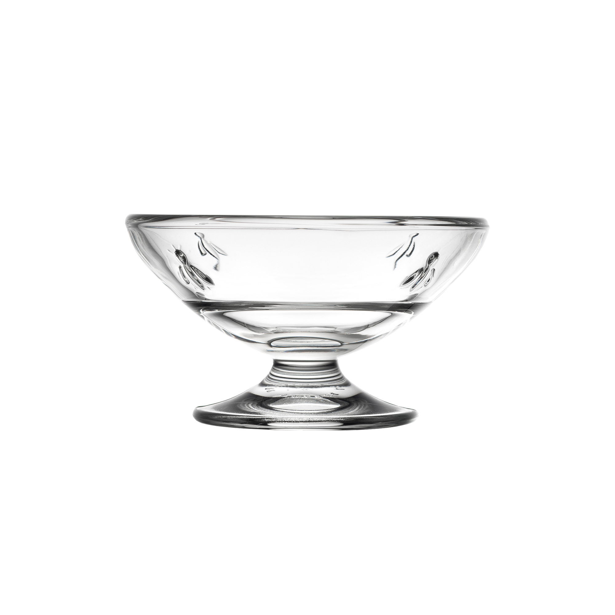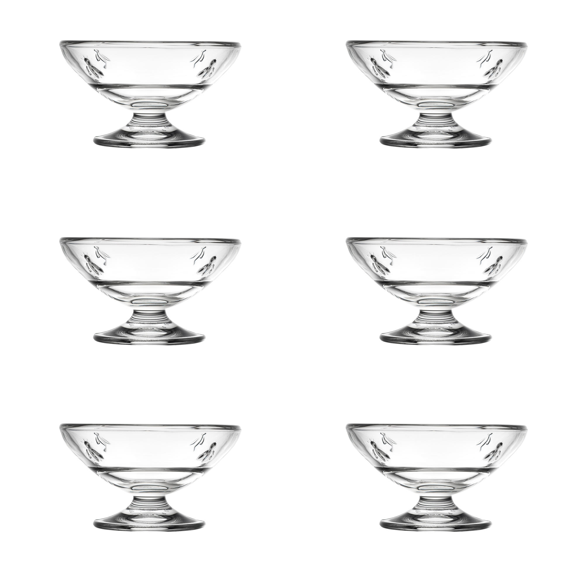 Glasskål på fot Abeille 6 st från franska La Rochère. Skålarna är smyckade med napoleonbin och passar till både desserter som glass och som snacksskål. Serien Abeille är La Rochères signaturglas dekorerade med bin. Bina är den symbol som Napoleon valde till sin kejsarkröning och som därefter fanns på jackor, mattor, flaggor och mycket annat under hans regeringstid. Glasen som har en modern silhuett med en charmig touch fungerar till både vardag och fest.