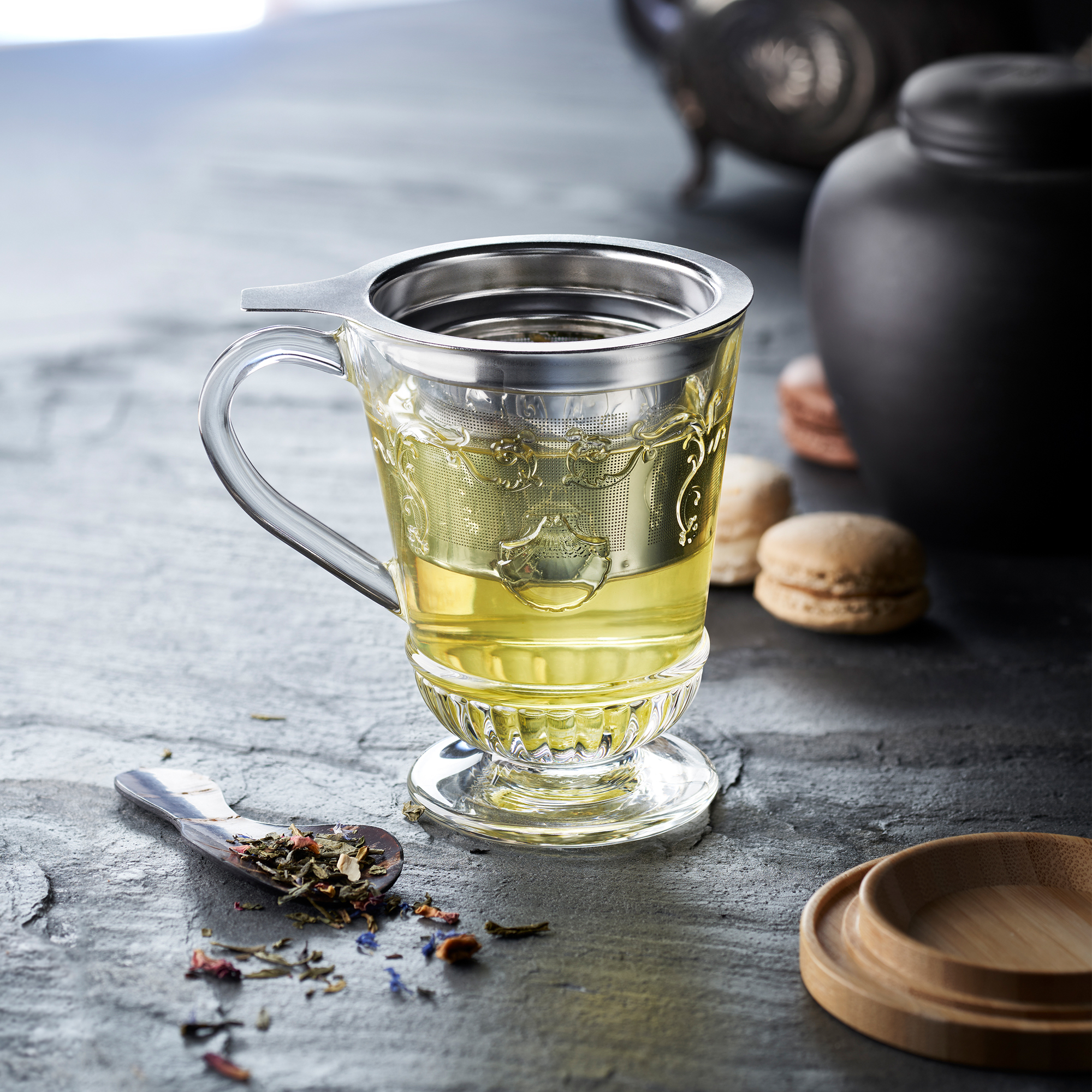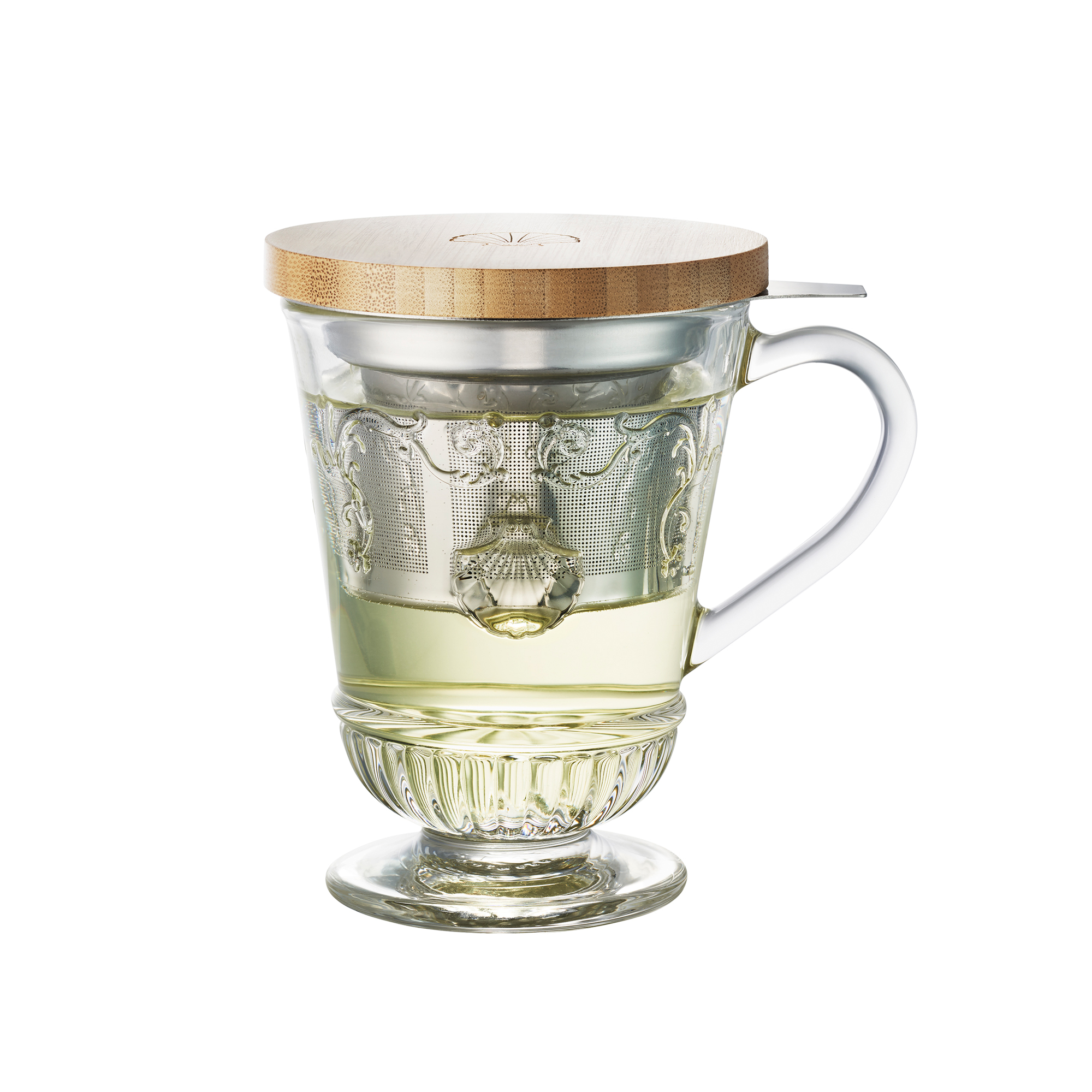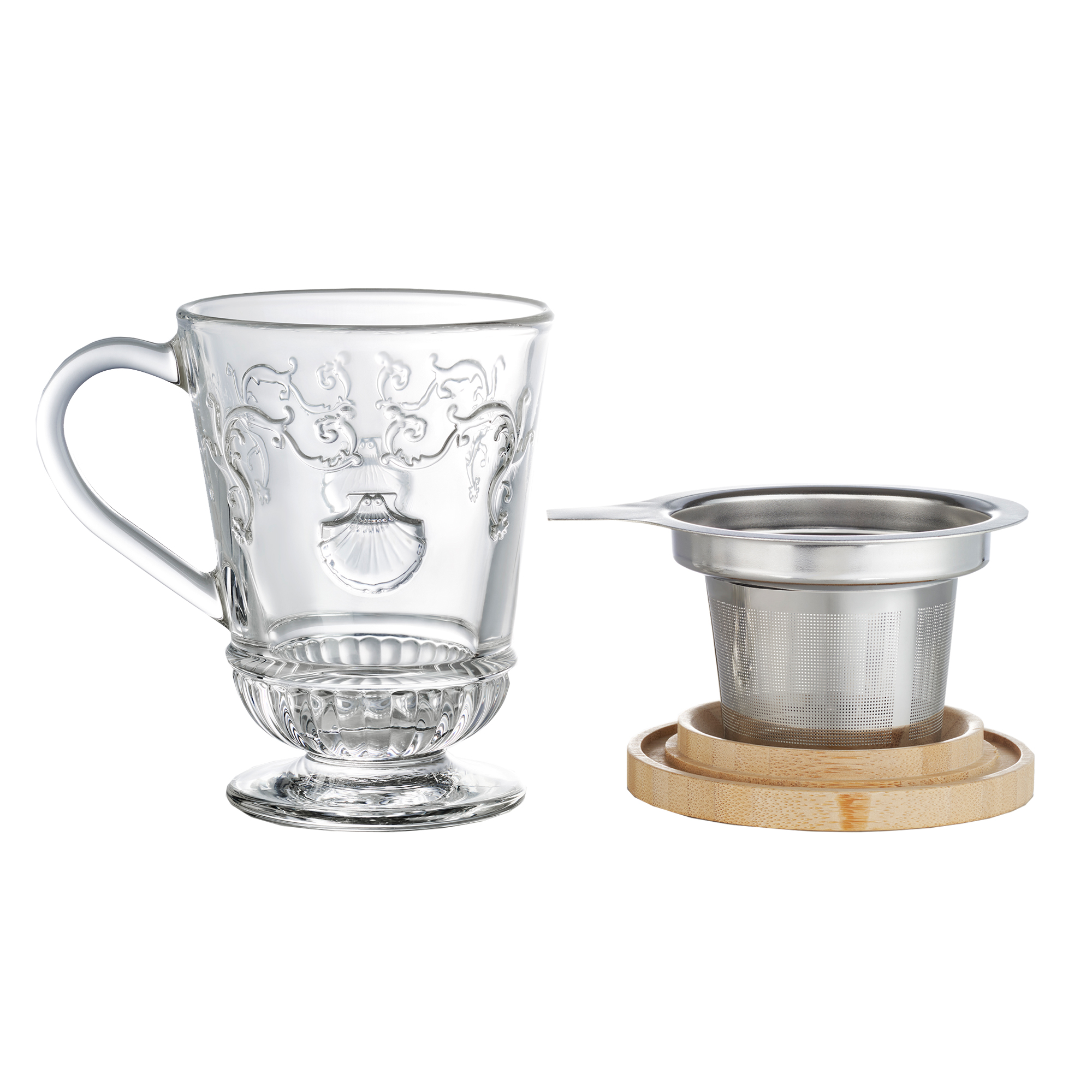 Tisaniere Versailles från franska La Rochere. En temugg på fot med tesil och lock i bambu. Tesilen är tillverkad i rostfritt stål och är rymlig för att teet ska få utrymme att utveckla alla smaker. Rymmer 27,5 cl. Serien Versailles är inspirerat av det ikoniska palatset och är därför smyckade med eleganta snäckskal och blommor. Glasen är pampiga men passar ändå till både vardag och fest.