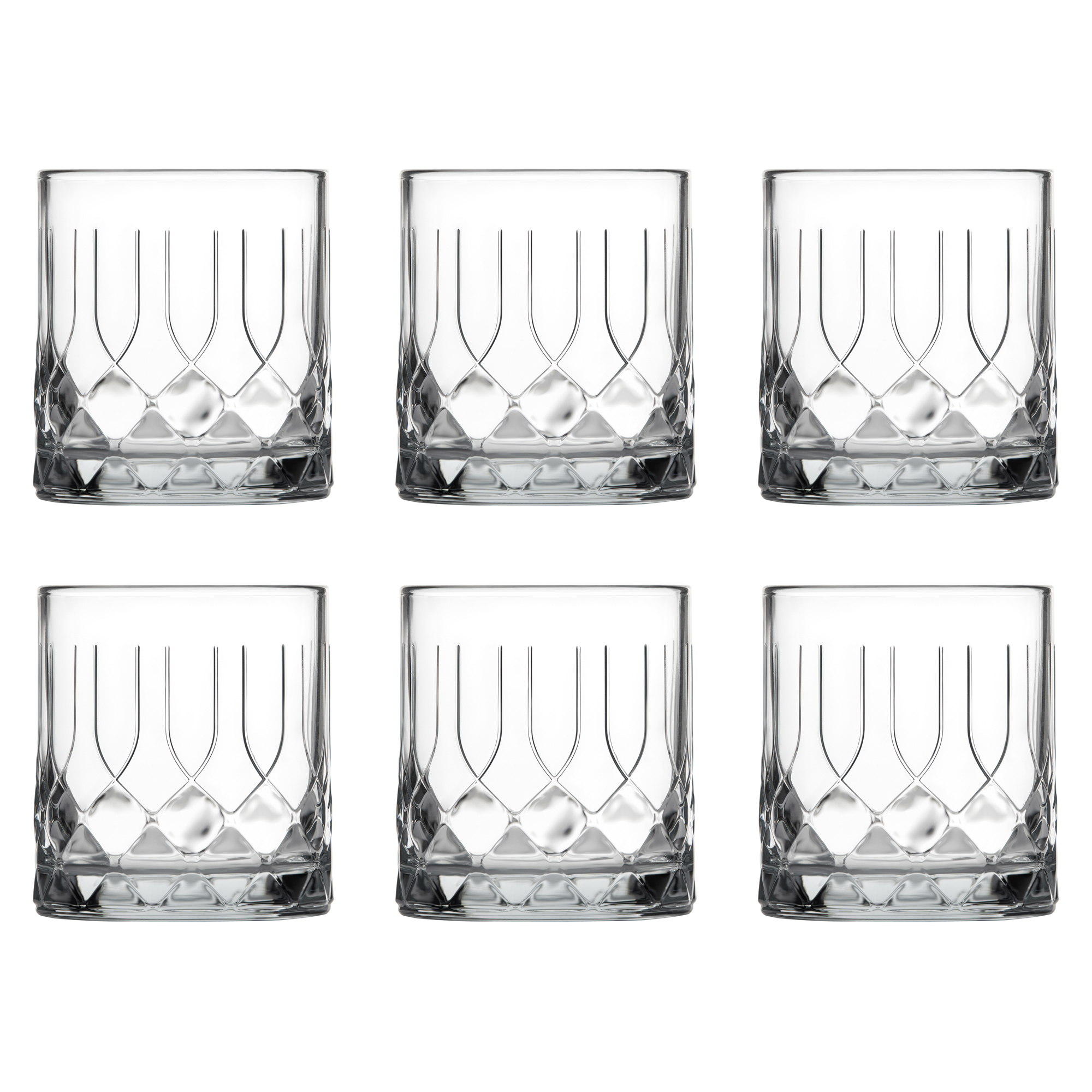 Robust klassiskt whiskyglas med mönster som ger Chicago-vibbar. Paket med 6 stycken glas som rymmer 34 cl.