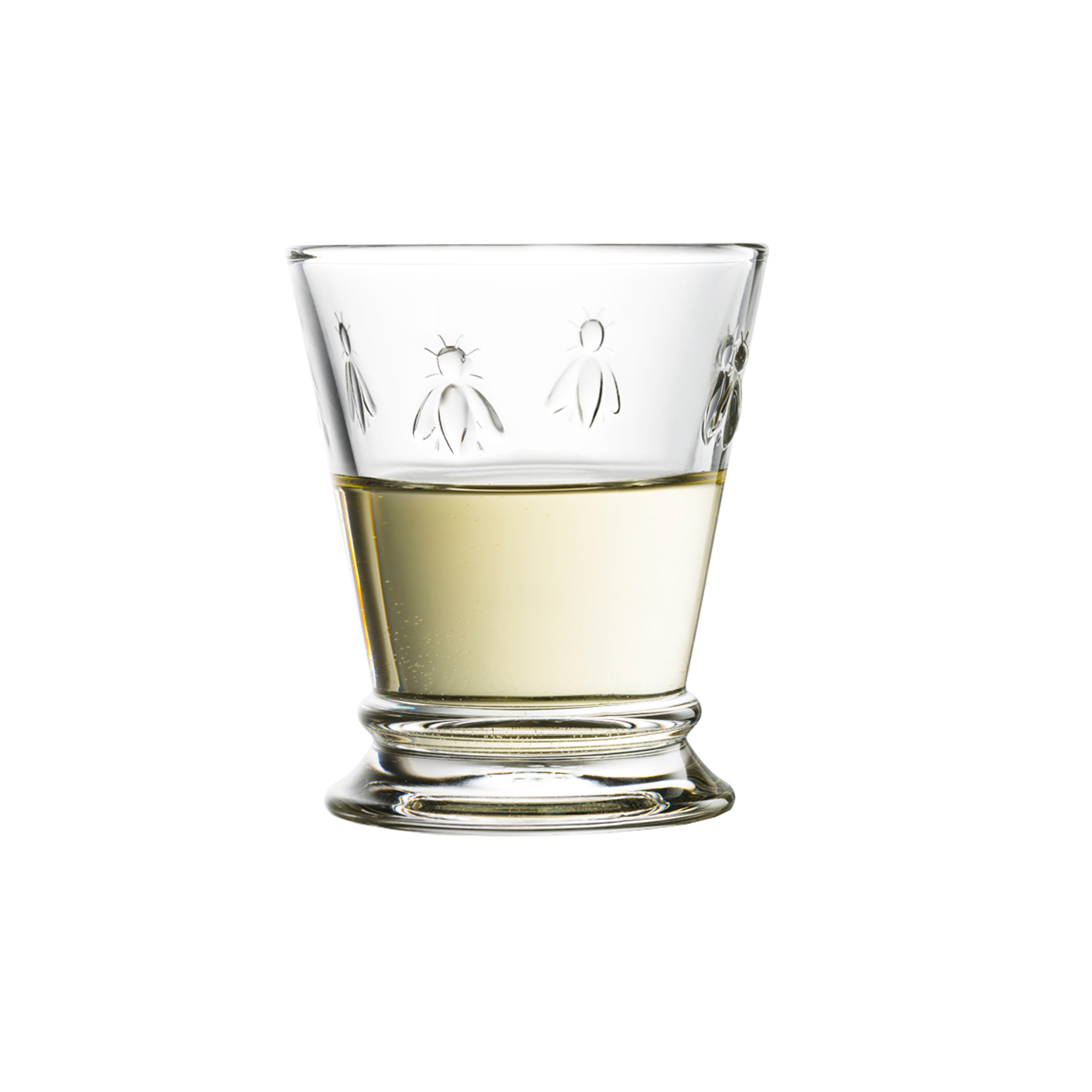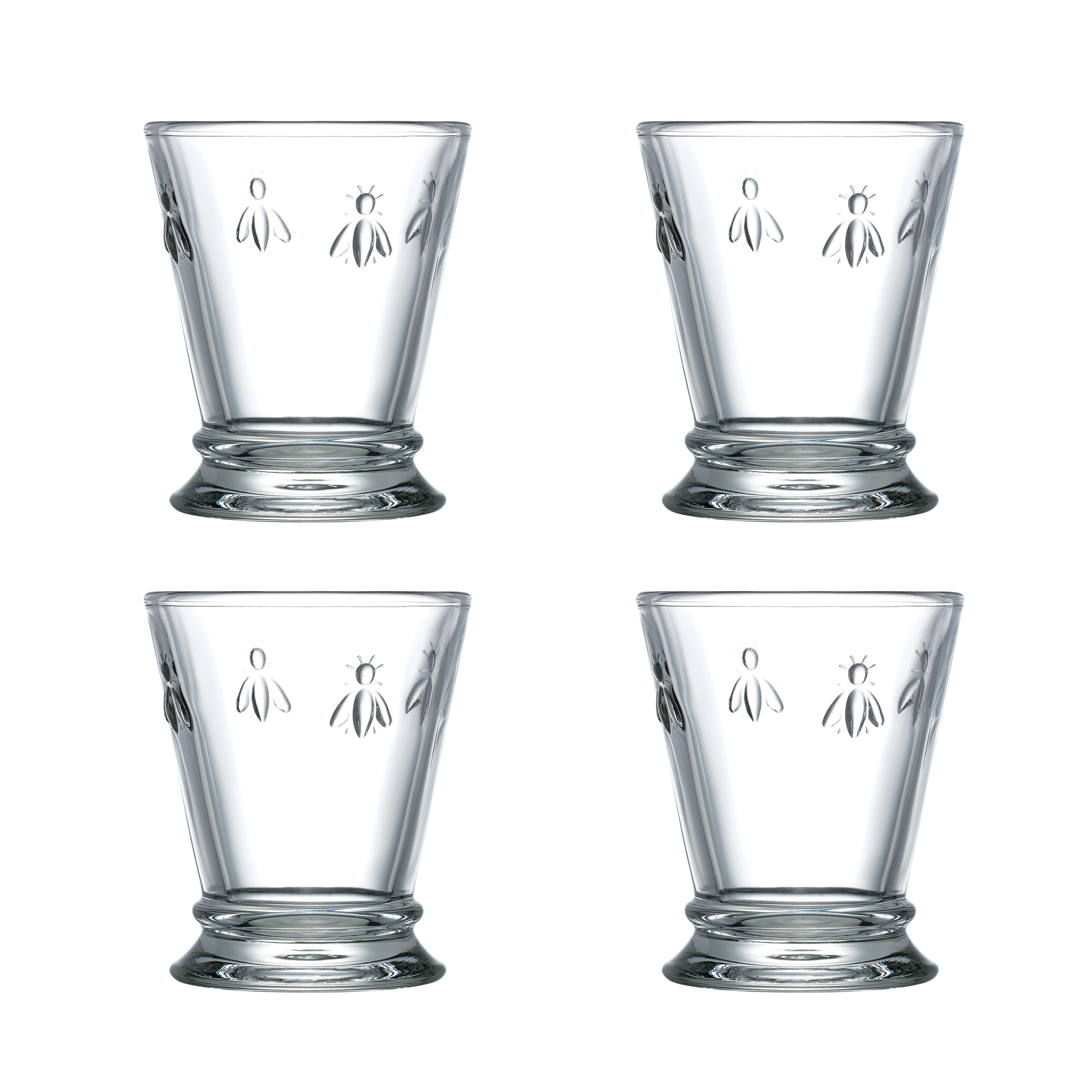 Vattenglas Abeille 4 st från franska La Rochère. Glasen är smyckade med napoleonbin och passar till både till juice, vatten och drinkar. Ligger i en gåvoförpackning. Serien Abeille är La Rochères signaturglas dekorerade med bin. Bina är den symbol som Napoleon valde till sin kejsarkröning och som därefter fanns på jackor, mattor, flaggor och mycket annat under hans regeringstid. Glasen som har en modern silhuett med en charmig touch fungerar till både vardag och fest.