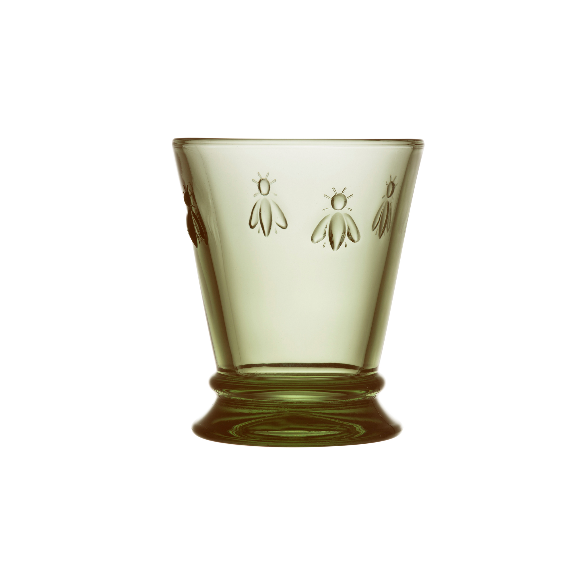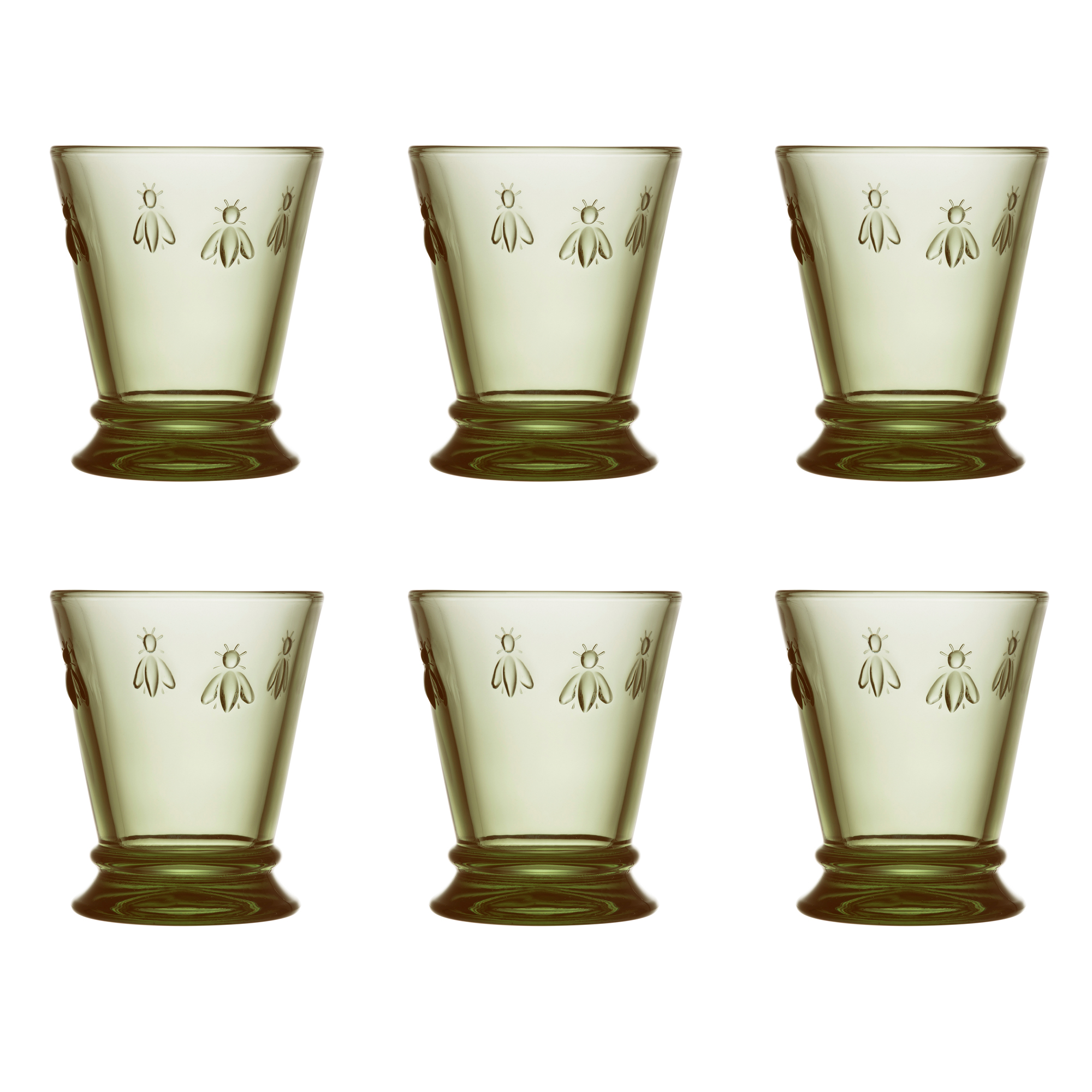 Vattenglas Olivgrön Abeille 6 st från franska La Rochere. Glasen är smyckade med napoleonbin och passar till både till juice, vatten och drinkar. Rymmer 26 cl. Serien Abeille är La Rochéres signaturglas dekorerade med bin. Bina är den symbol som Napoleon valde till sin kejsarkröning och som därefter fanns på jackor, mattor, flaggor och mycket annat under hans regeringstid. Glasen som har en modern silhuett med en charmig touch fungerar till både vardag och fest.