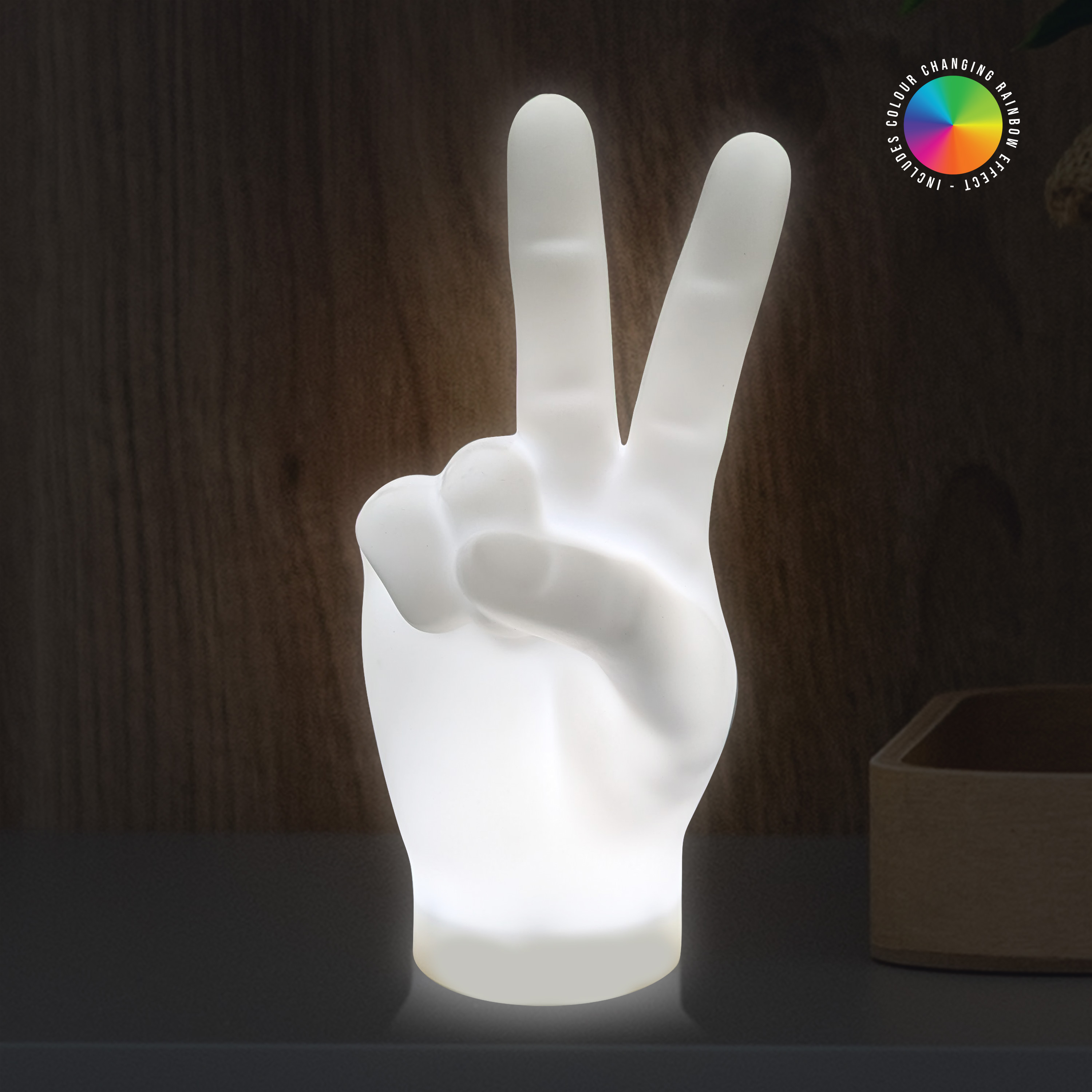 Ta med goda vibbar in i ditt utrymme med denna fredslampa i silikon! Den här silikonlampan är formad som en hand som blinkar med det ikoniska fredstecknet erbjuder en mjuk, färgskiftande glöd som skapar en lugnande och upplyftande atmosfär. Perfekt för att lägga till en touch av harmoni till alla är den här lekfulla lampan lika cool som den är fridfull. INFO: SOFT TOUCH SILIKONLAMPA OCH USB-LADDNINGSKABEL - 3 VIT LJUSINSTÄLLNINGAR OCH 1 REGNBÅGSFÄRGFÖRÄNDRANDE EFFEKT Mått: 10x21.2x7cm