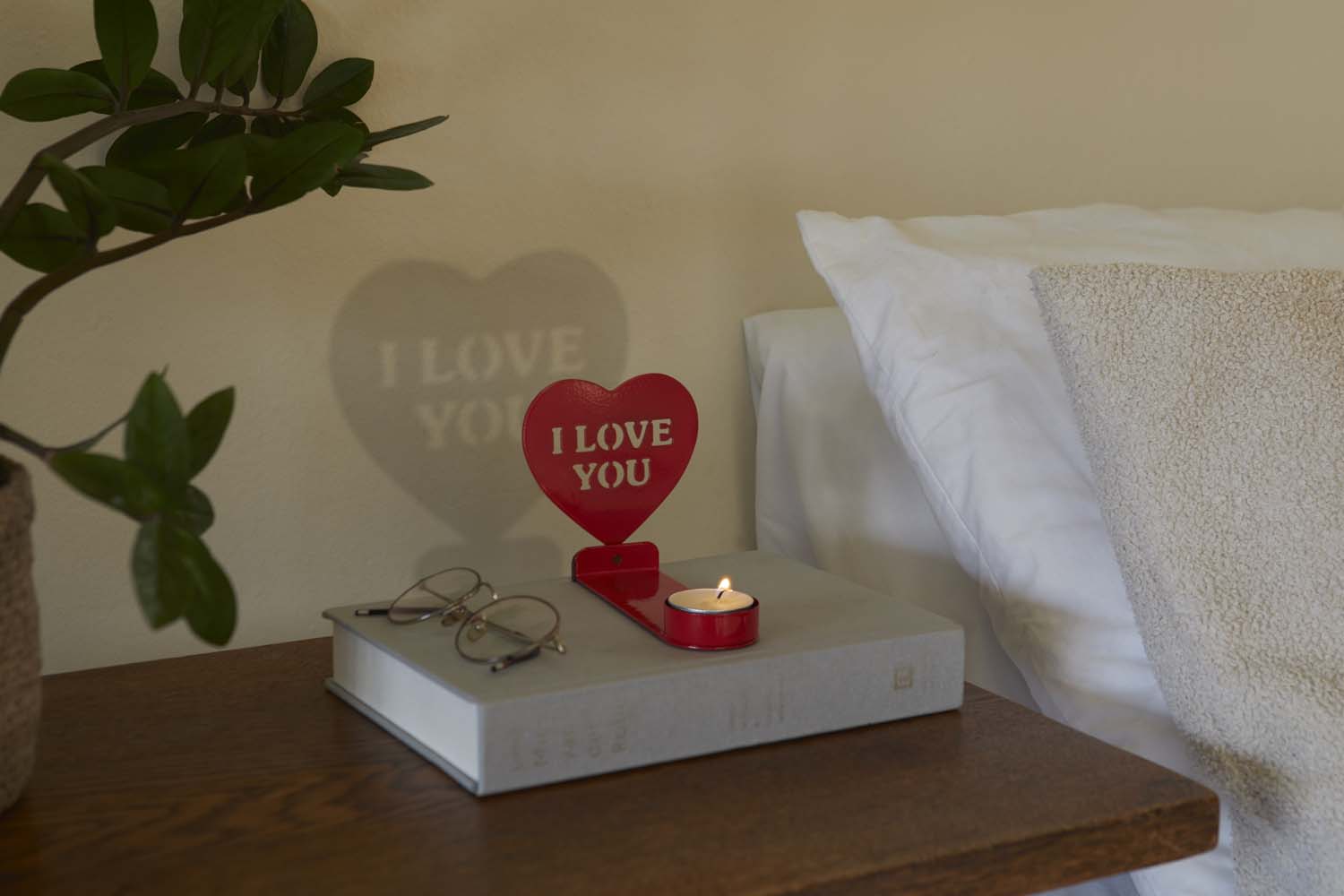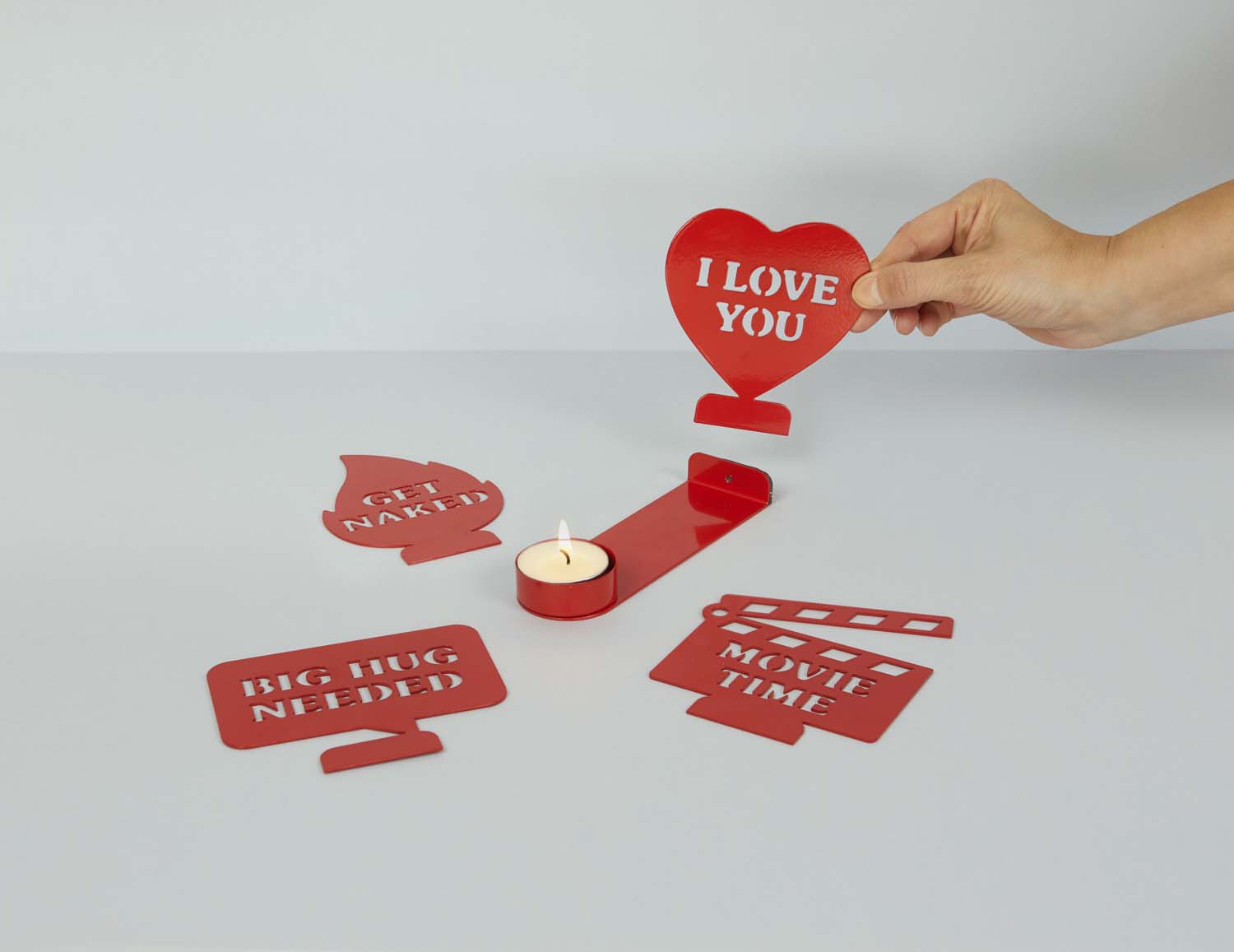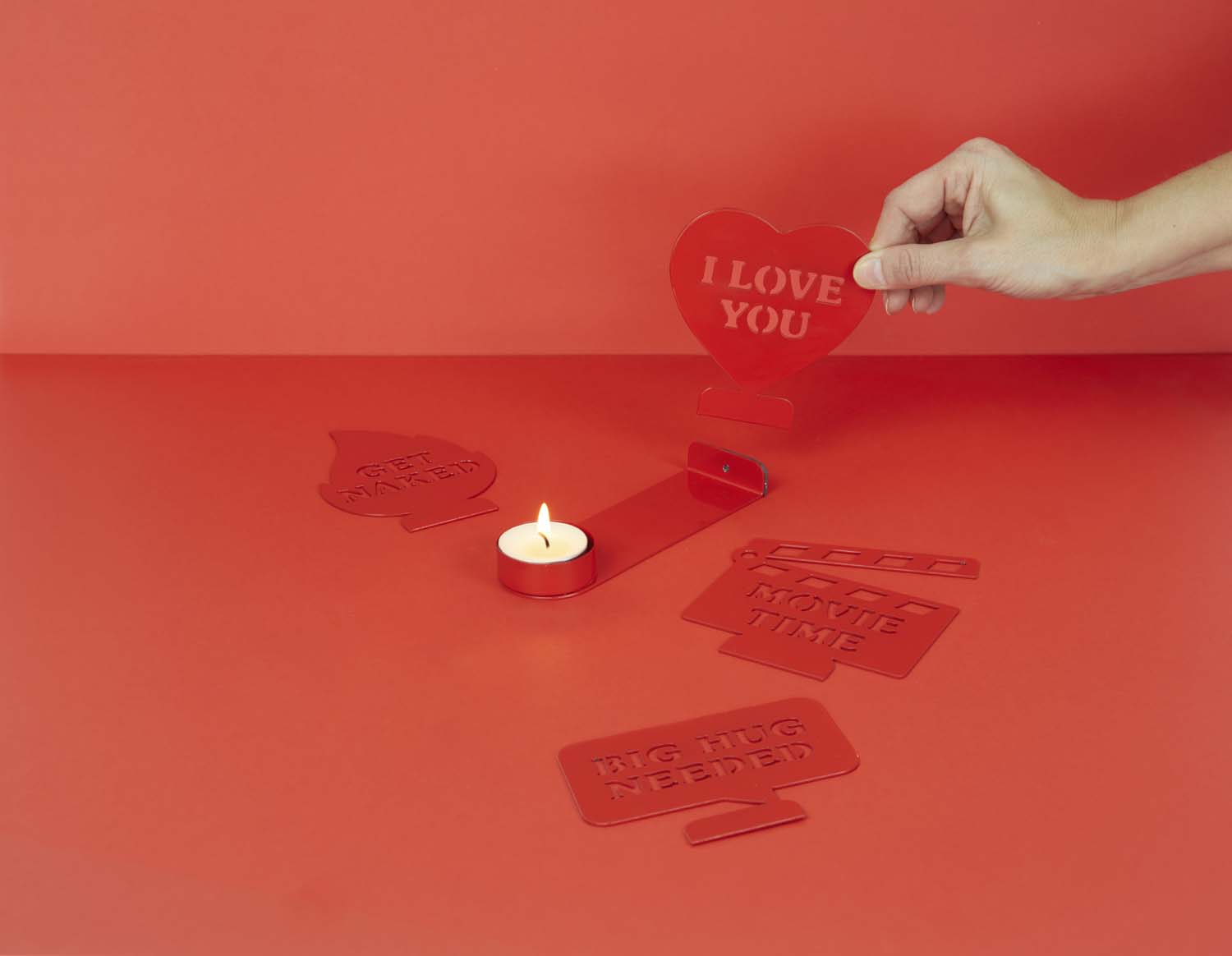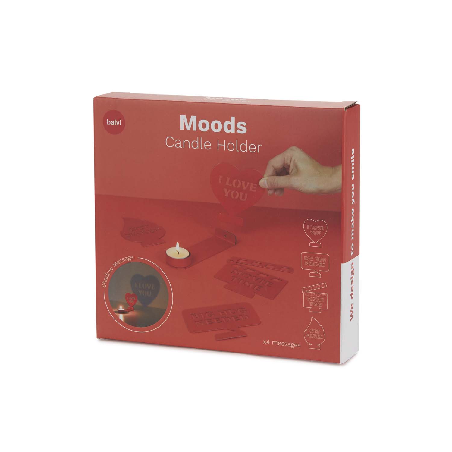 Ljusstake Moods med budskap avslöjade i ljusets sken , Röd Säg det med en låga. När ljuset tänds projicerar hållaren ett meddelande på väggen. En originell detalj som definitivt inte kommer att gå obemärkt förbi. Macgisk effekt. Skapar en varm och speciell atmosfär med budskap som kommer till liv i ljusskenet. Levereras med 1 värmeljus och 4 olika meddelanden med ett magnetiskt system för snabba förändringar beroende på ditt humör. Originalpresent. En detalj full av kreativitet för att överraska (och vinna) den speciella personen när som helst. Mått: 12x10x14 cm Material: metall - Designad av: Balvi