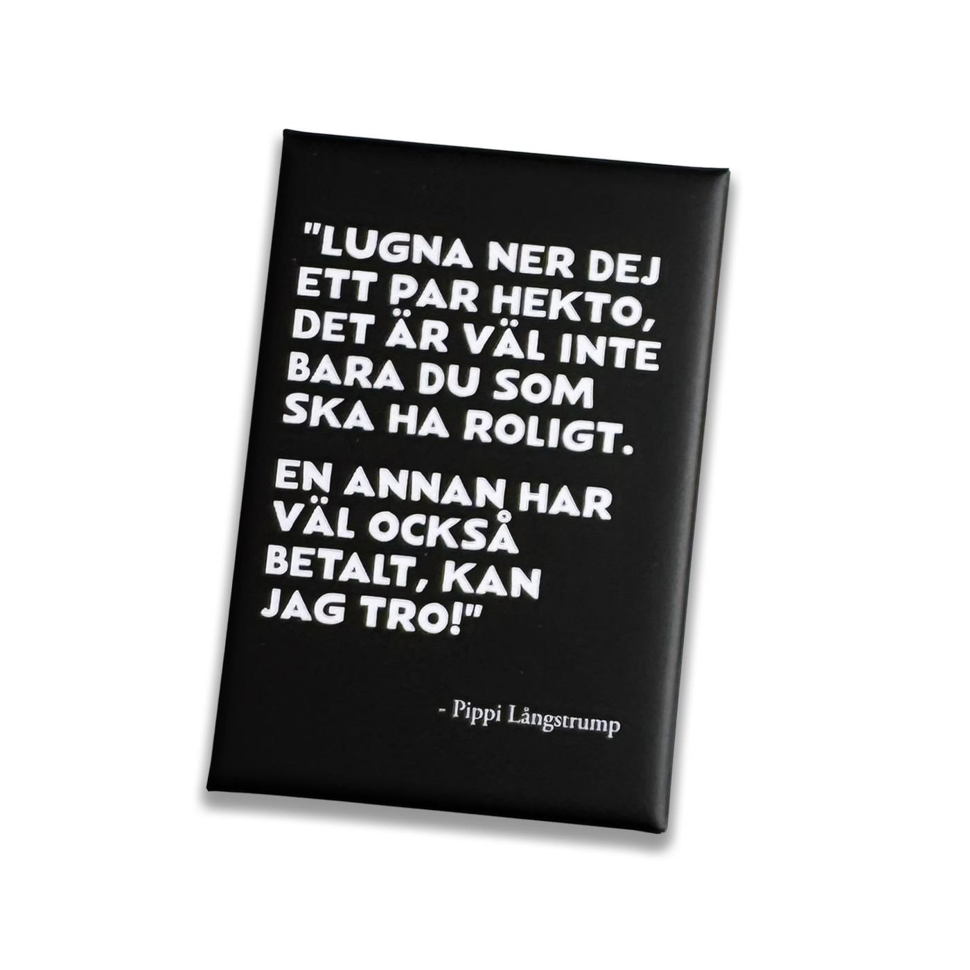 Fin magnet med ett av Pippi Långstrumps mest klassiska citat. "Lugna dig" i svartvitt utförande.