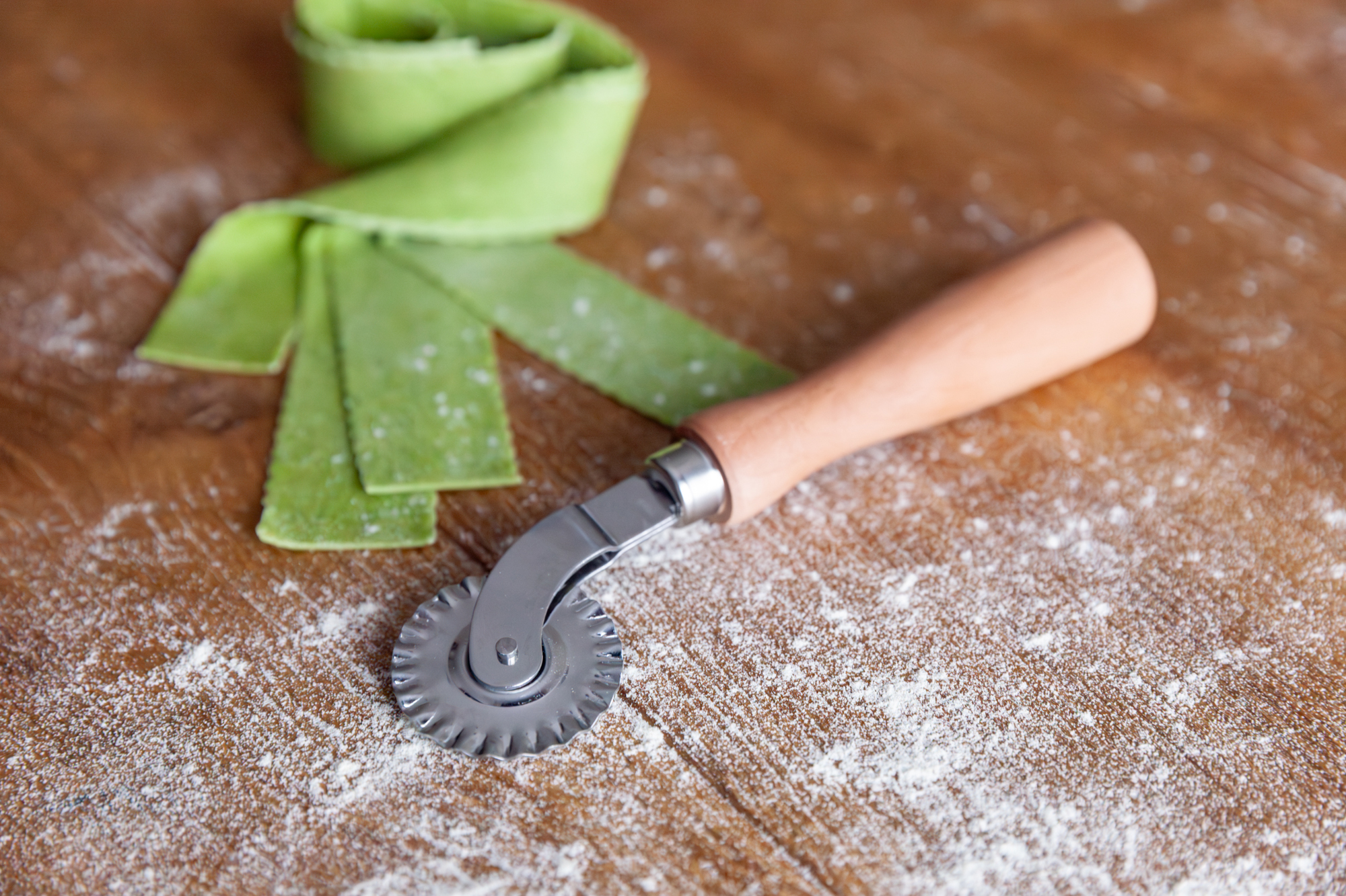 Pastaskärare tillverkade av rostfritt stål och handtag i päronträ från italienska Marcato. Kan användas till pasta eller andra degar.