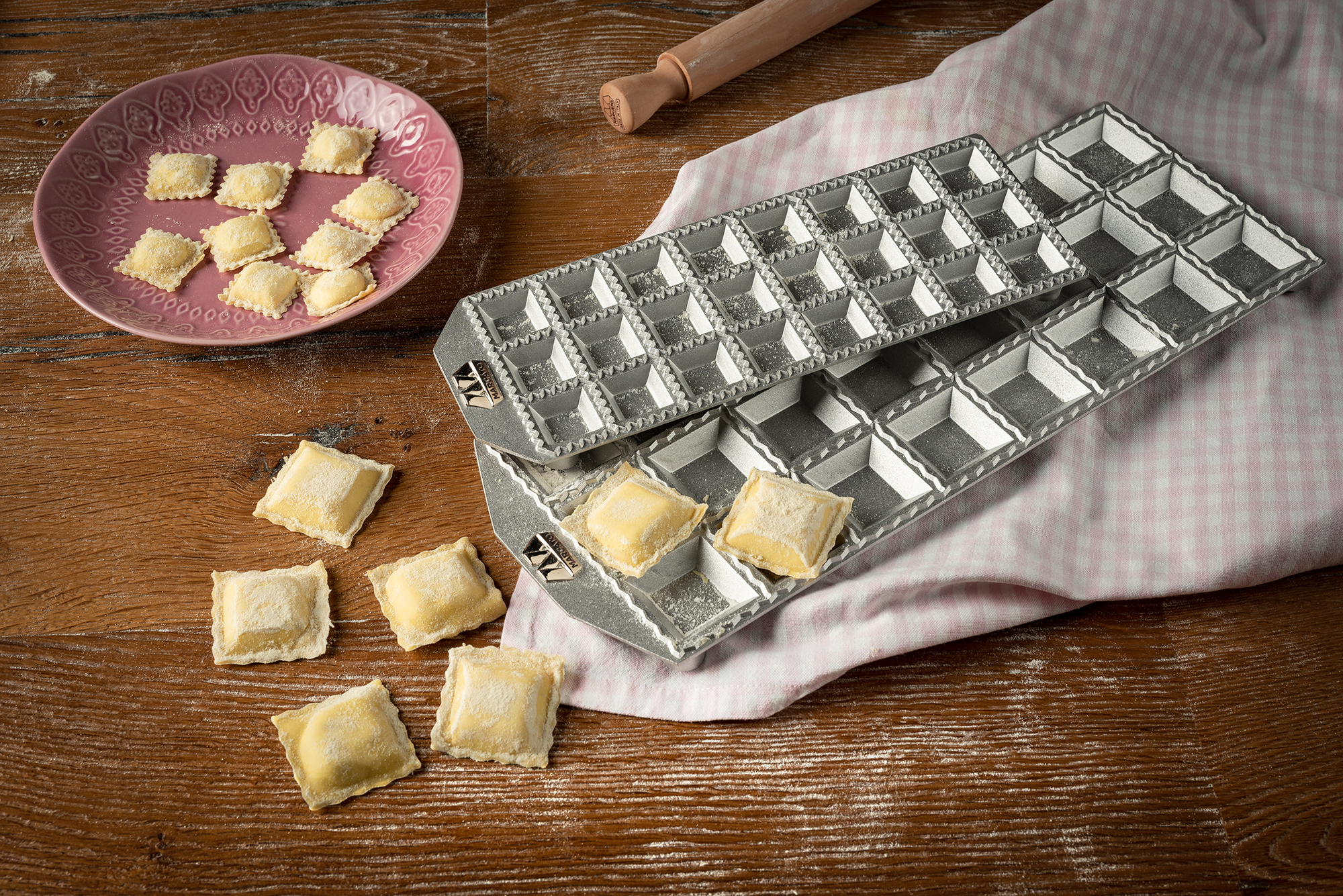 Marcato ravioliplåt inkusive kavel. Formen ger 24 stycken mellanstora kvadratiska ravioli.