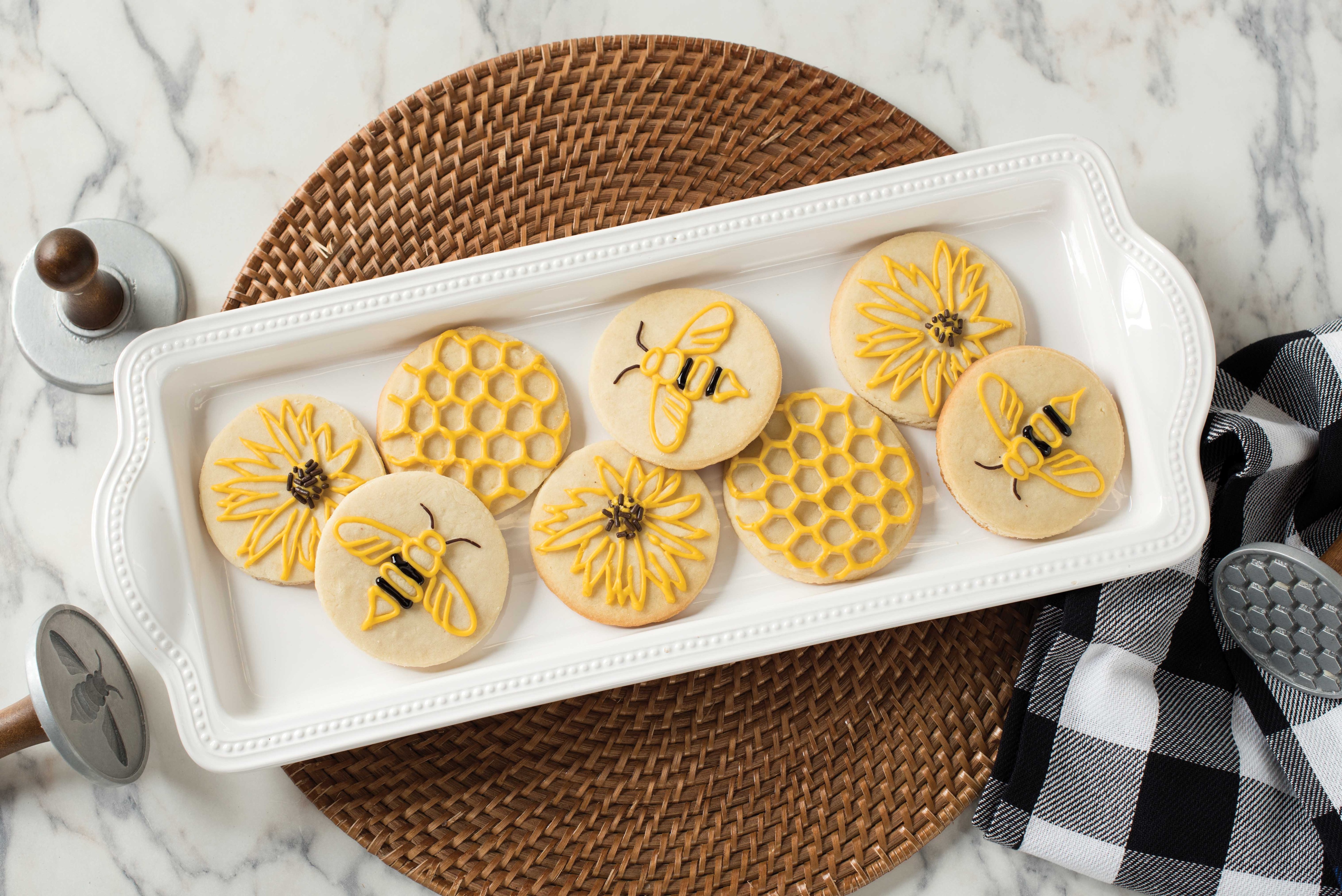 Gör goda kakor med ett vackra bi-mönster. Tre kakstämplar med olika design. Stämplarna är tillverkadei aluminum och har ett stabilt trähandtag som gör det enkelt att trycka ut kakdegen.