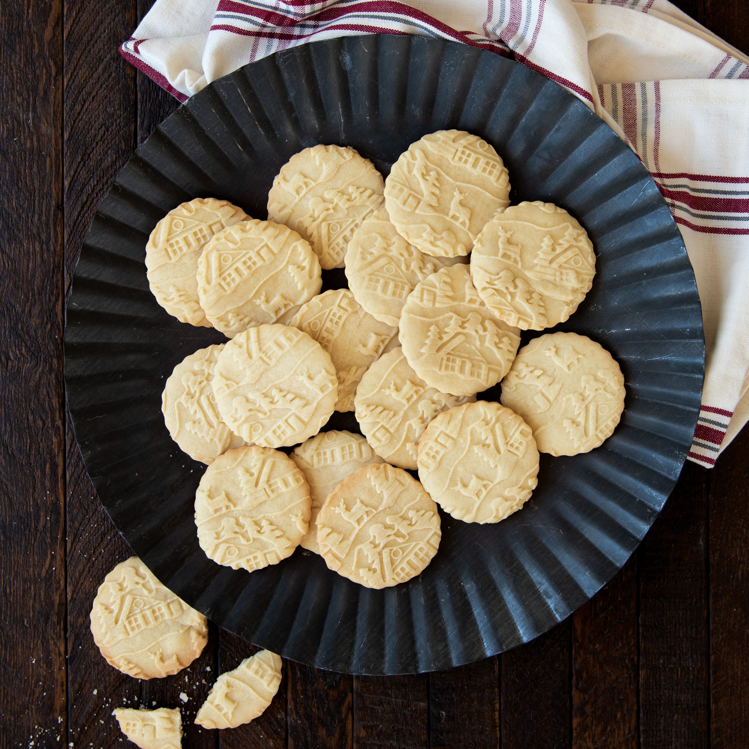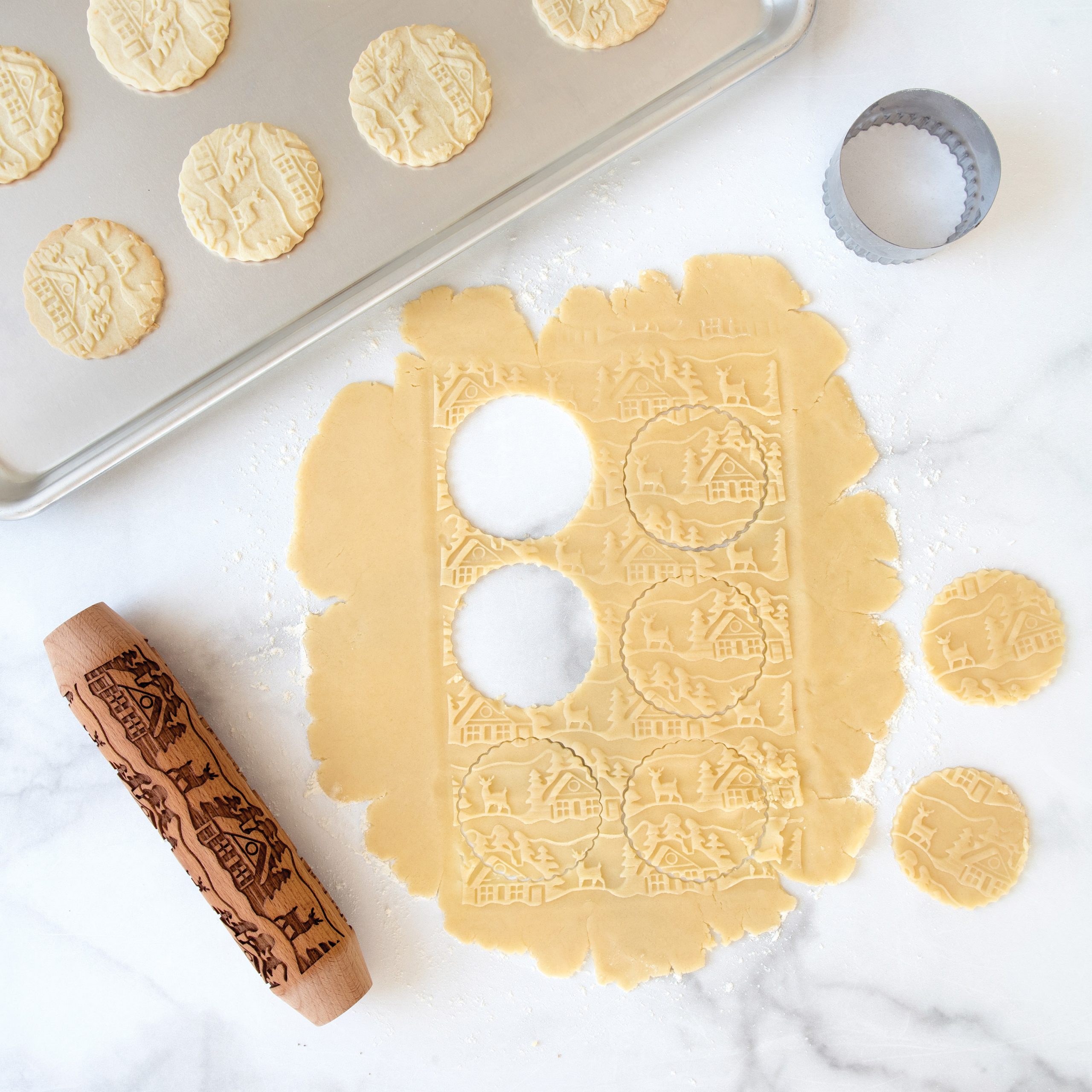En vacker kavel med ett inristat vintrigt mönster av en stuga, granar och rådjur. På ett enkelt sätt får man ett vackert mönster på sina kakor.