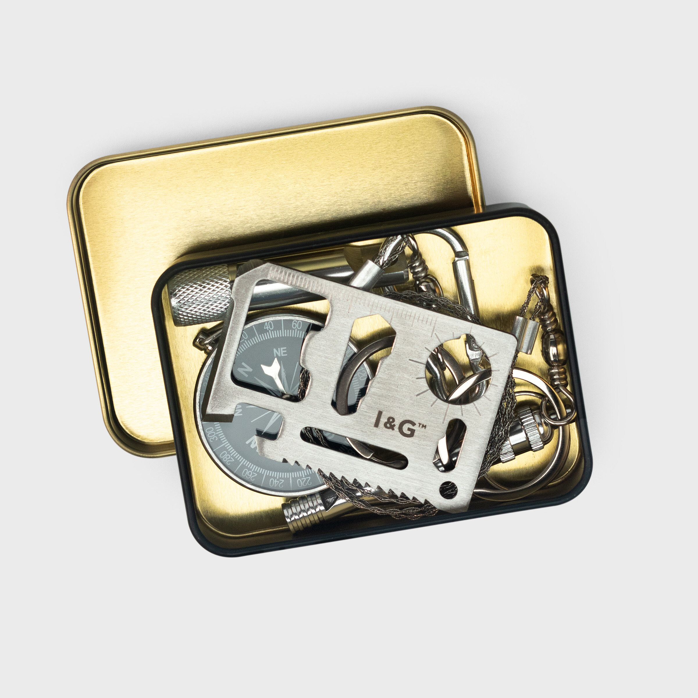 Femdelars överlevnadsset, inklusive multiverktyg, trådsåg, kompass, nyckelring med visselpipa och ficklampa.