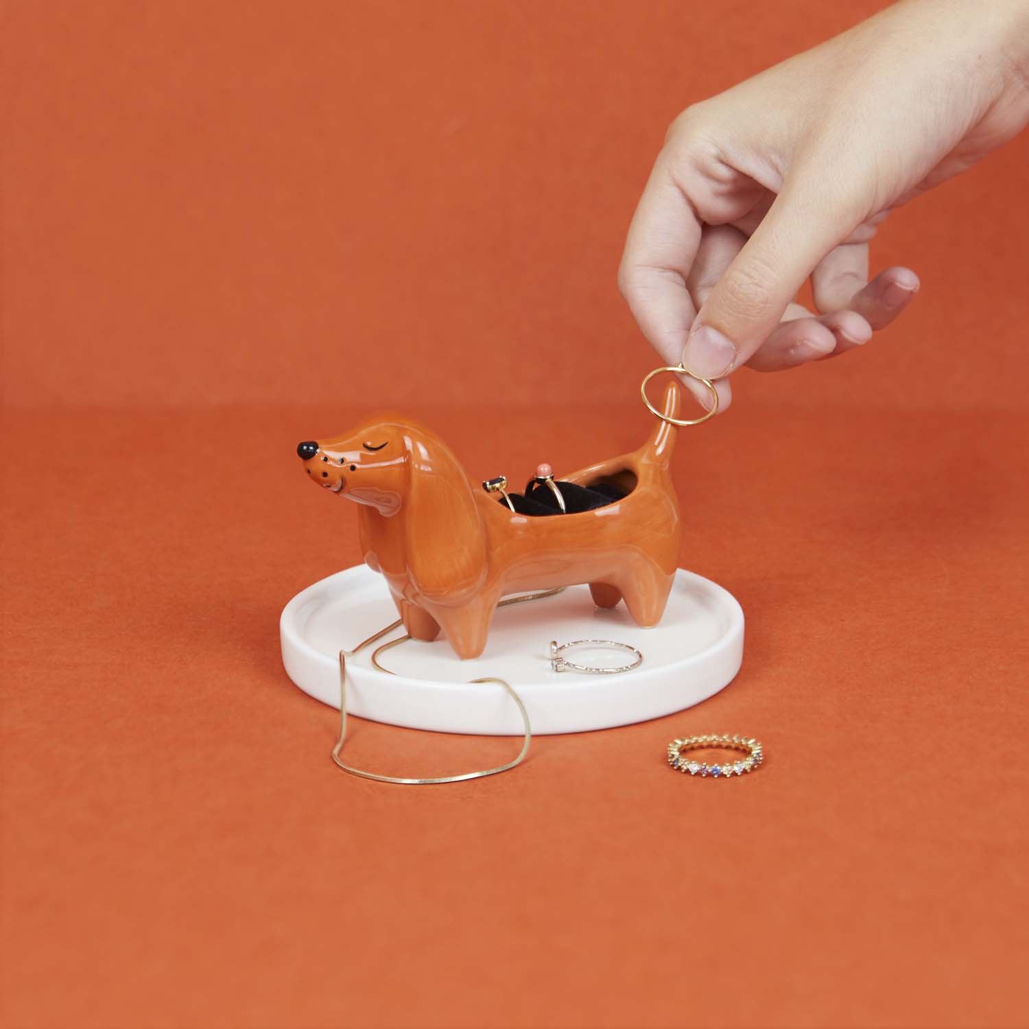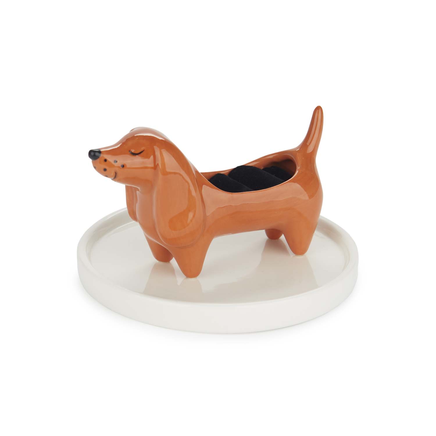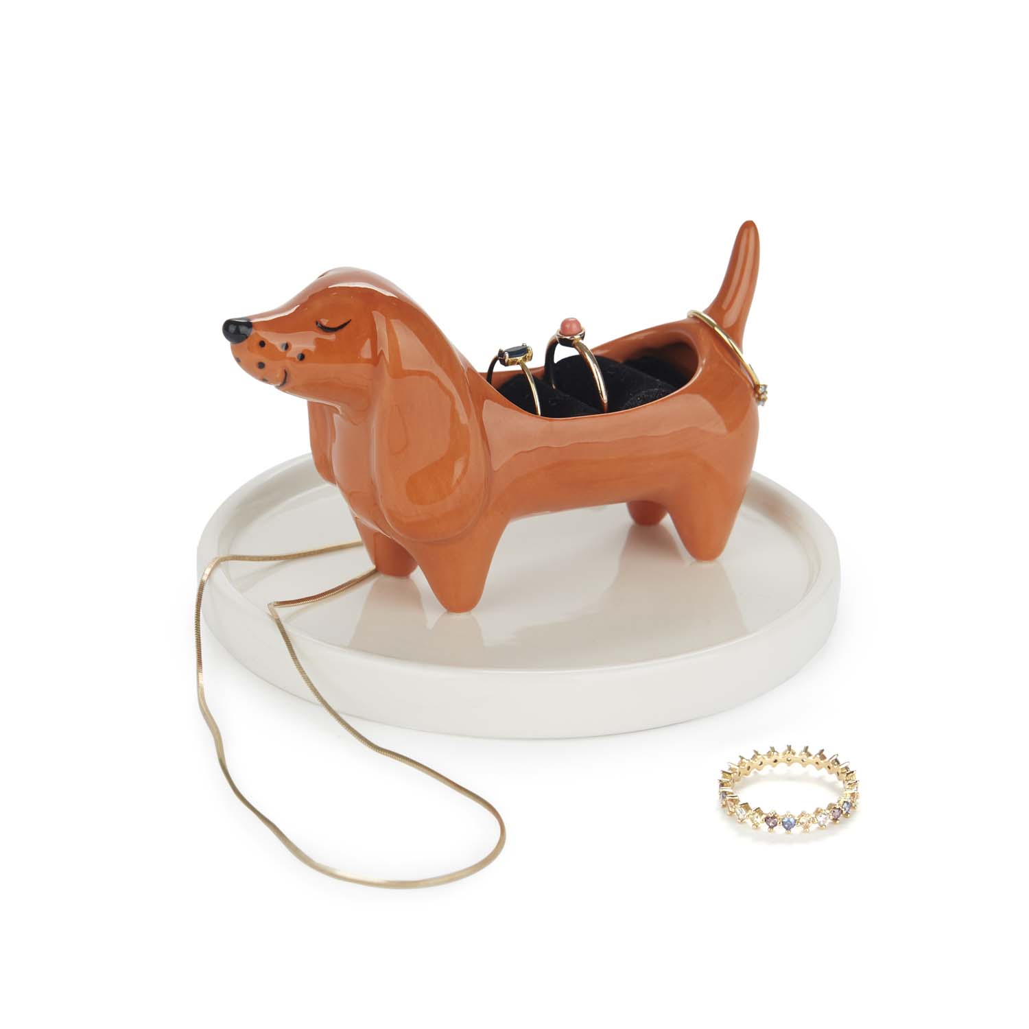 Den mest trogna följeslagaren... för dina smycken. Denna ringhållare i form av en tax med bricka håller dina ringar, örhängen och halsband snyggt organiserade och alltid inom räckhåll. Perfekt för att lägga ifrån dig dina smycken när du kommer hem eller välja morgondagens look – med en dekorativ touch som garanterat får dig att le.