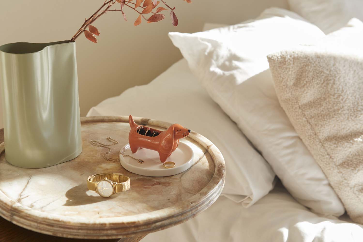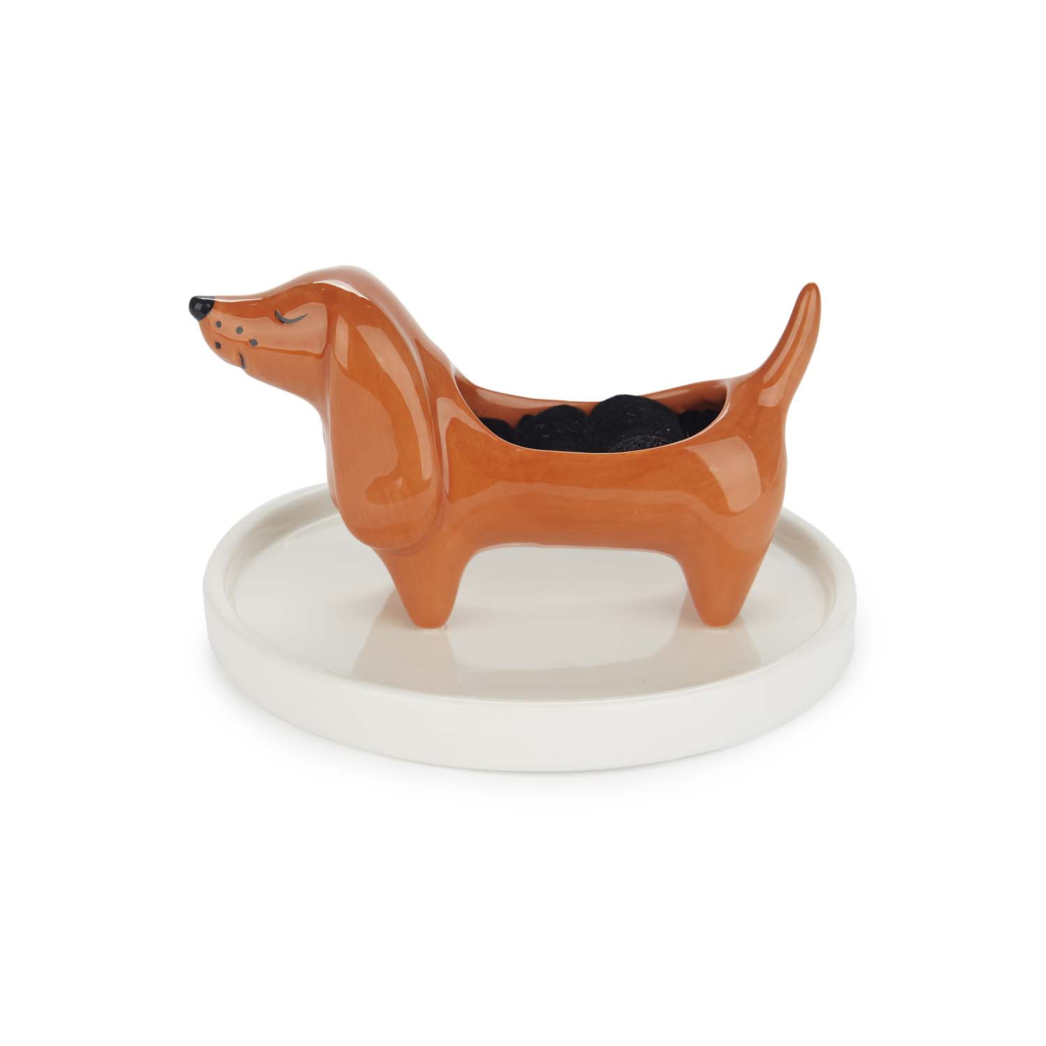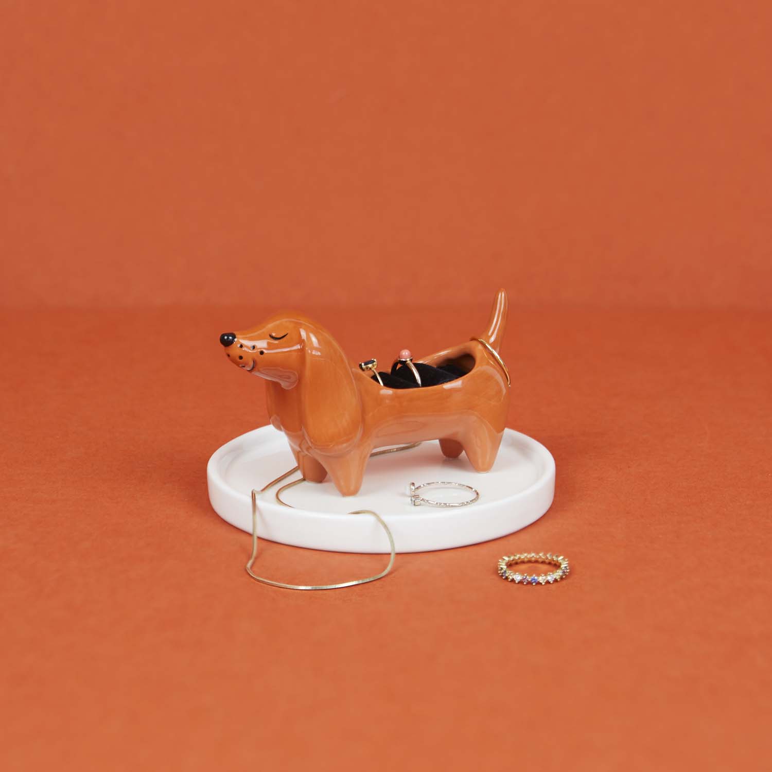 Den mest trogna följeslagaren... för dina smycken. Denna ringhållare i form av en tax med bricka håller dina ringar, örhängen och halsband snyggt organiserade och alltid inom räckhåll. Perfekt för att lägga ifrån dig dina smycken när du kommer hem eller välja morgondagens look – med en dekorativ touch som garanterat får dig att le.
