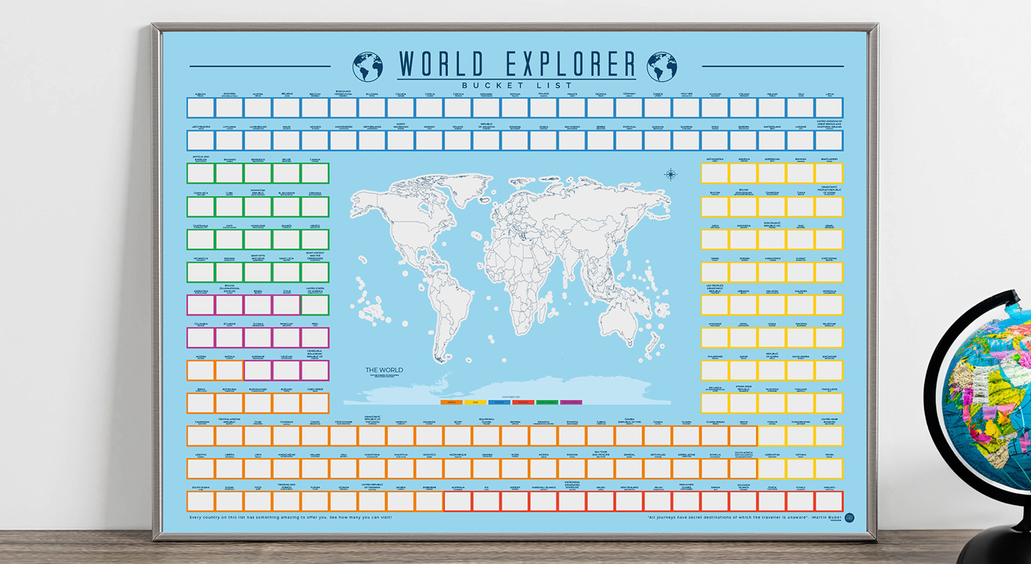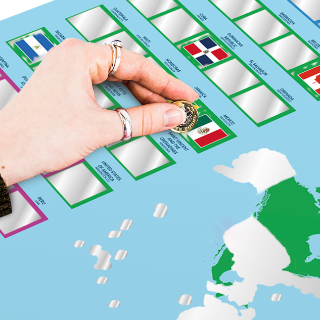 Varje gång du besöker ett nytt land skrapar du helt enkelt bort motsvarande område på postern för att visa den livfulla flaggillustrationen under.