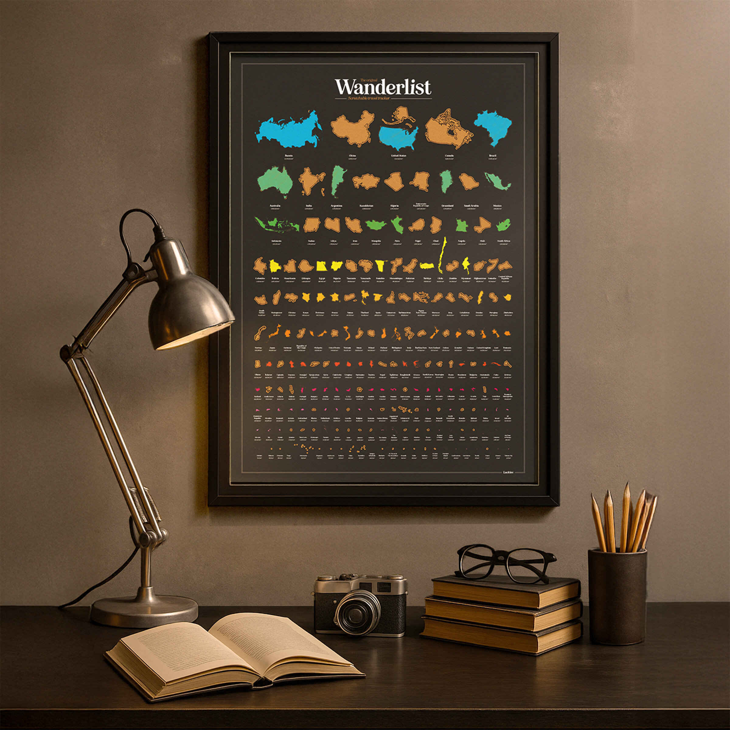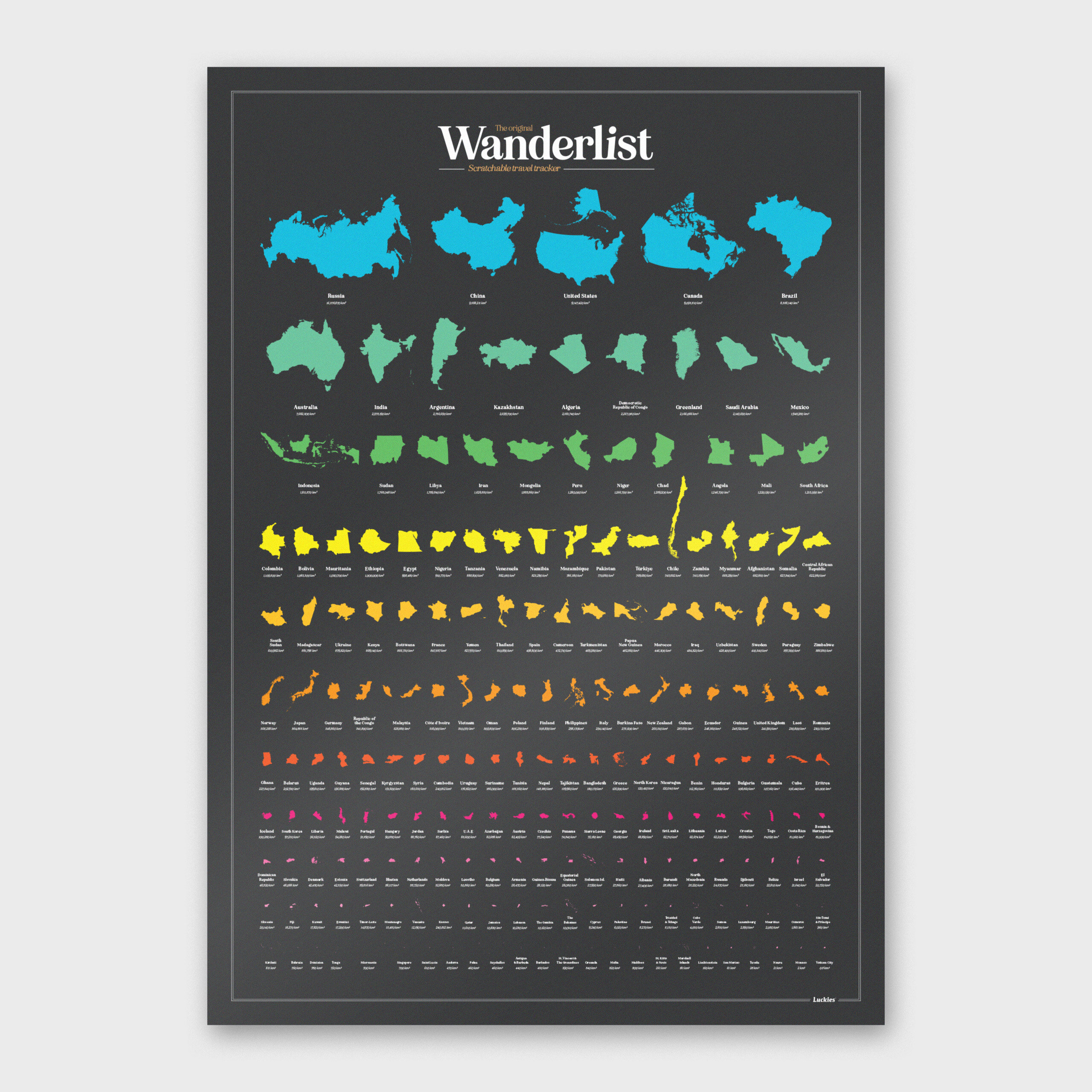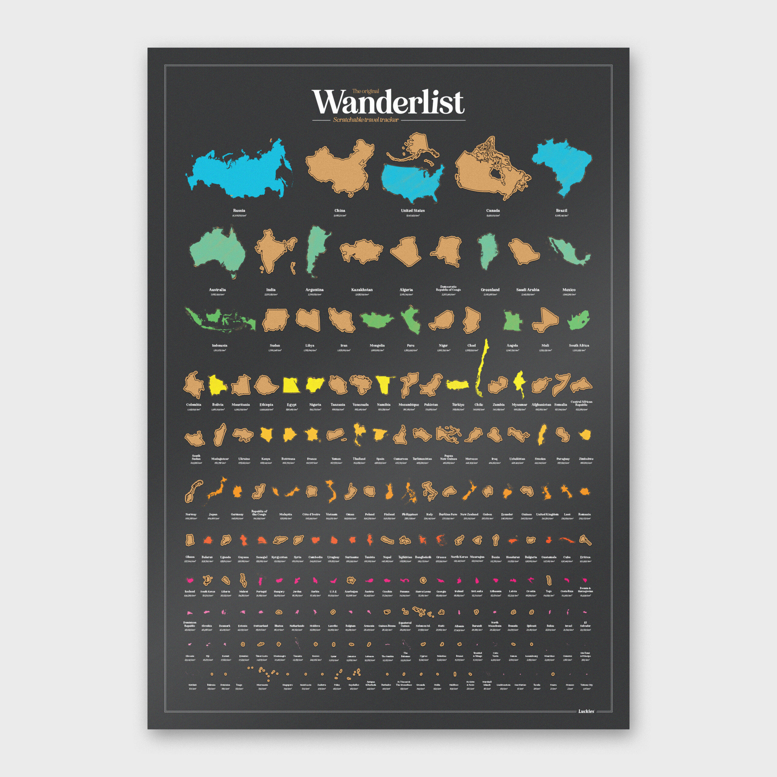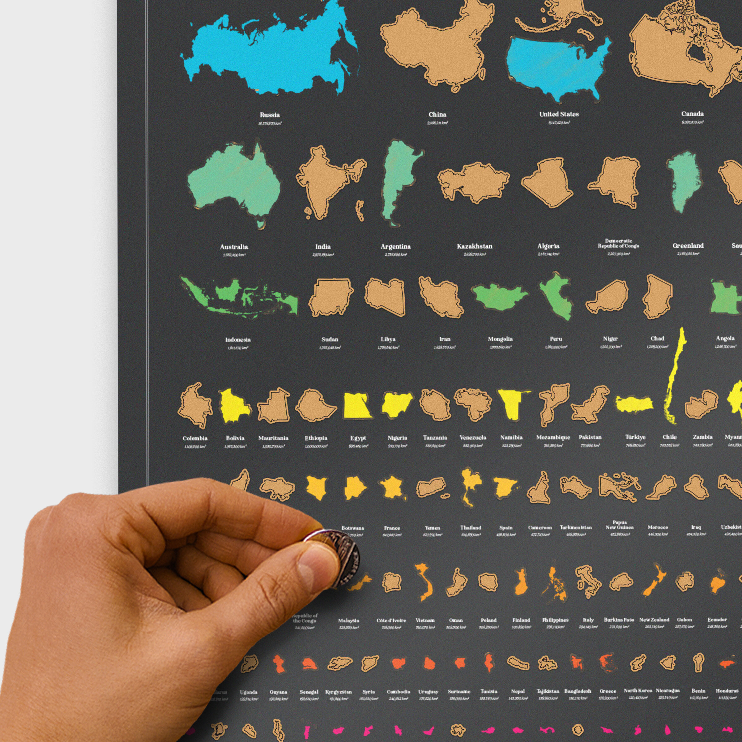Skrapa av där du har varit! Affisch som kan skrapas. 197 länder och territorier – Sorterade efter total landyta. Kartans storlek: 420 mm x 594 mm / 16,5 tum x 23,3 tum Den smutsiga av alla bucket lists. Besök alla länder i världen och skrapa av varje plats du har varit. Land för land. Du behöver inte besöka dem i storleksordning, men vi har arrangerat vår affisch så, eftersom den ser fantastisk ut.