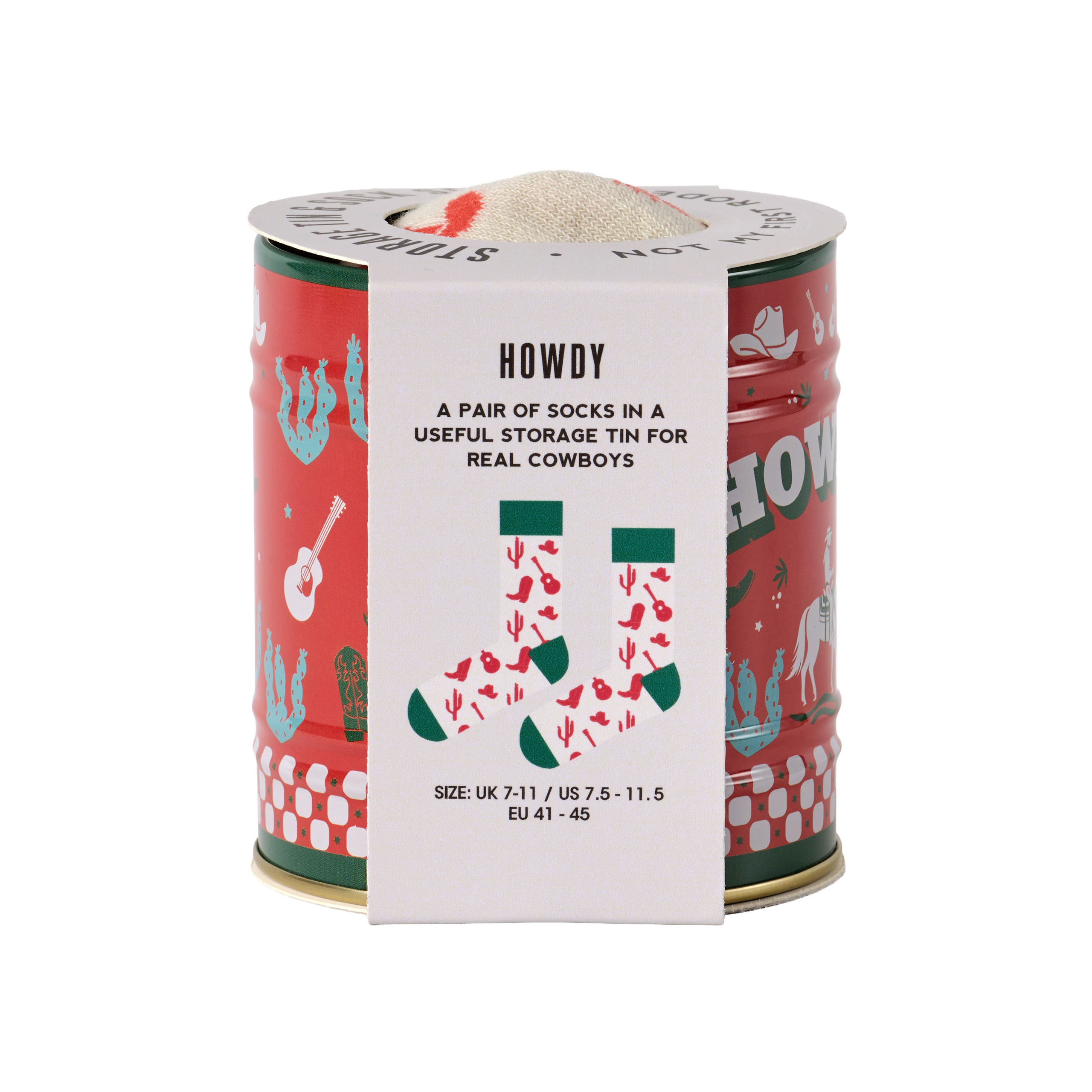 Kliv in i stilen med detta par västerninspirerade strumpor, prydligt instoppade i en praktisk förvaringsburk i plåt. En lekfull present till alla som älskar "a howdy good time". Plåtstorlek: 85 x 92 mm x 855 mm Strumpstorlek: UK: 7-11 / EU: 41-45 En rolig samling av tematiska ekologiska strumpor, var och en instoppad i sin egen användbara förvaring Plåt. Från hobbyer till guilty pleasures finns det ett par som passar varje humör – perfekt för gåvor eller samling.