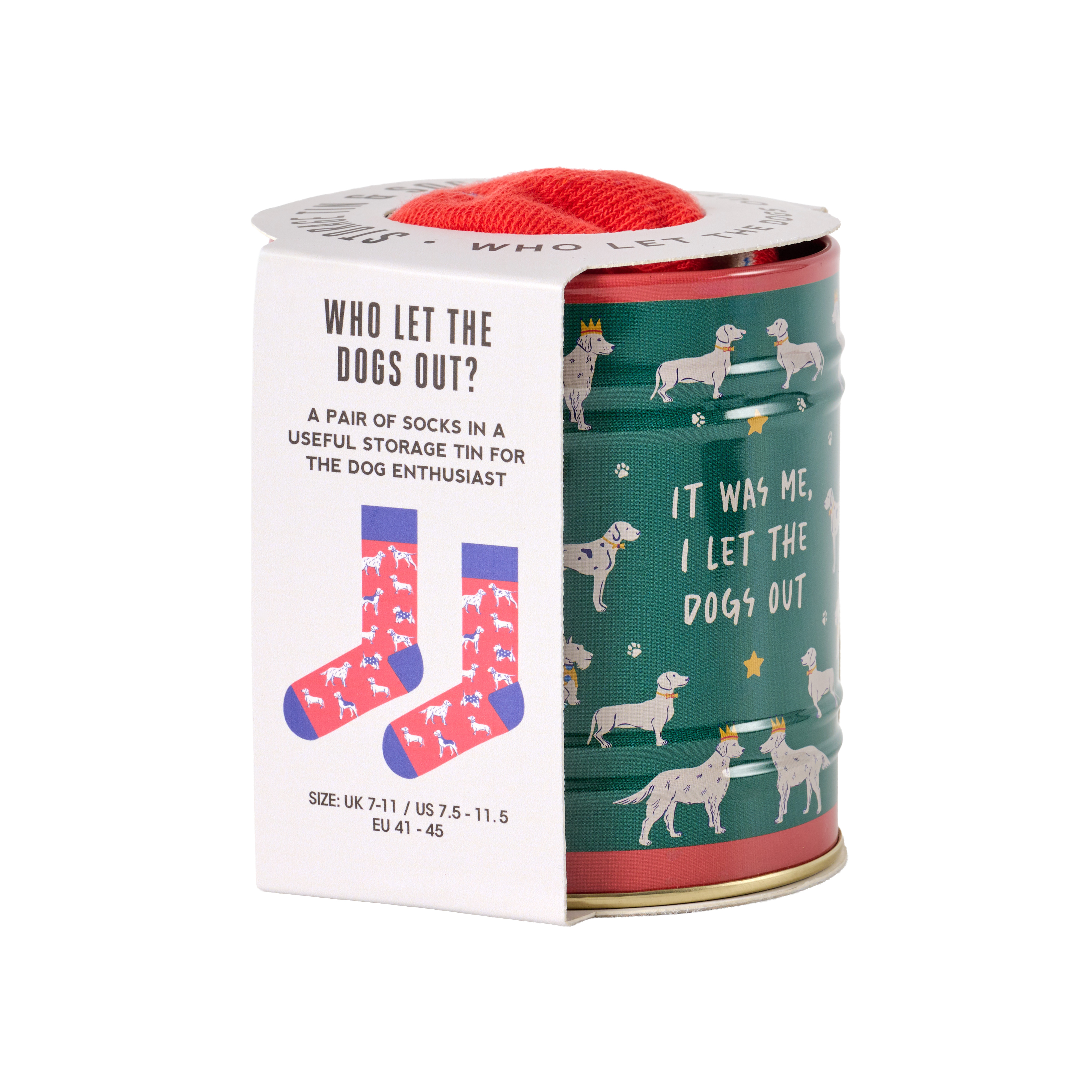 Släpp loss din stil med detta par hundinspirerade strumpor, prydligt instoppade i en praktisk förvaringburk i plåt. En svansviftande present till alla hundälskare. Strumpstorlek: UK: 7-11 / EU: 41-45 Mönstrad plåtburk: 85 x 92 mm x 85 mm En rolig samling av tematiska ekologiska strumpor, var och en instoppad i sin egen användbara förvaringsburk. Från hobbyer till guilty pleasures finns det ett par som passar varje humör – perfekt som present eller att ha som en samling.
