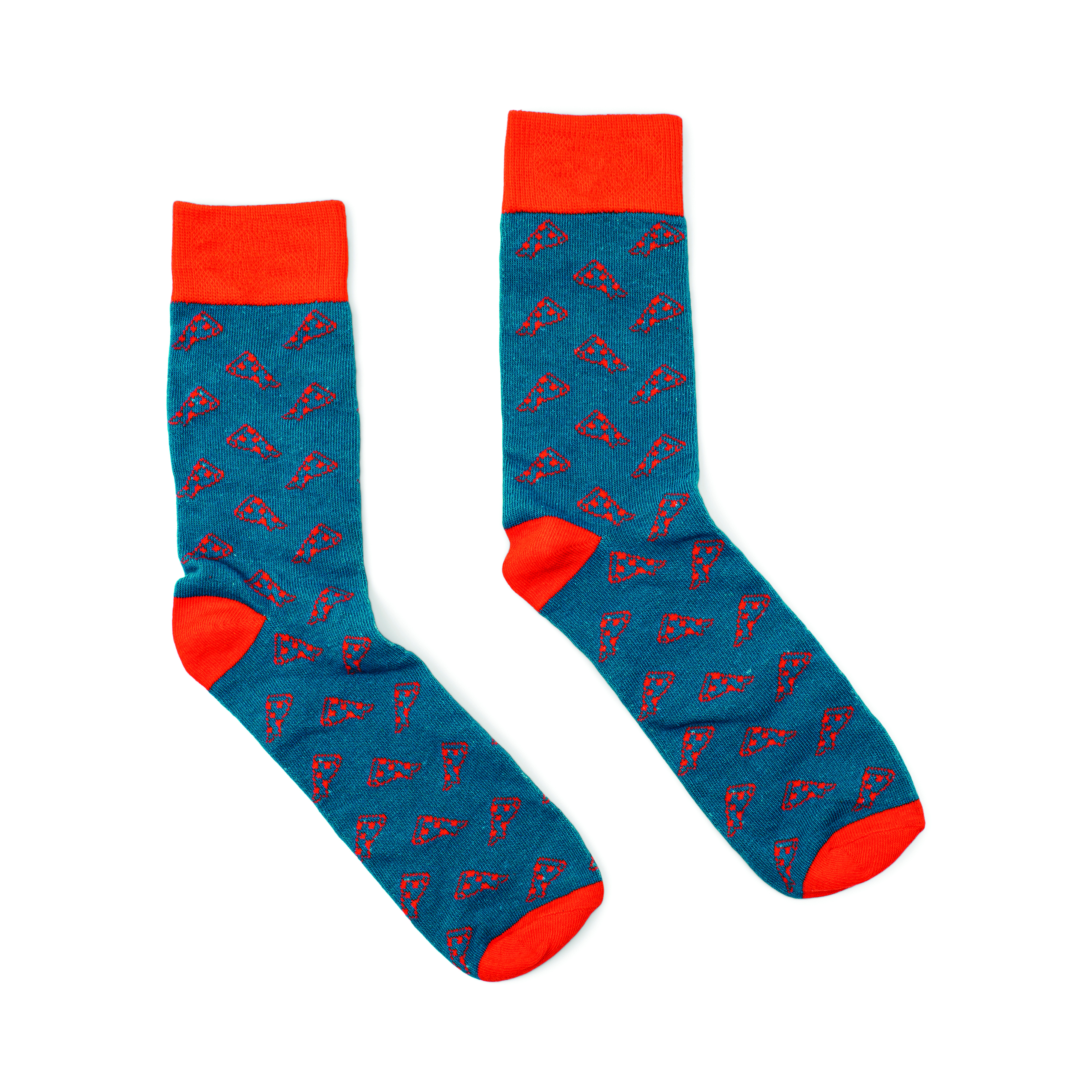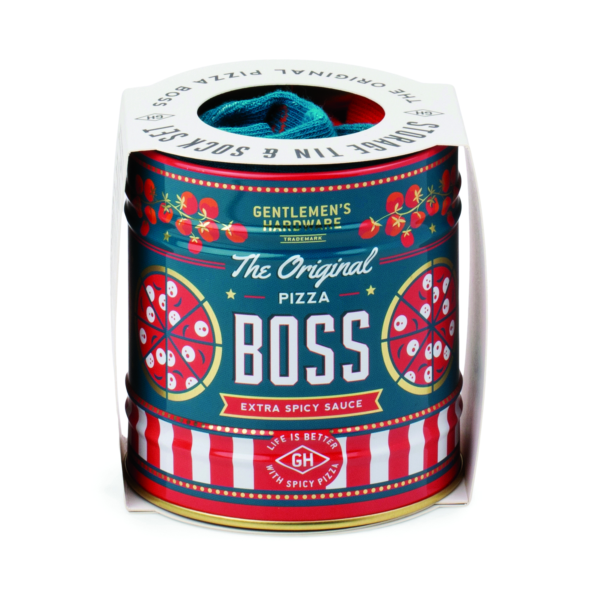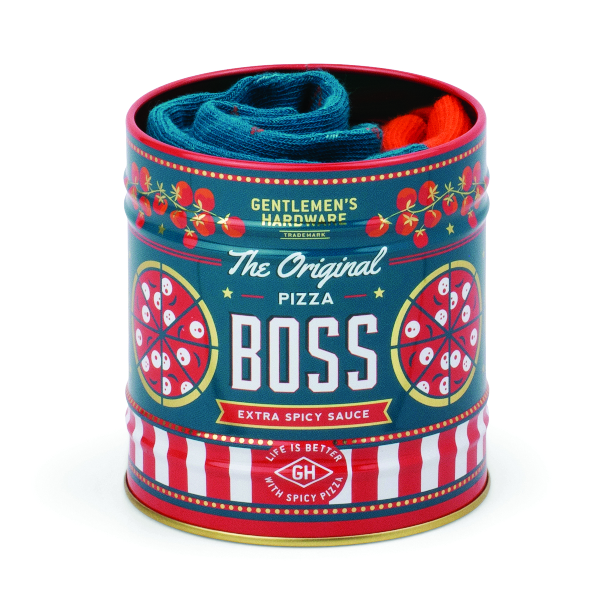 Ett par strumpor i en praktisk förvaringsburk för pizzaälskare.