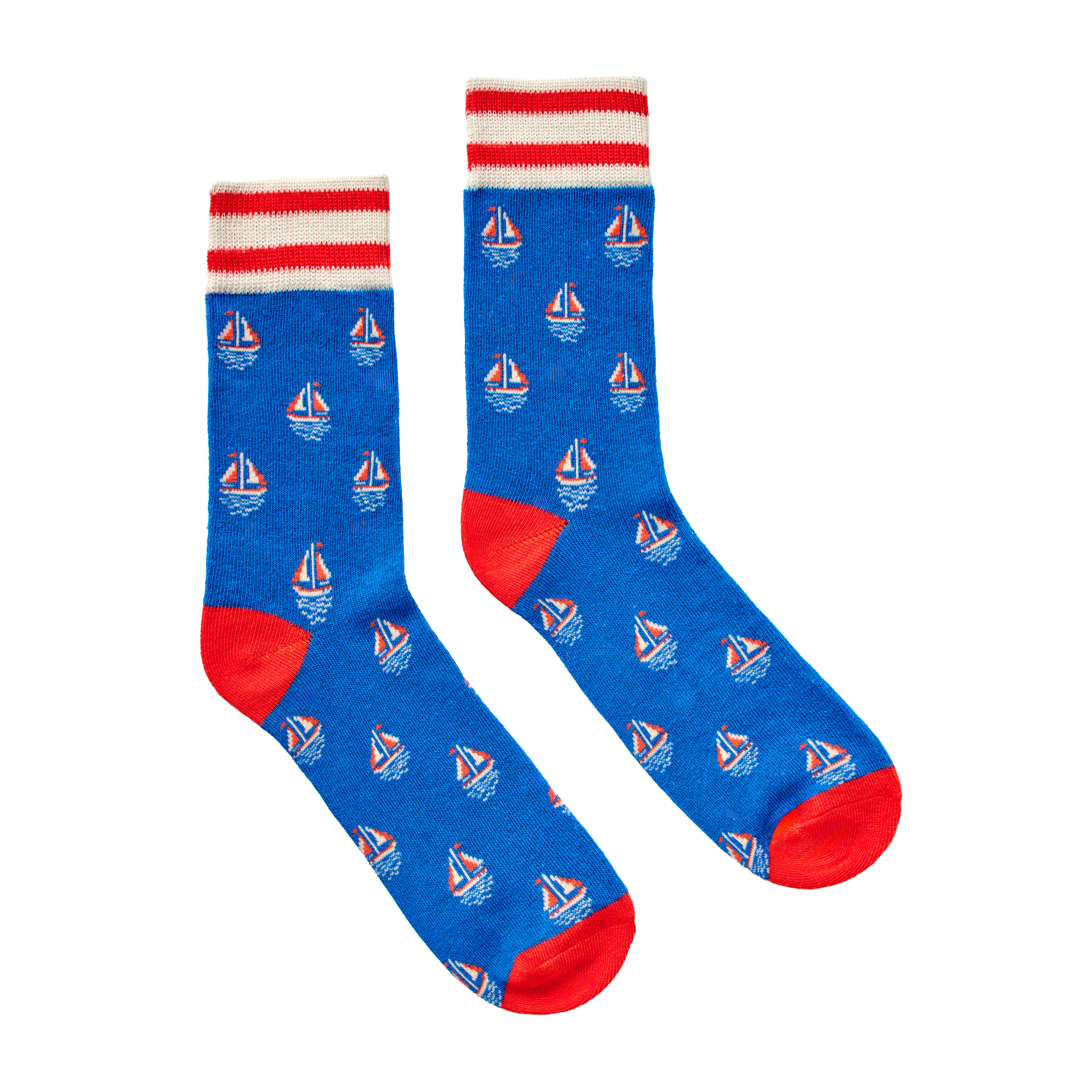 Sätt segel med stil med detta par seglingsinspirerade strumpor, prydligt instoppade i en praktisk förvaringsburk i plåt. En perfekt present till havsäventyraren. Strumpstorlek: UK: 7-11 / EU: 41-45 Mönstrad plåtburk: 85 x 92 mm x 85 mm En rolig samling av tematiska ekologiska strumpor, var och en instoppad i sin egen användbara förvaringsburk. Från hobbyer till guilty pleasures finns det ett par som passar varje humör – perfekt som present eller att ha som en samling.