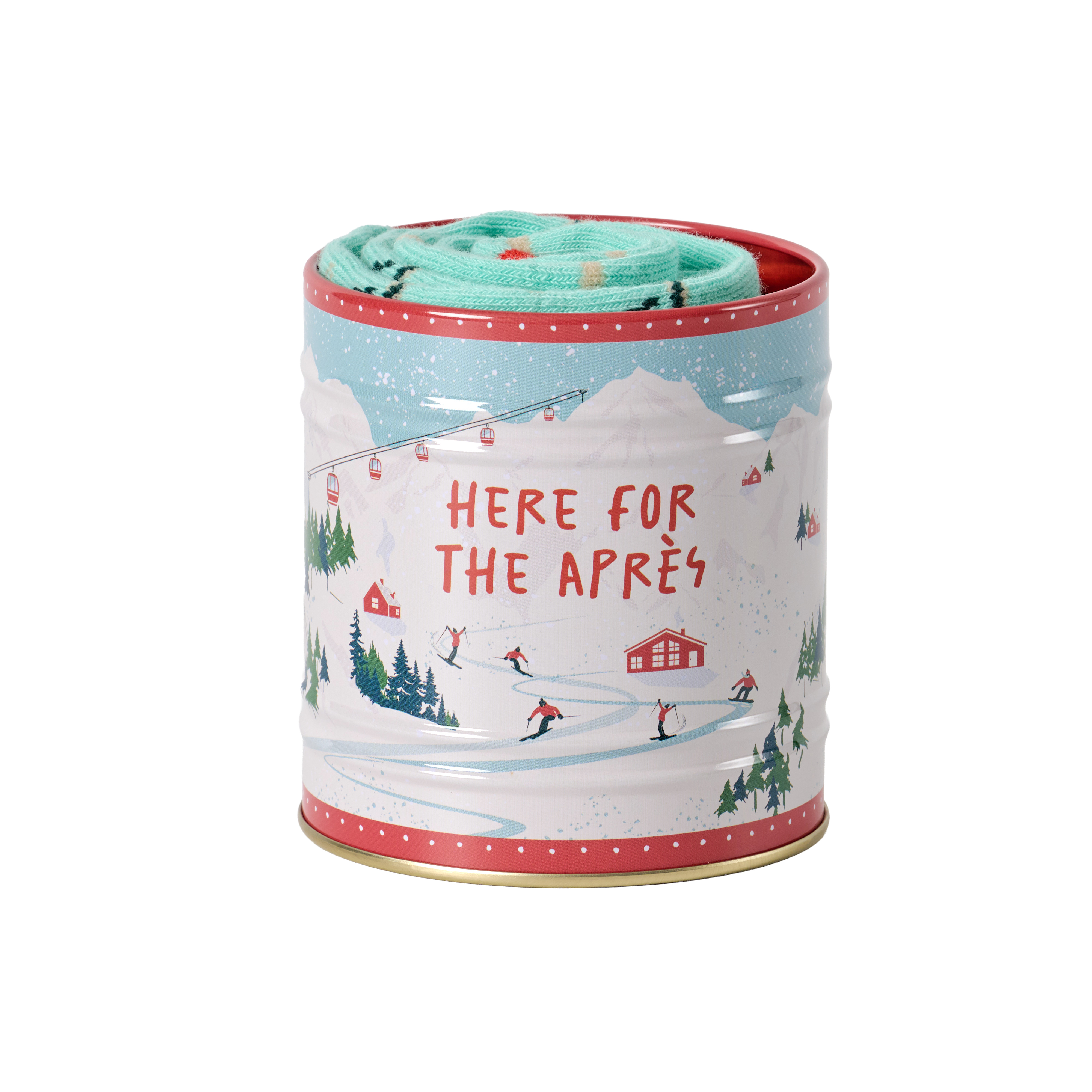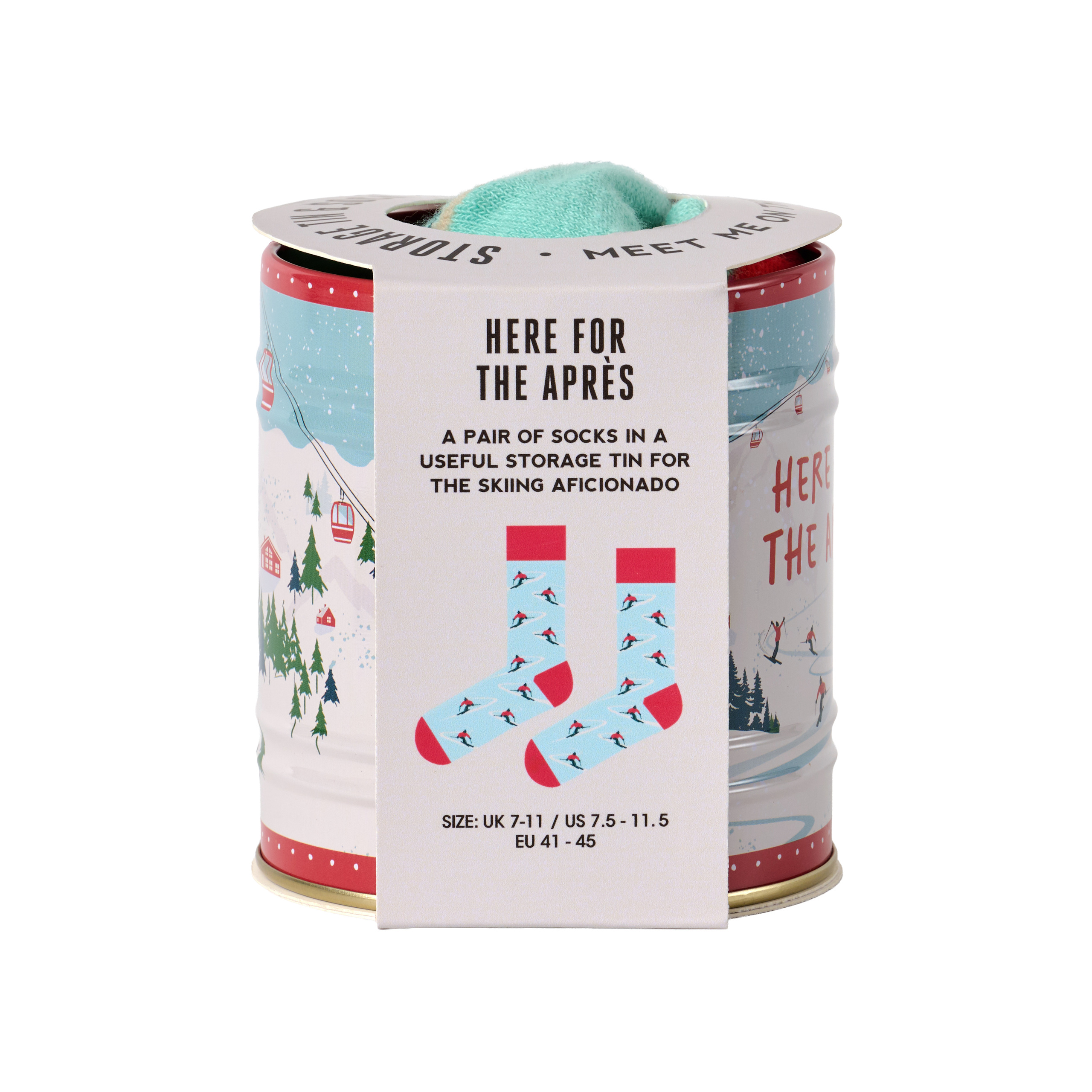 Ge dig ut i backarna med stil med detta par skidinspirerade strumpor, prydligt instoppade i en praktisk förvaringsburk i plåt. En perfekt present till snöälskaren. Strumpstorlek: UK: 7-11 / EU: 41-45 Mönstrad plåtburk: 85 x 92 mm x 85 mm En rolig samling av tematiska ekologiska strumpor, var och en instoppad i sin egen användbara förvaringsburk. Från hobbyer till guilty pleasures finns det ett par som passar varje humör – perfekt som present eller att ha som en samling.