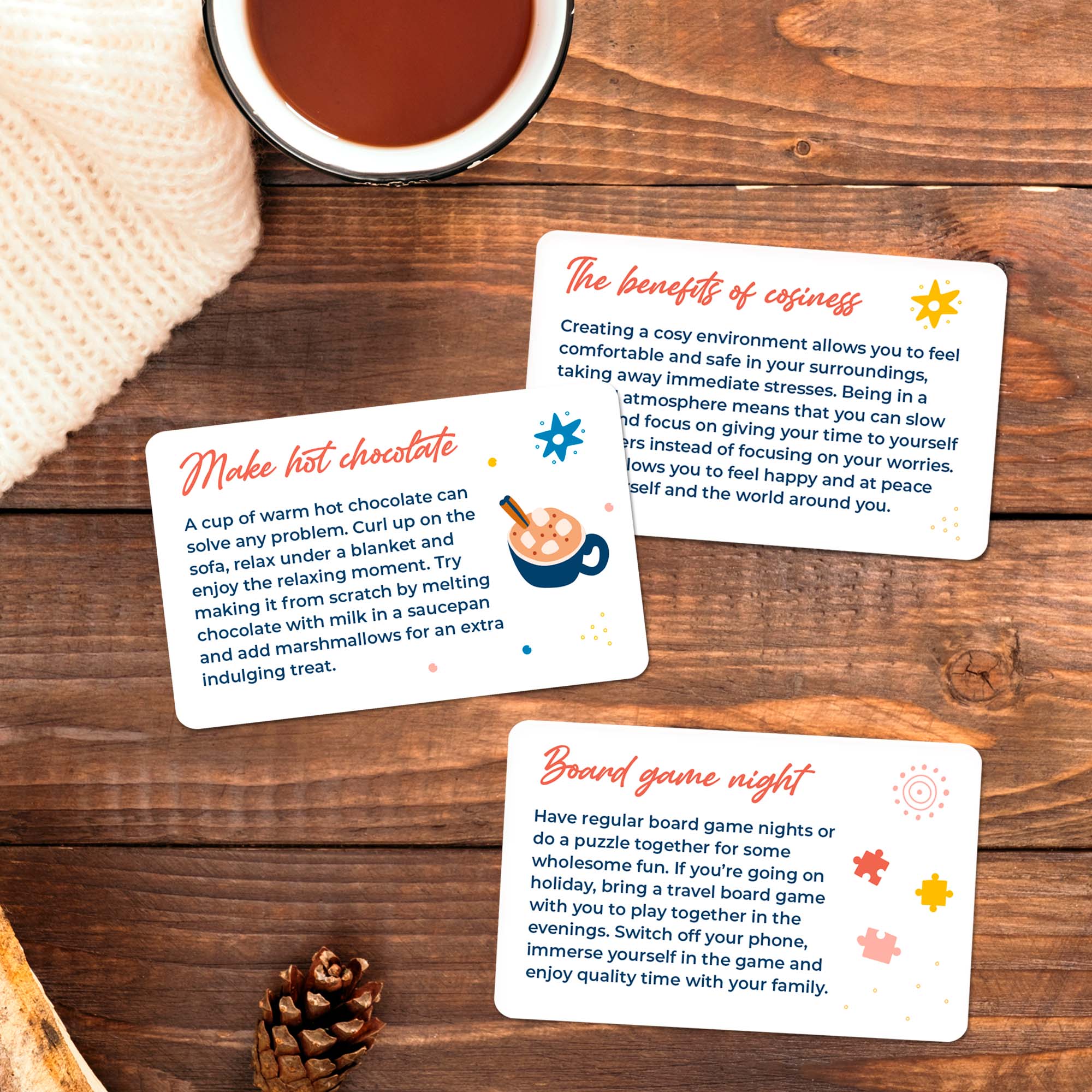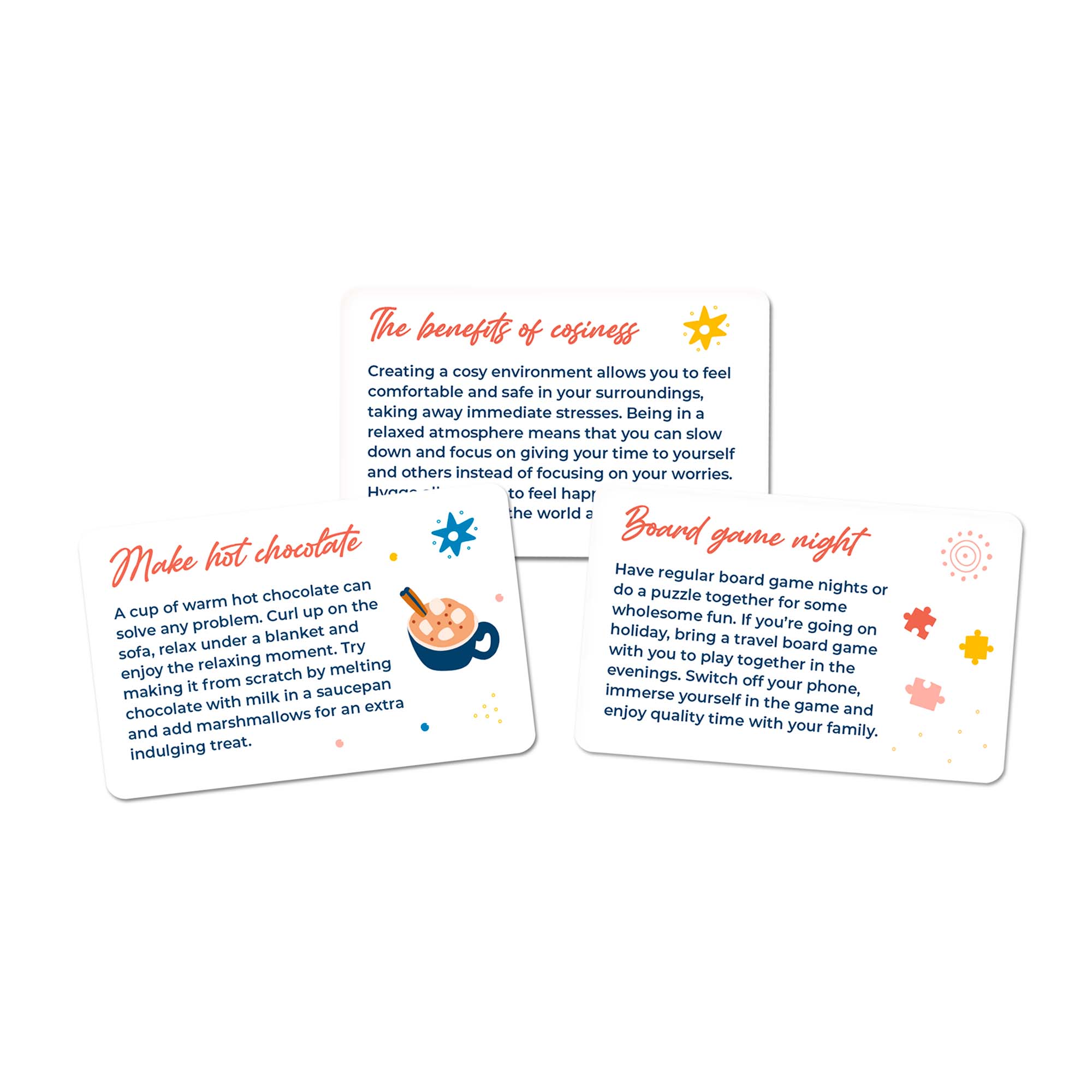 Ta på dig din stickade tröja och dina mysiga tofflor, tänd ditt favoritljus och njut av stunden med hjälp av hygge. Denna kortlek med 100 kort ger dig hygge-tips på hur du kan leva ett lyckligare och mysigare liv.