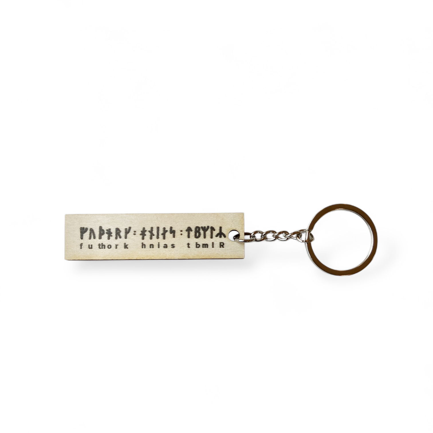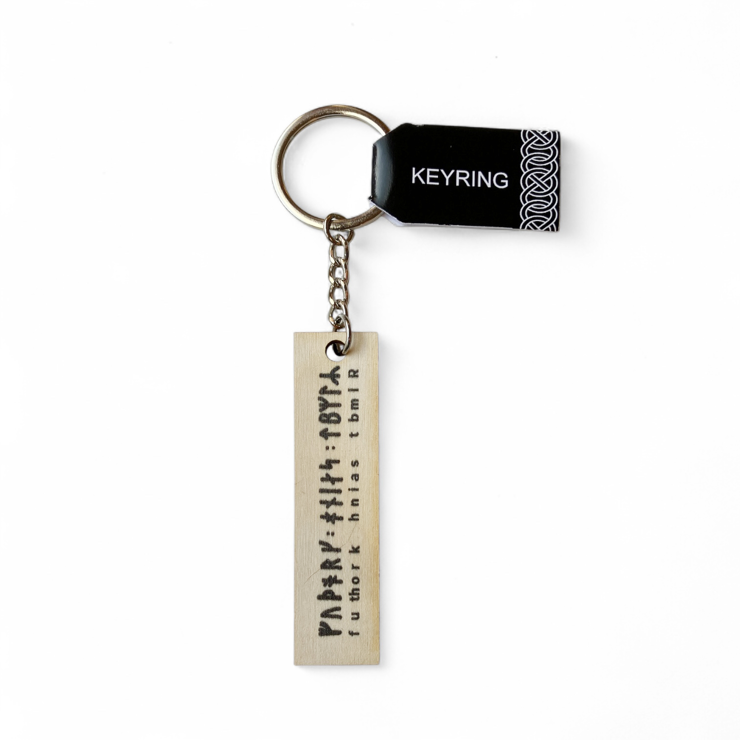 Bär med dig ett stycke Nordisk mystik. Rektangular nyckelring i trä med motiv föreställande den Yngre Fuuthark- den nordiska runraden som användes av vikingarna under deras storhetstid. Tillverkad i UK.